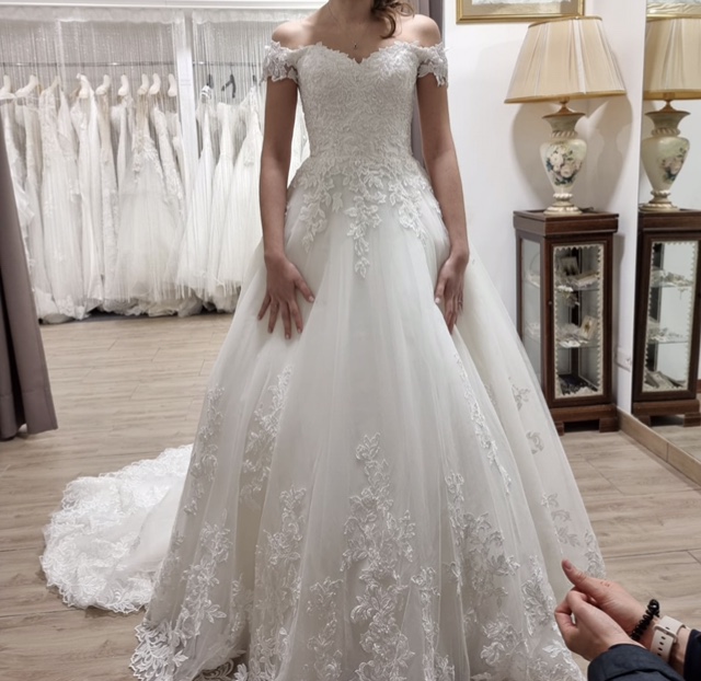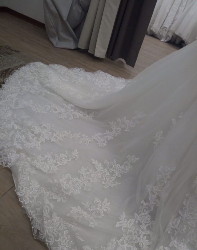 Abito in tulle e pizzo ricamato con aggiunta di paillettes e perline con coda, più velo