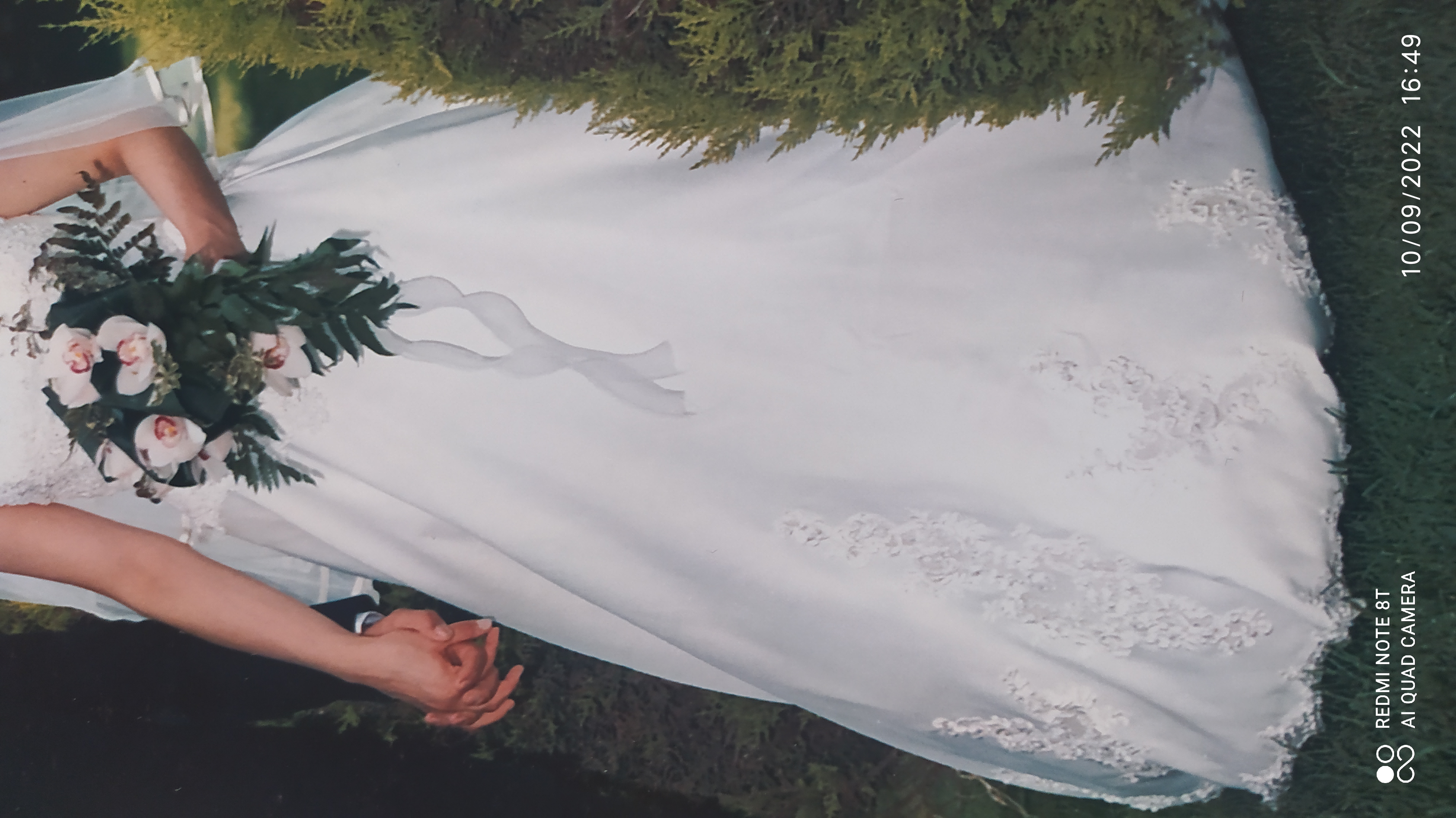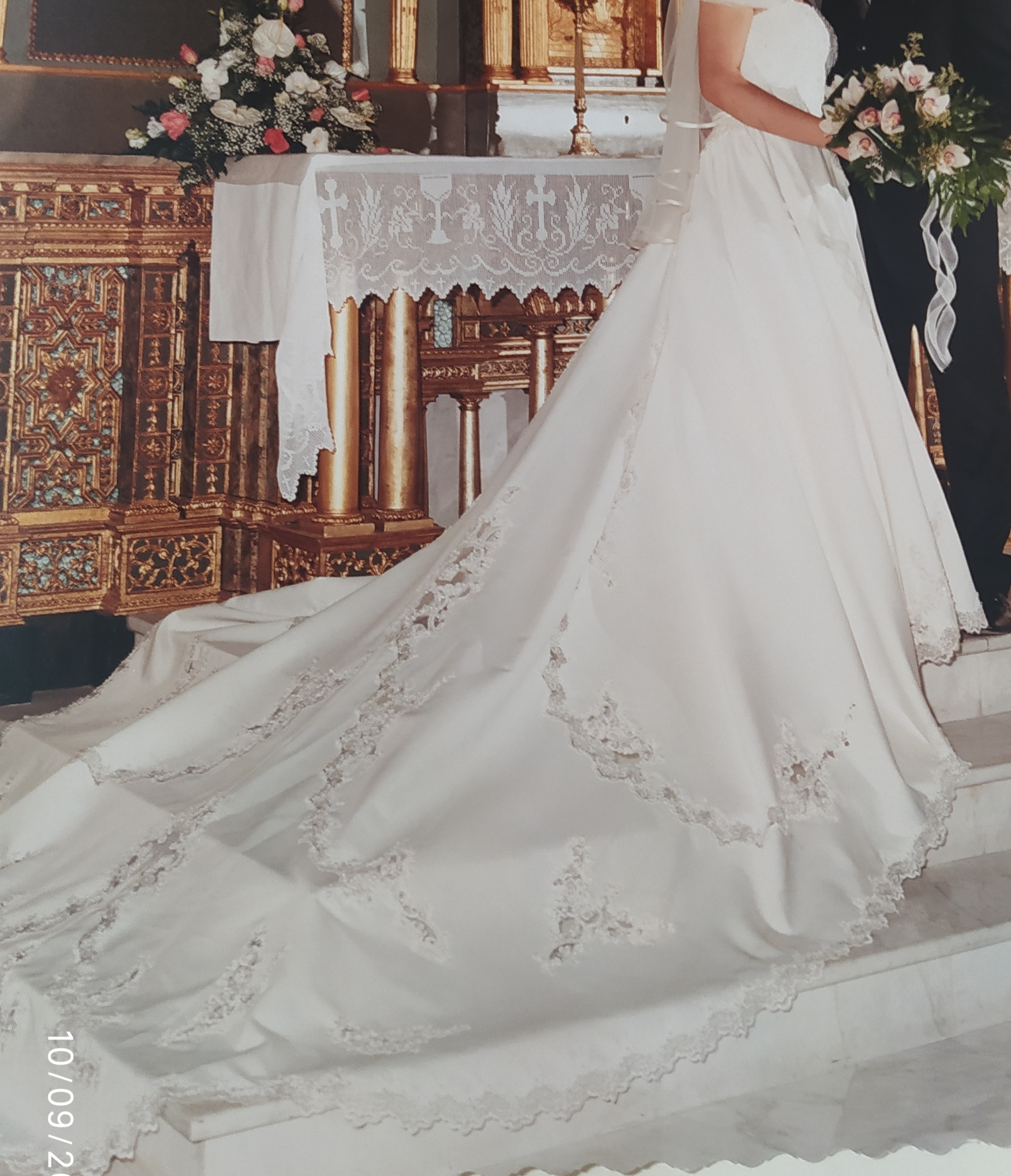 Abito da sposa colore panna, modello principessa con con coda di rondine impreziosito da finissimo pizzo e perle. Si presenta in ottime condizioni. Incluso di velo corto, guanti lunghi e stola per la sera. Prezzo trattabile.