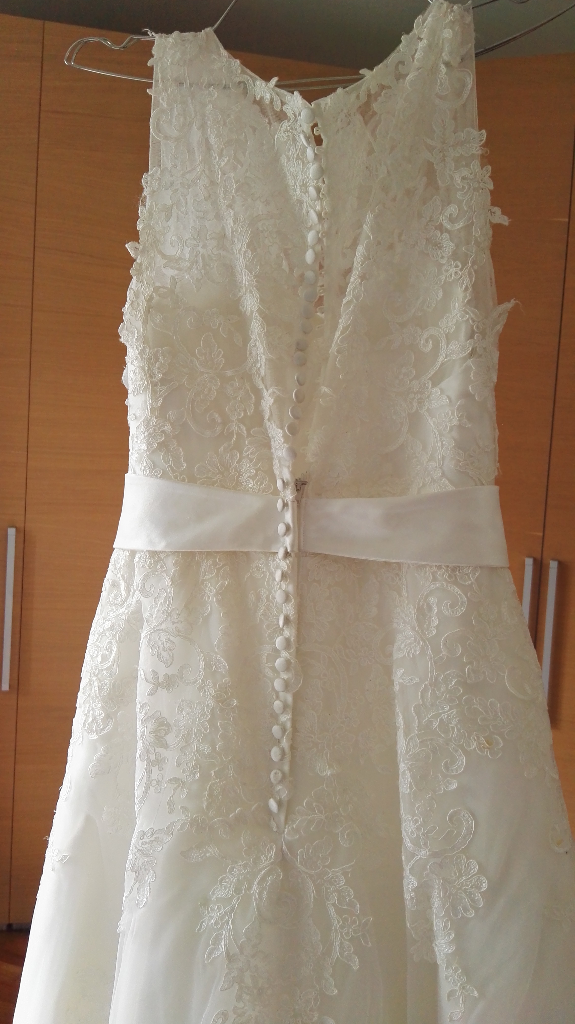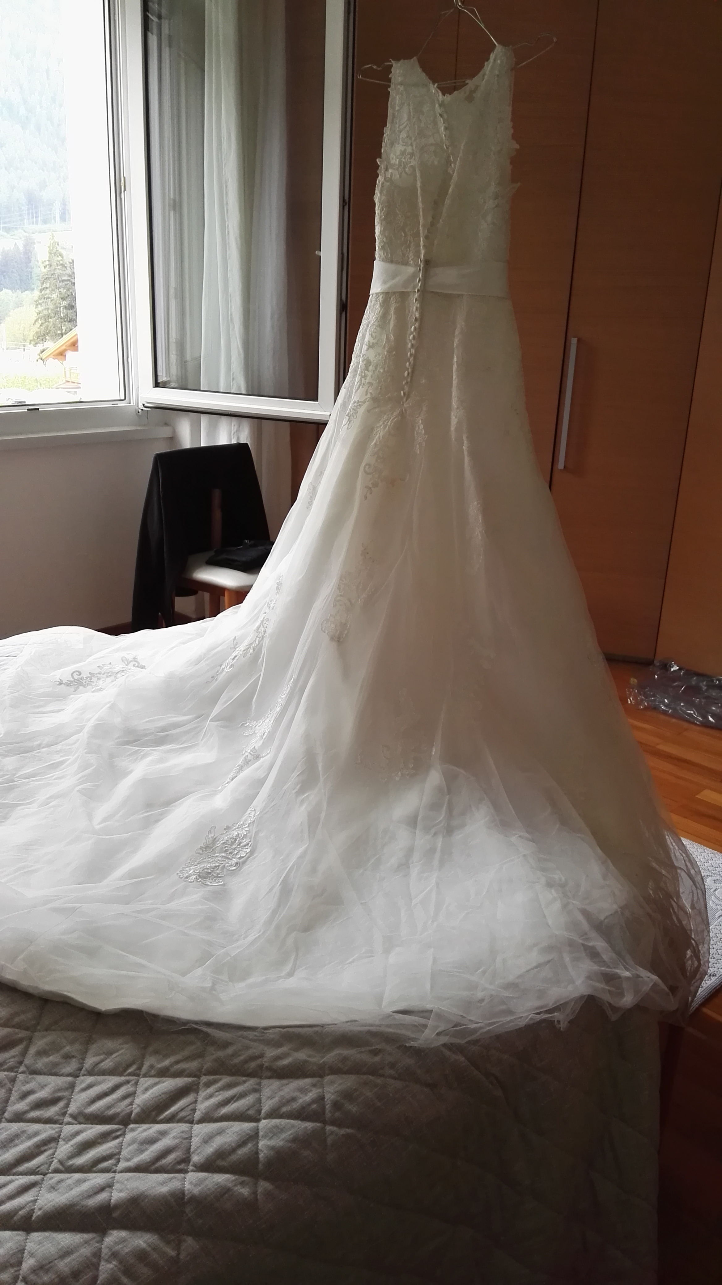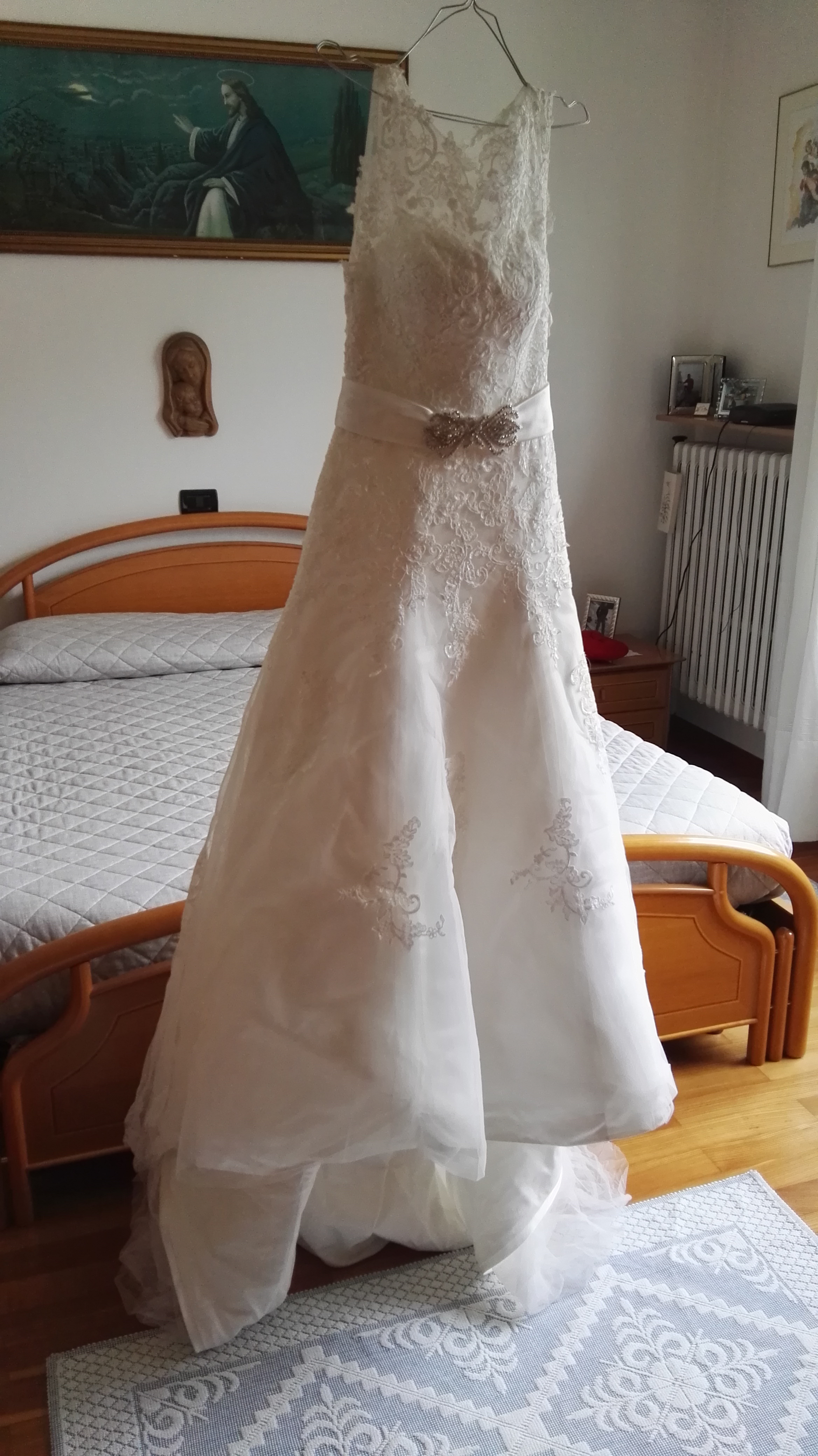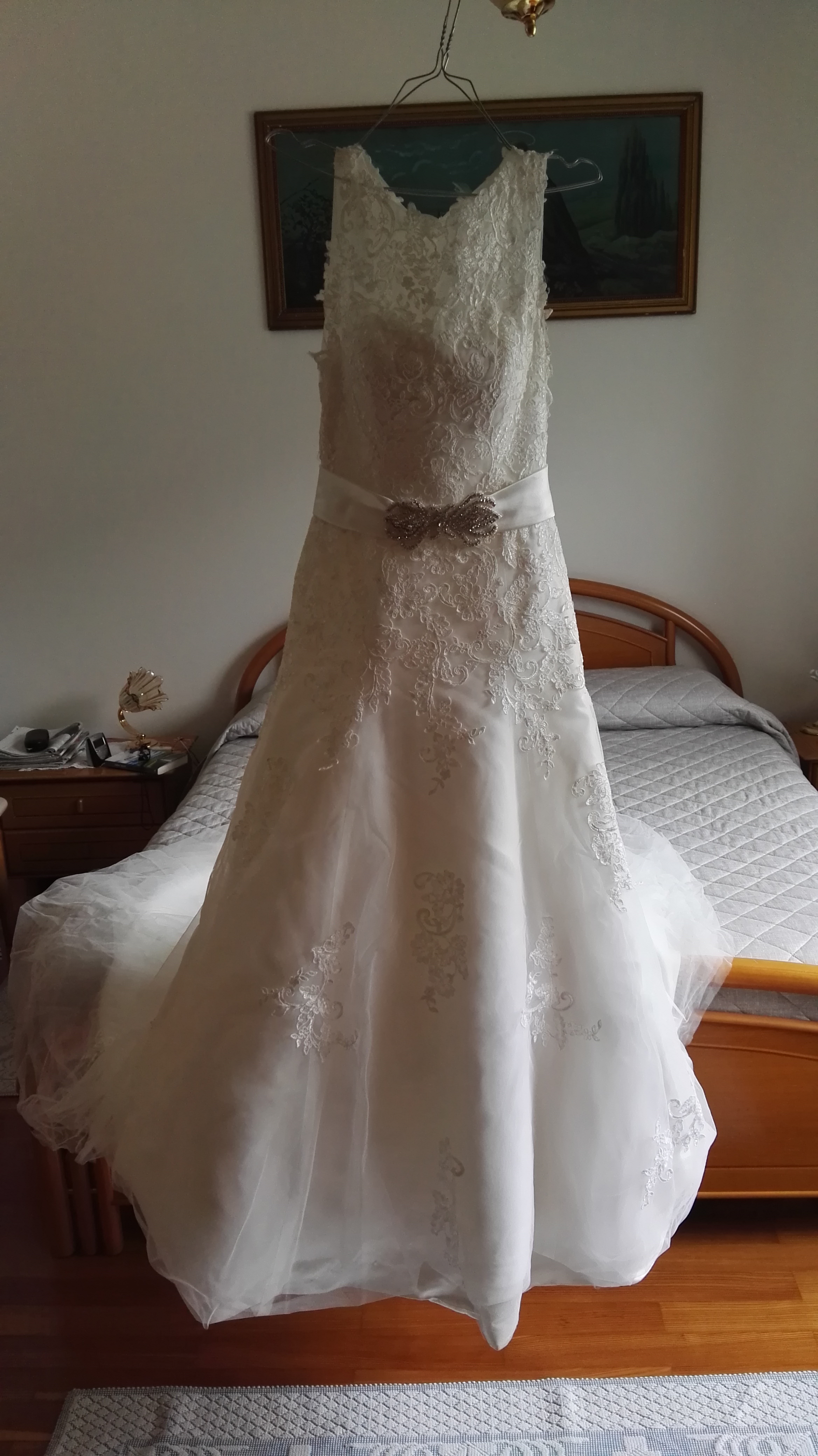Vestito da sposa taglia 42. Senza maniche. La parte sopra è di pizzo,molto elegante. Con esso posso includere le scarpe,un 37, anch’esse usate solo una volta. Abito lavato in lavanderia e conservato nel suo astuccio.