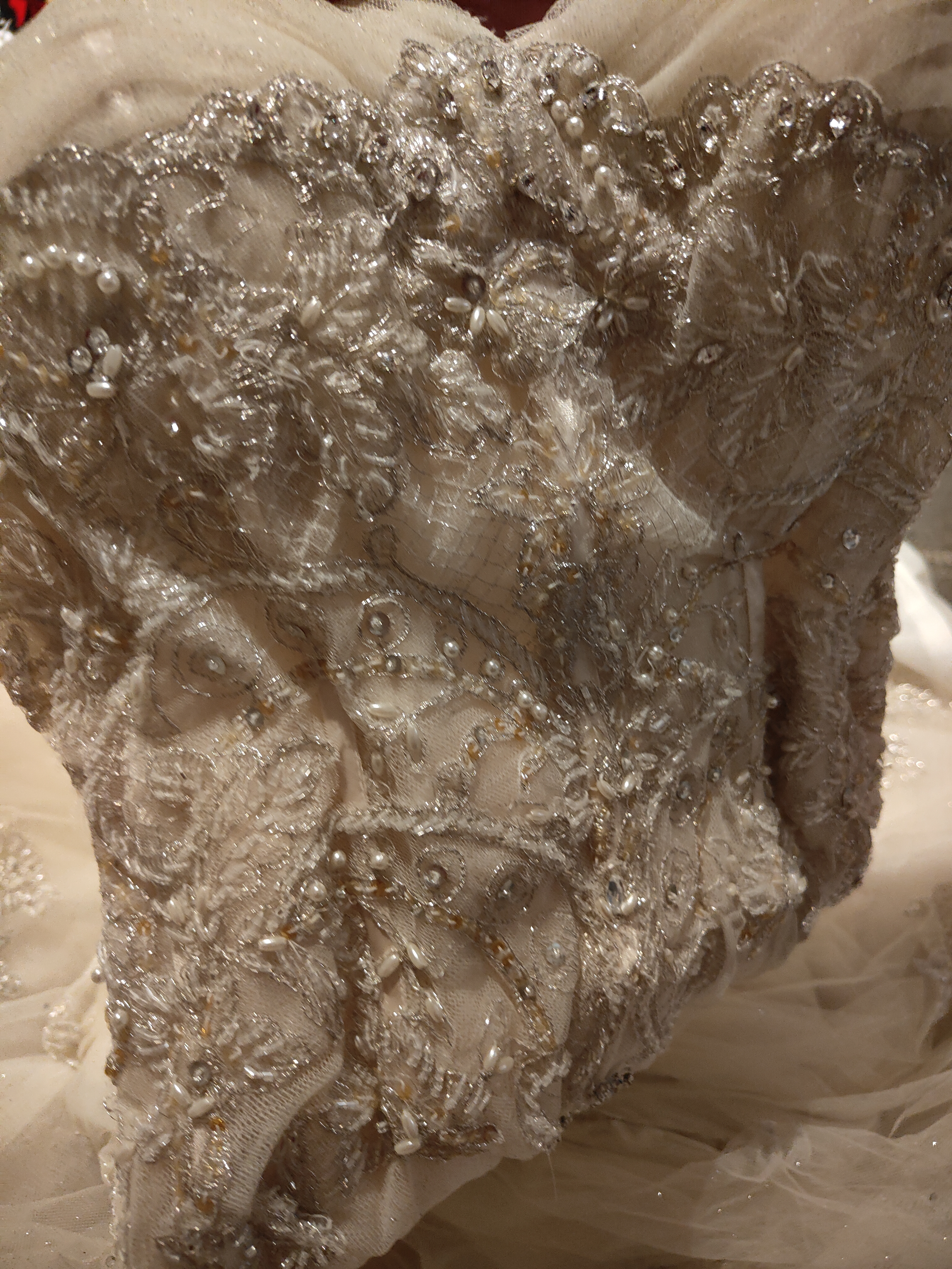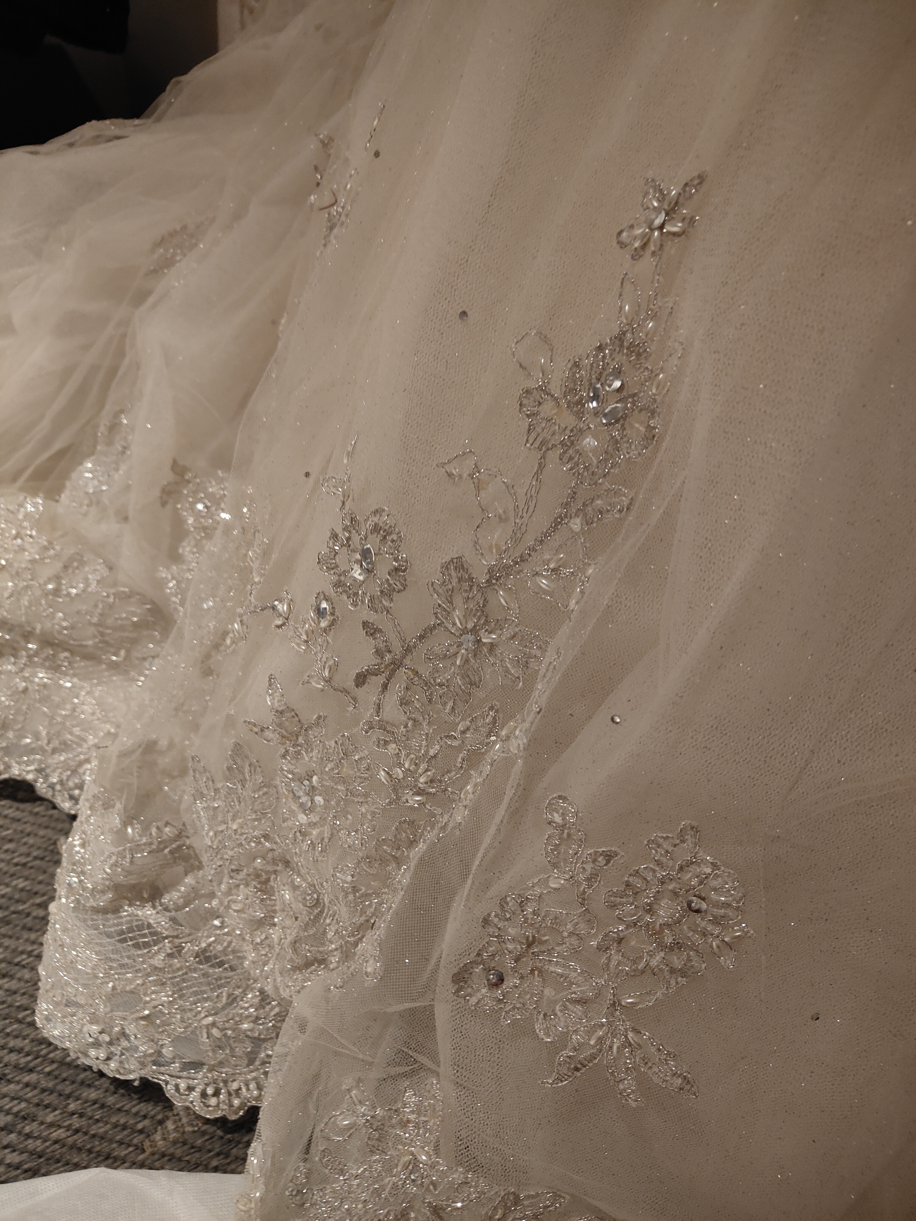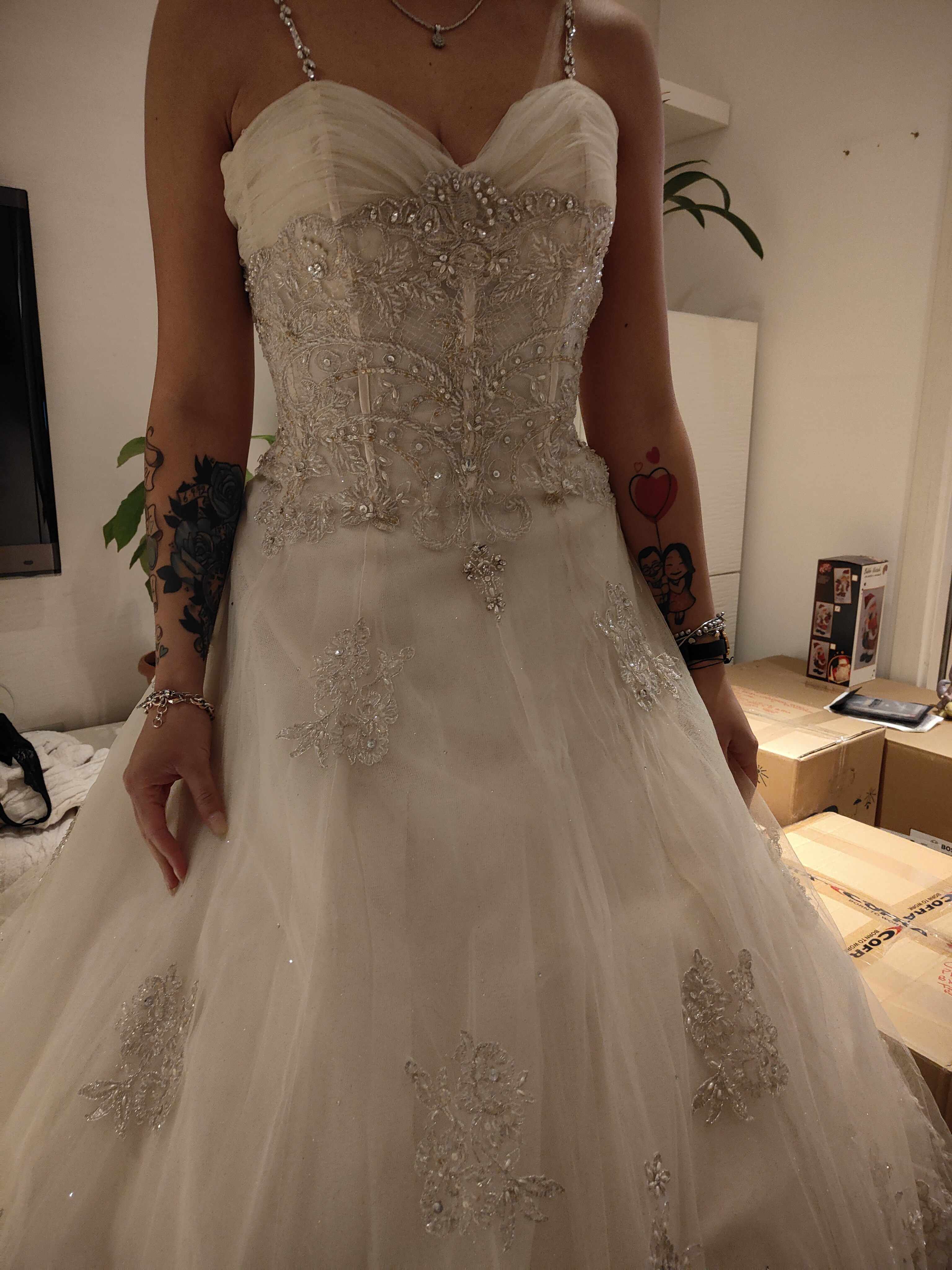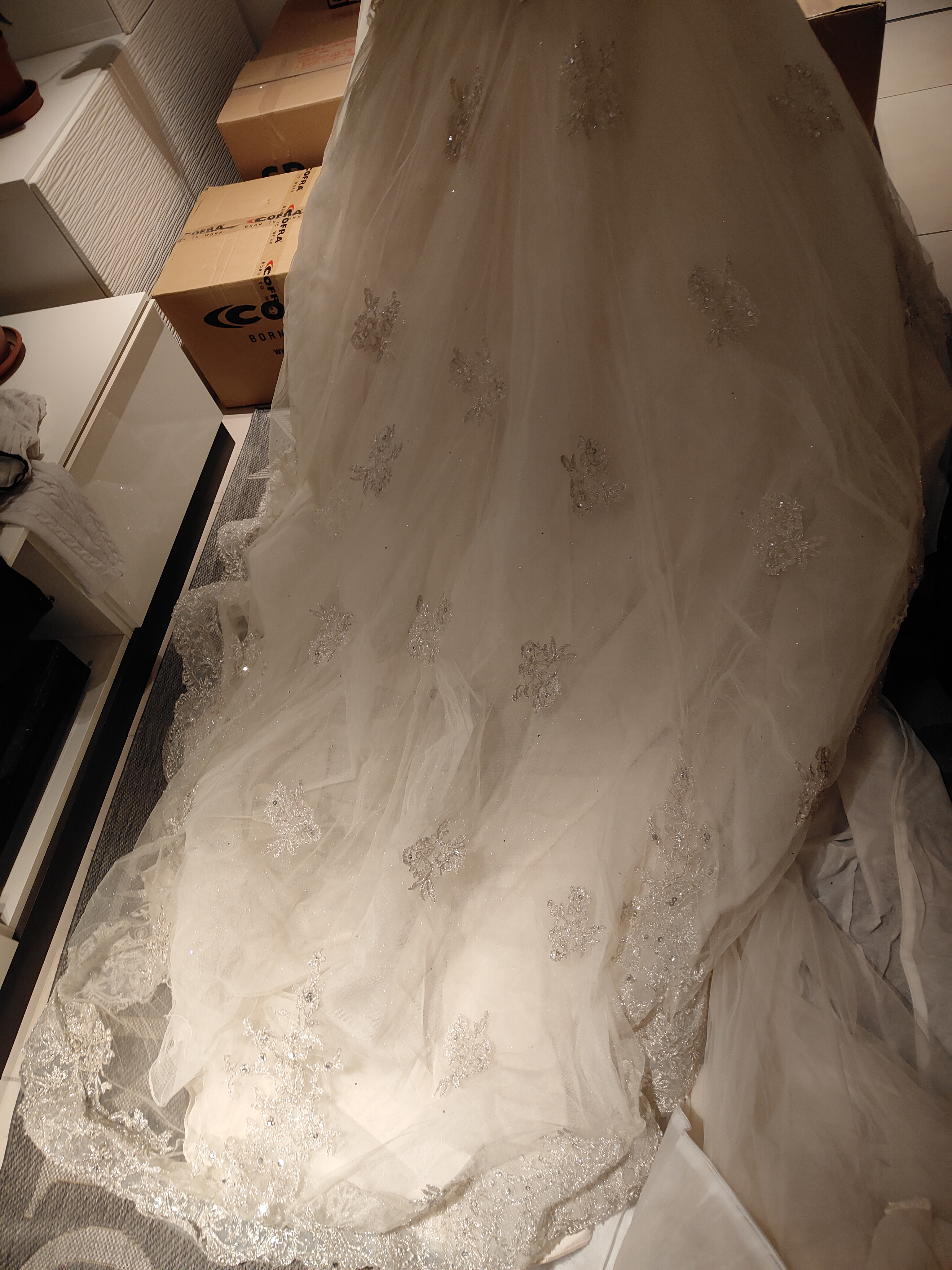 Abito da sposa acquistato in grossa atelier nel 2012. Fatto lavare dopo cerimonia e rimasto sempre nel suo sacco come da foto. Comprensivo di velo dello stesso colore dell’abito e con strascico come abito.