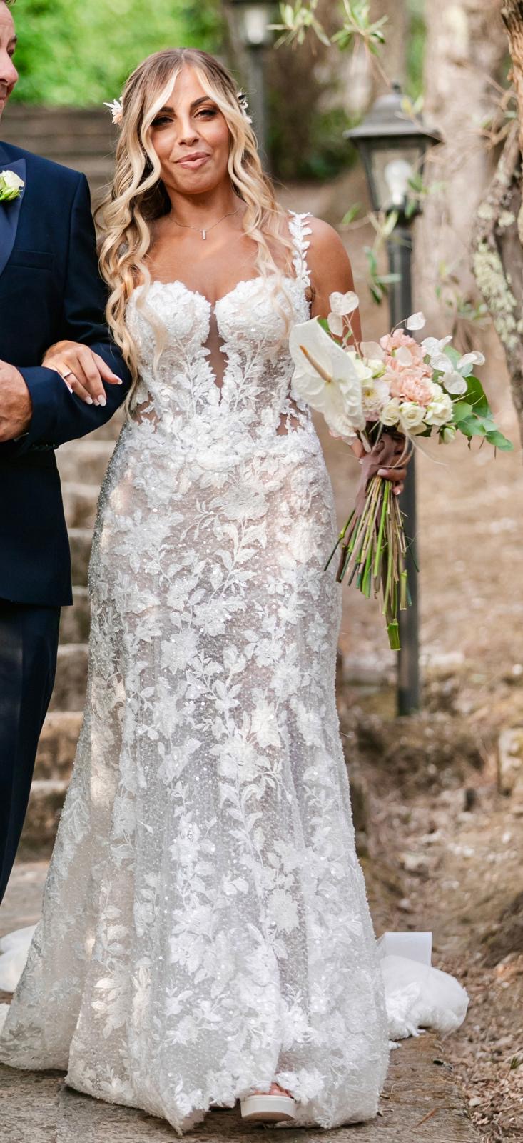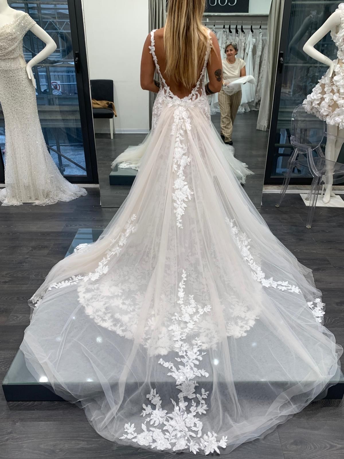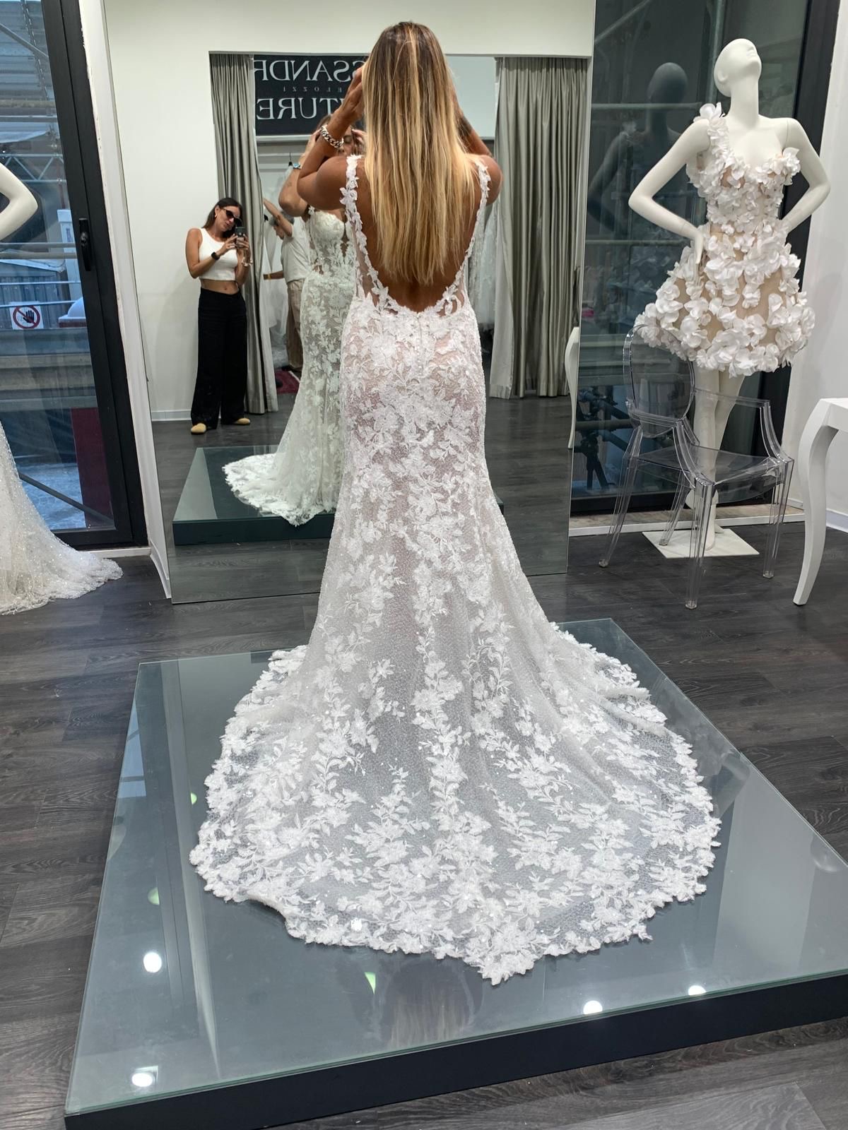 Abito semi sirena in pizzo, usato ma in ottime condizioni. Il tessuto è un elegante pizzo che dà un tocco di raffinatezza all’intero abito.