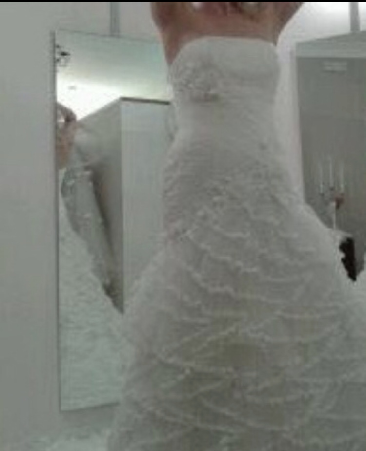Ha una sagoma a sirena fino all’anca per aprirsi in una bellissima gonna a strascico con una serie di merletti visibili in foto. Il corpetto è curato nei dettagli e hai dei meravigliosi dettagli floreali.