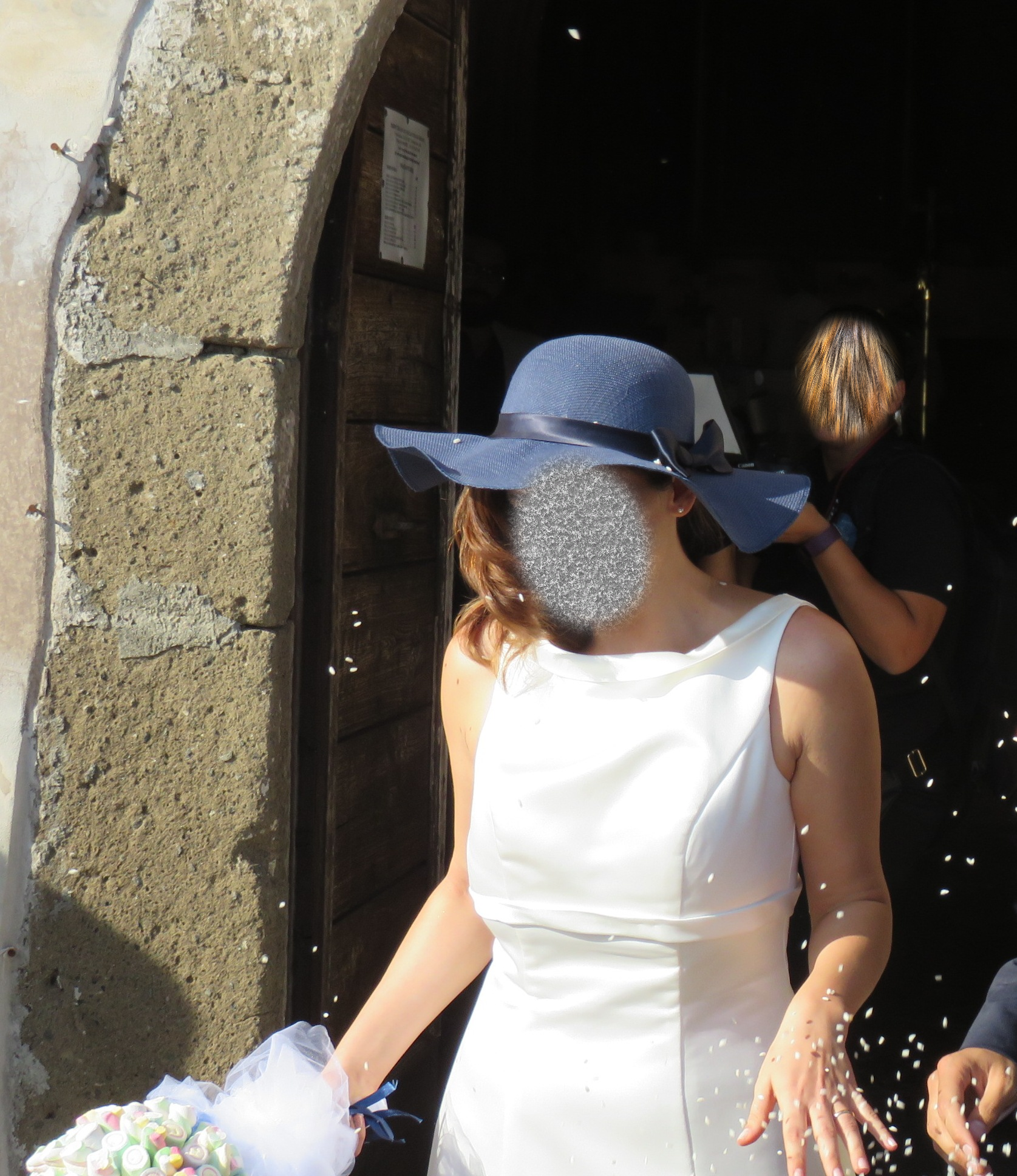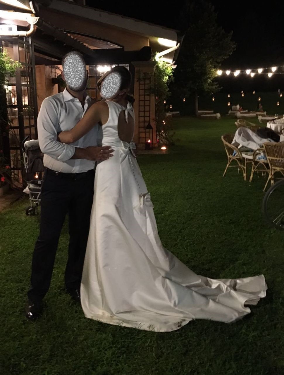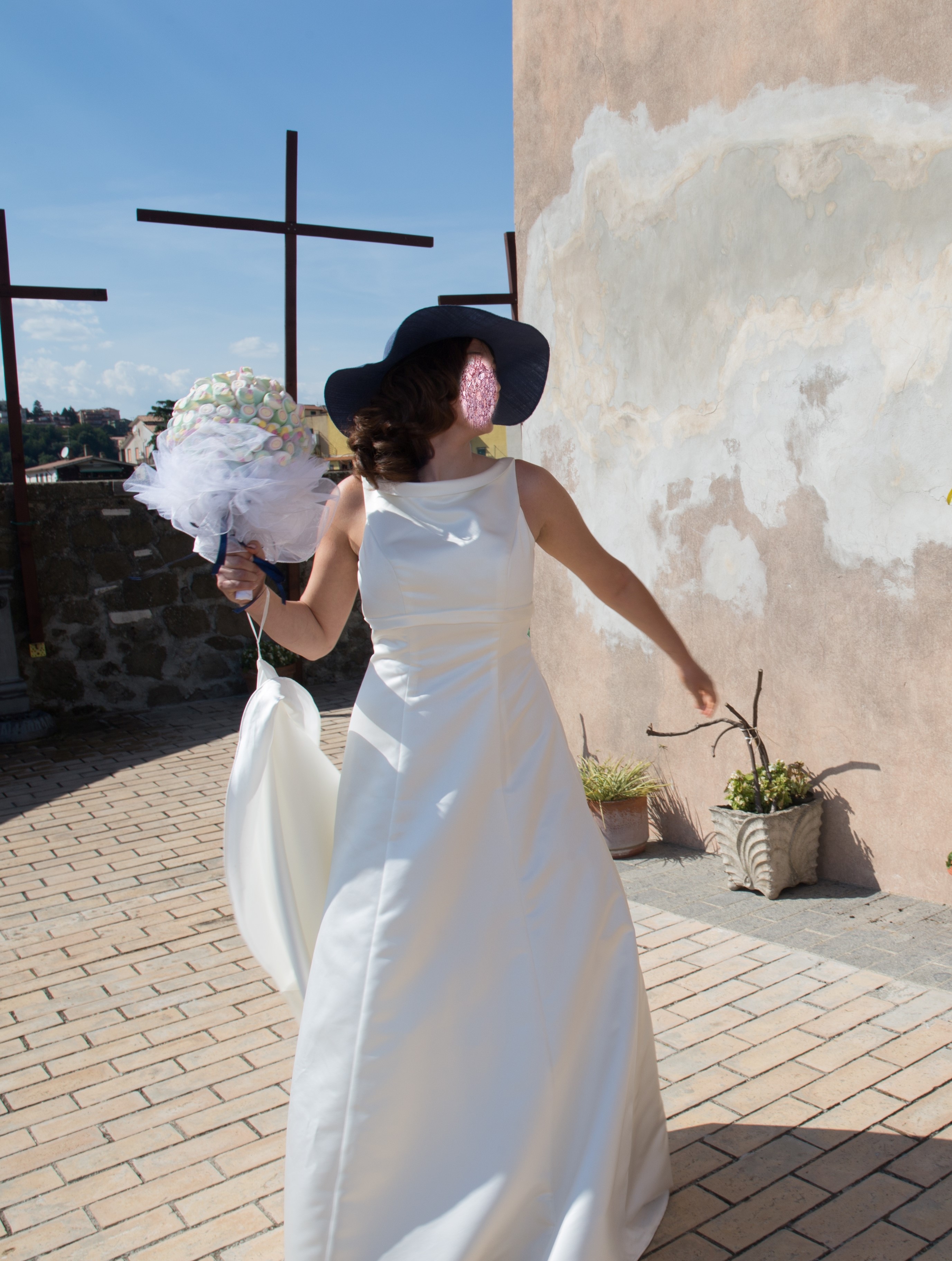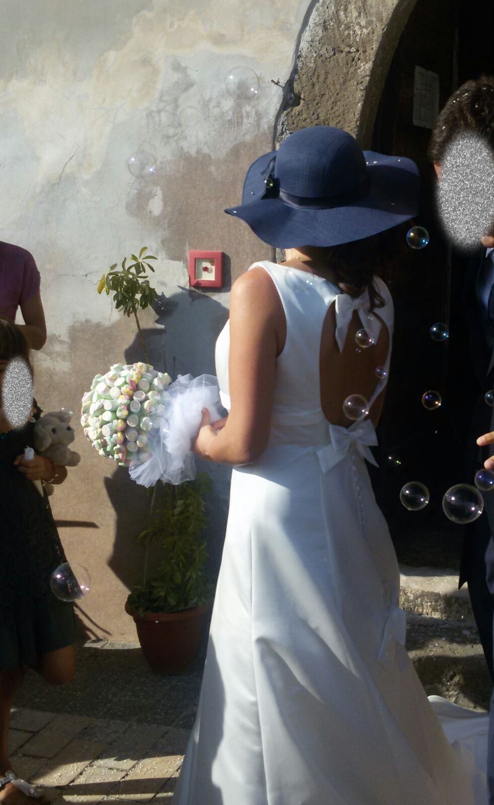 indossato una sola volta, adatto a taglia 44 per altezza di mt.1,70, tessuto in rasatello, solo abito escluso cappello.