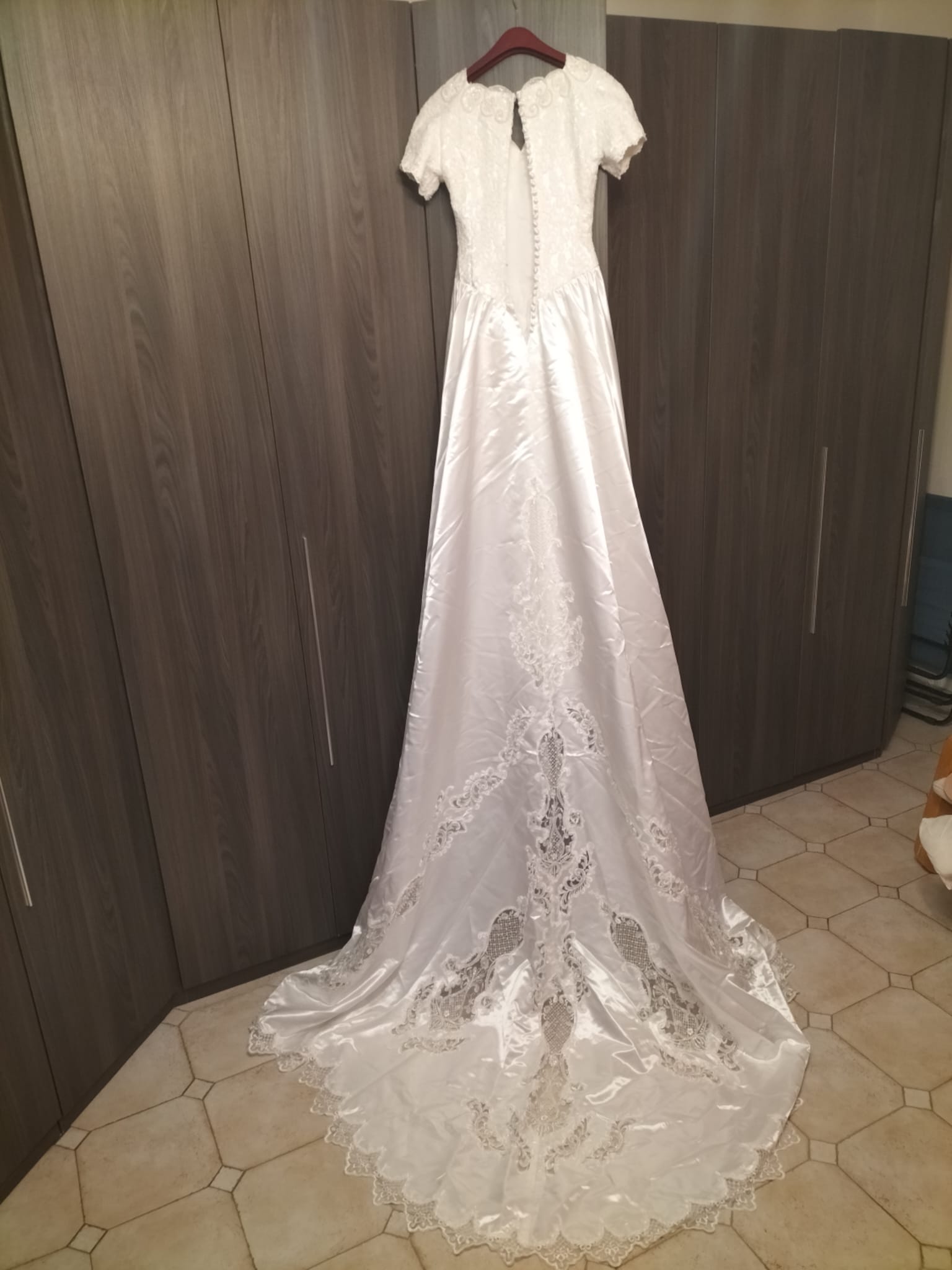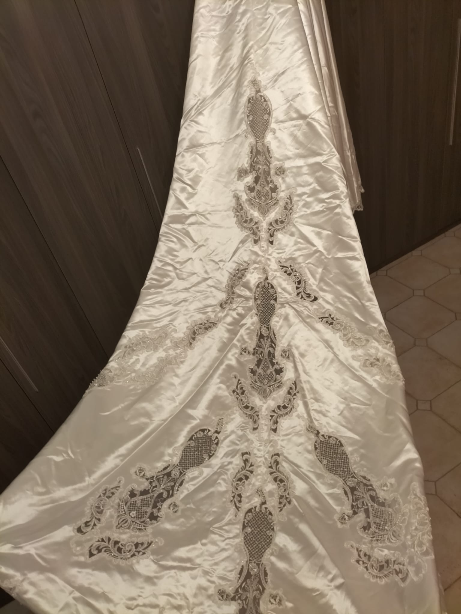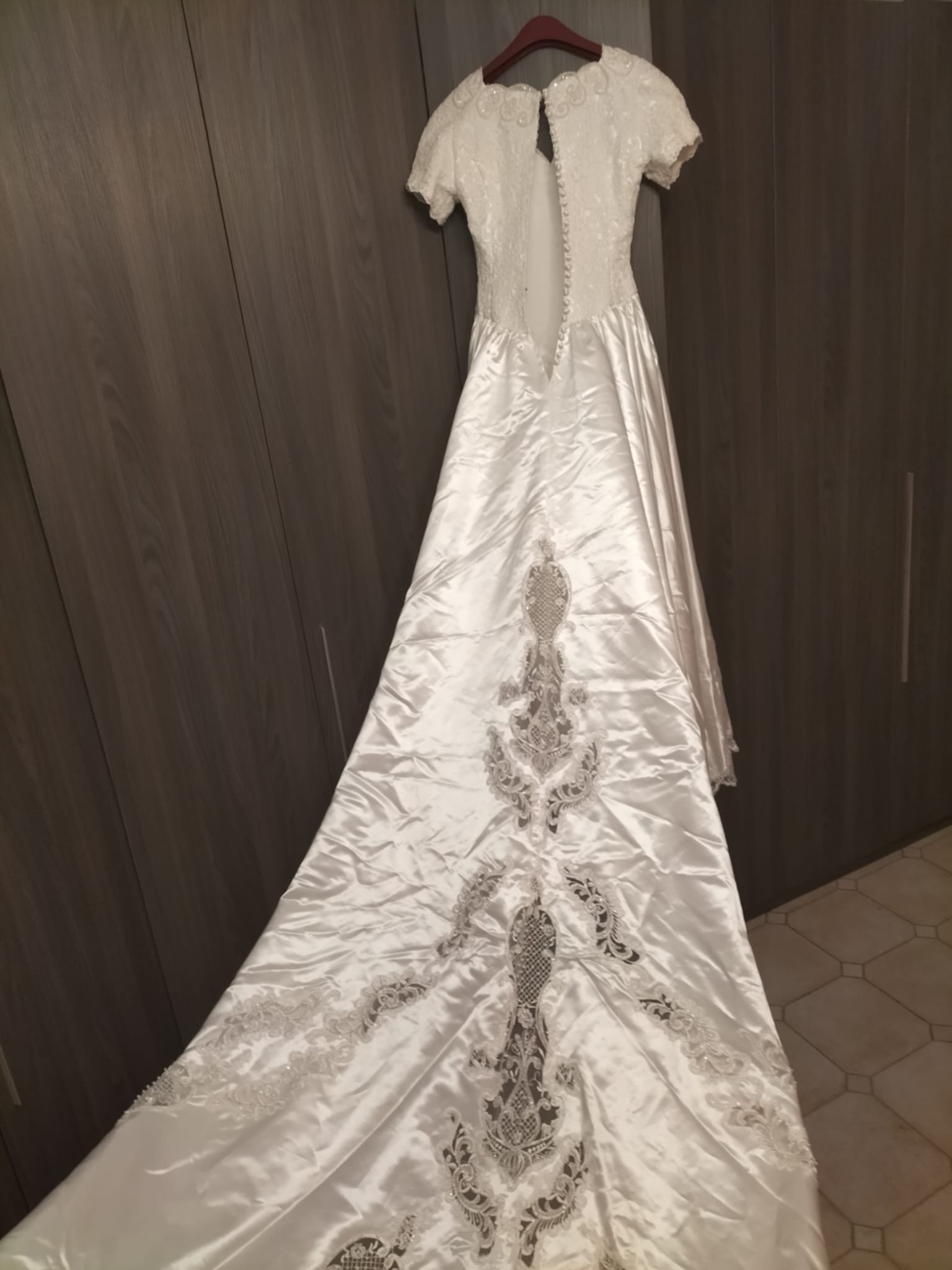 Abito da sposa con lungo strascico lavorato e ricamato e corpetto a maniche corte interamente lavorato e ricamato con perline e paillettes. Se interessano regalo guanti lunghi in raso