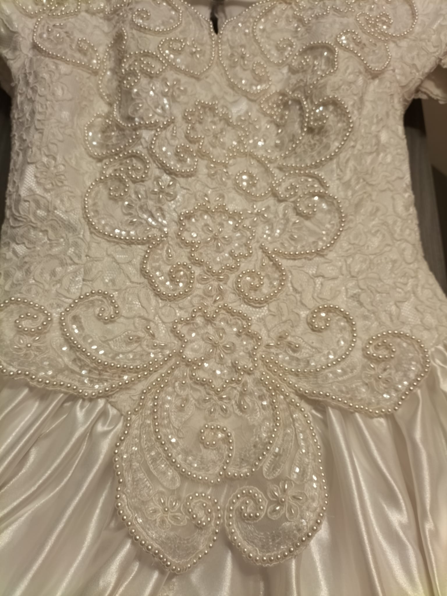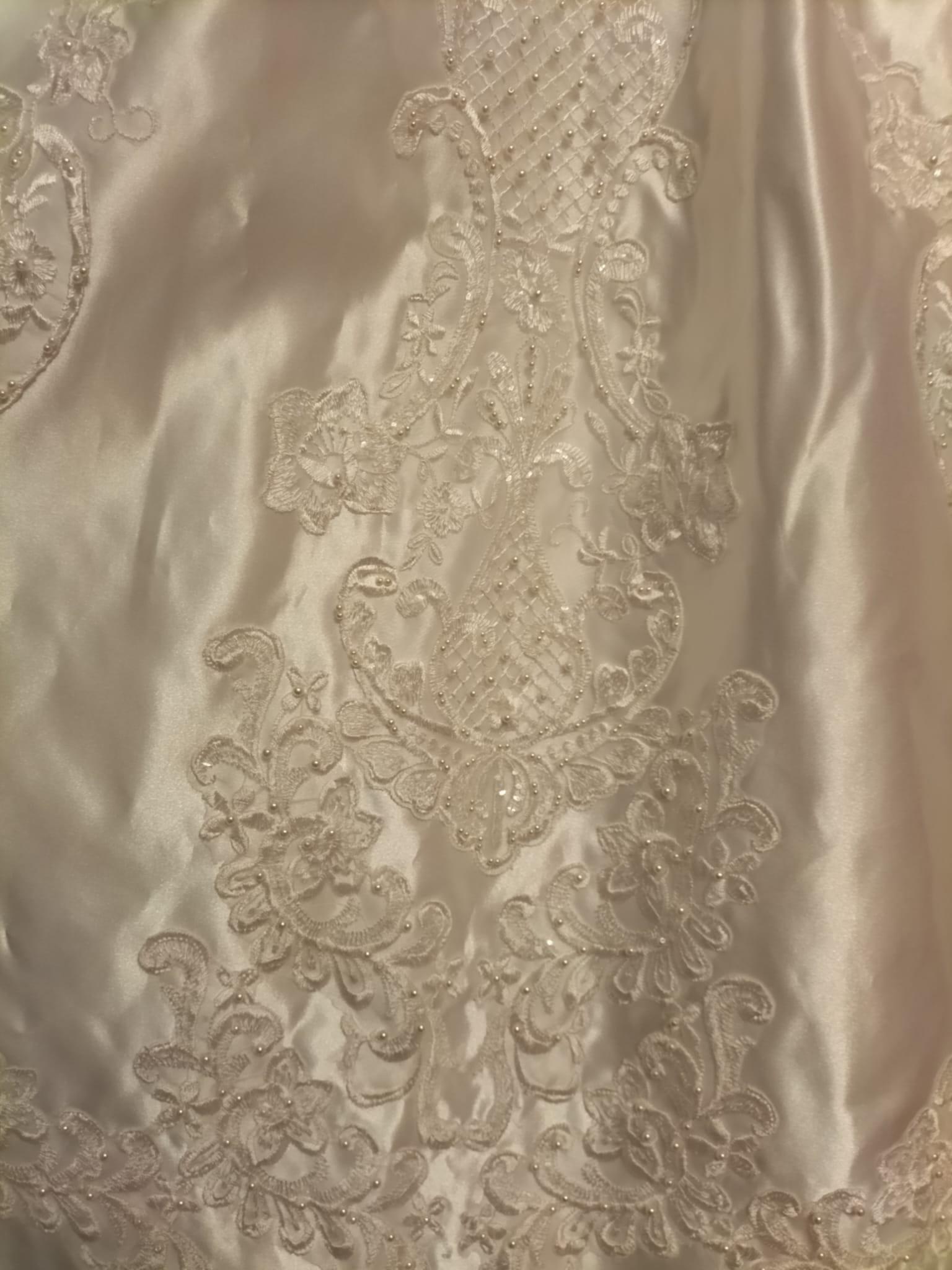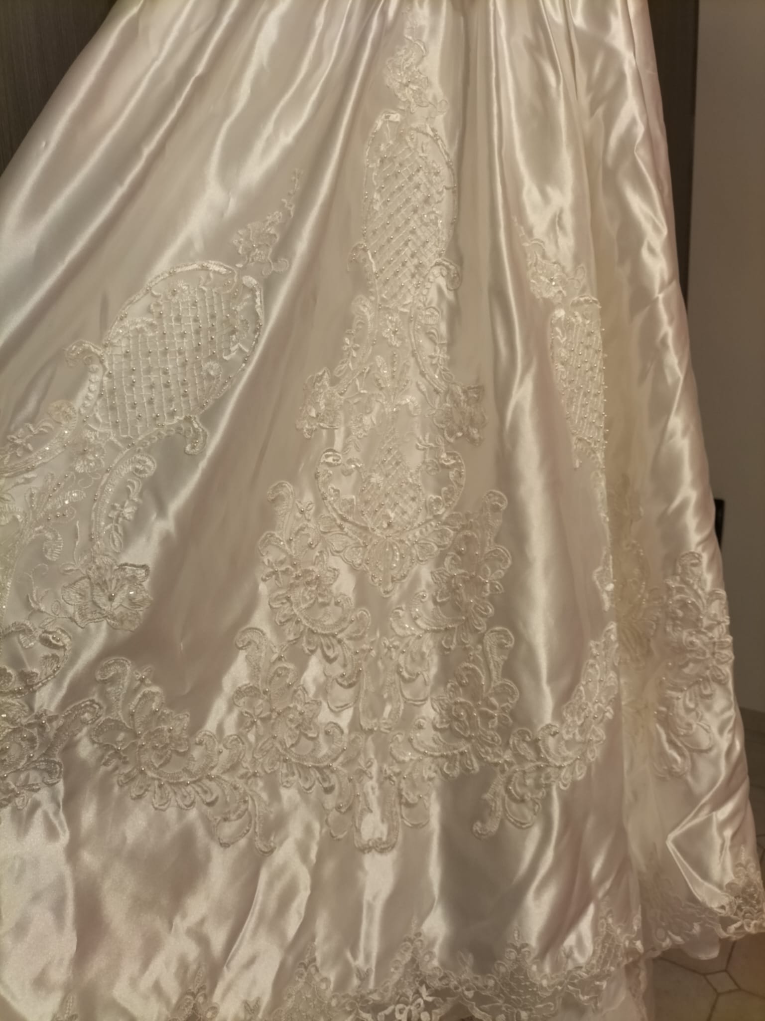 Abito da sposa con lungo strascico lavorato e ricamato e corpetto a maniche corte interamente lavorato e ricamato con perline e paillettes. Se interessano regalo guanti lunghi in raso