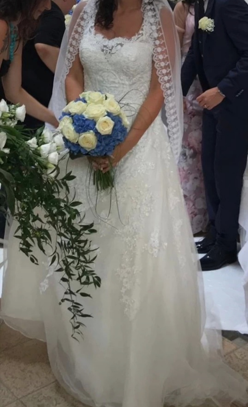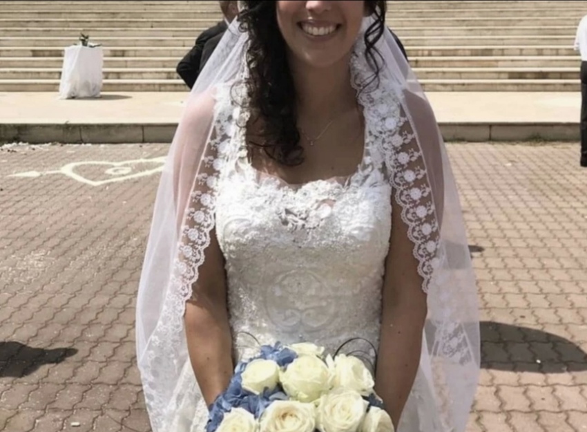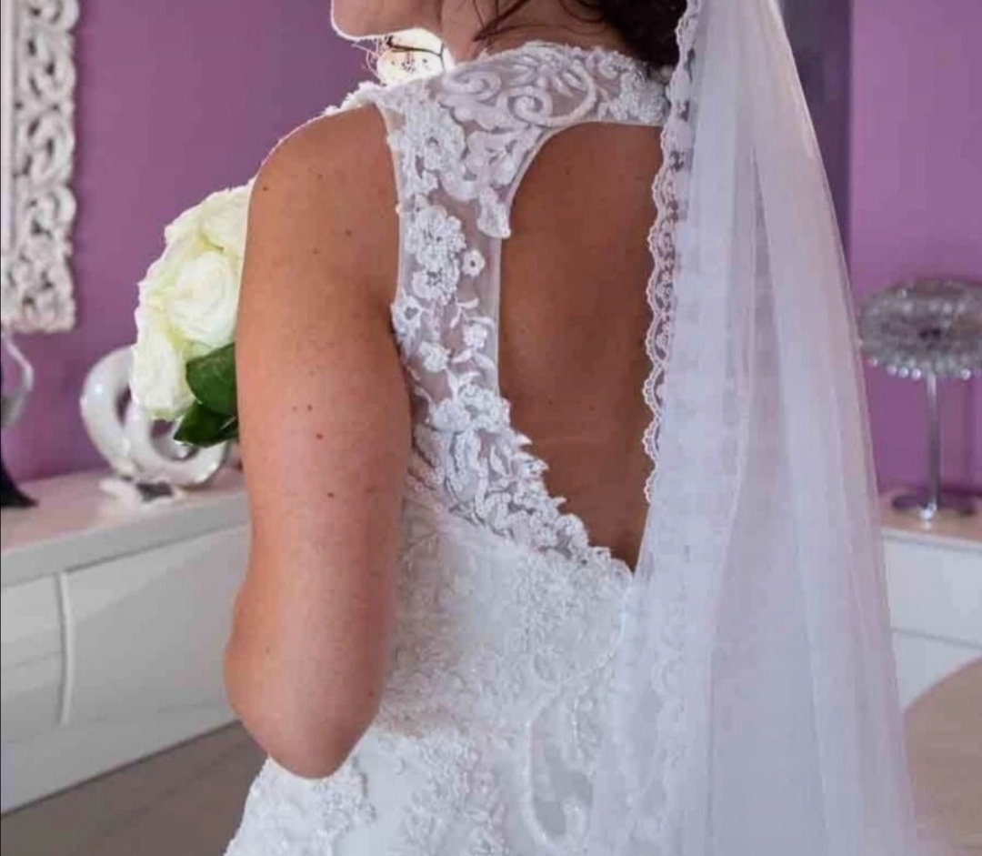 Abito comprato nuovo nel 2019, usato per il mio matrimonio e subito dopo lavato e rimesso nella sua custodia. No macchie nè strappi. Corpetto con ricami floreali in pizzo e brillantini e scollatura frontale un po’ ridotta con del tulle ma che può tornare ad essere più profonda, ossia nel suo formato originario. Apertura sulla schiena a forma di cuore con una comoda cerniera a chiusura coperta da una serie di romantici bottoncini. Dettagli in pizzo e tulle sulla gonna che scende morbida.