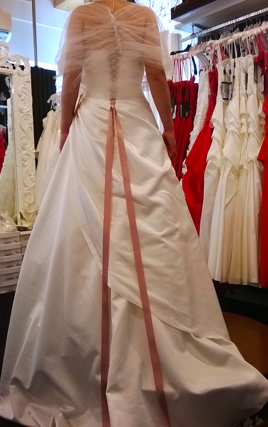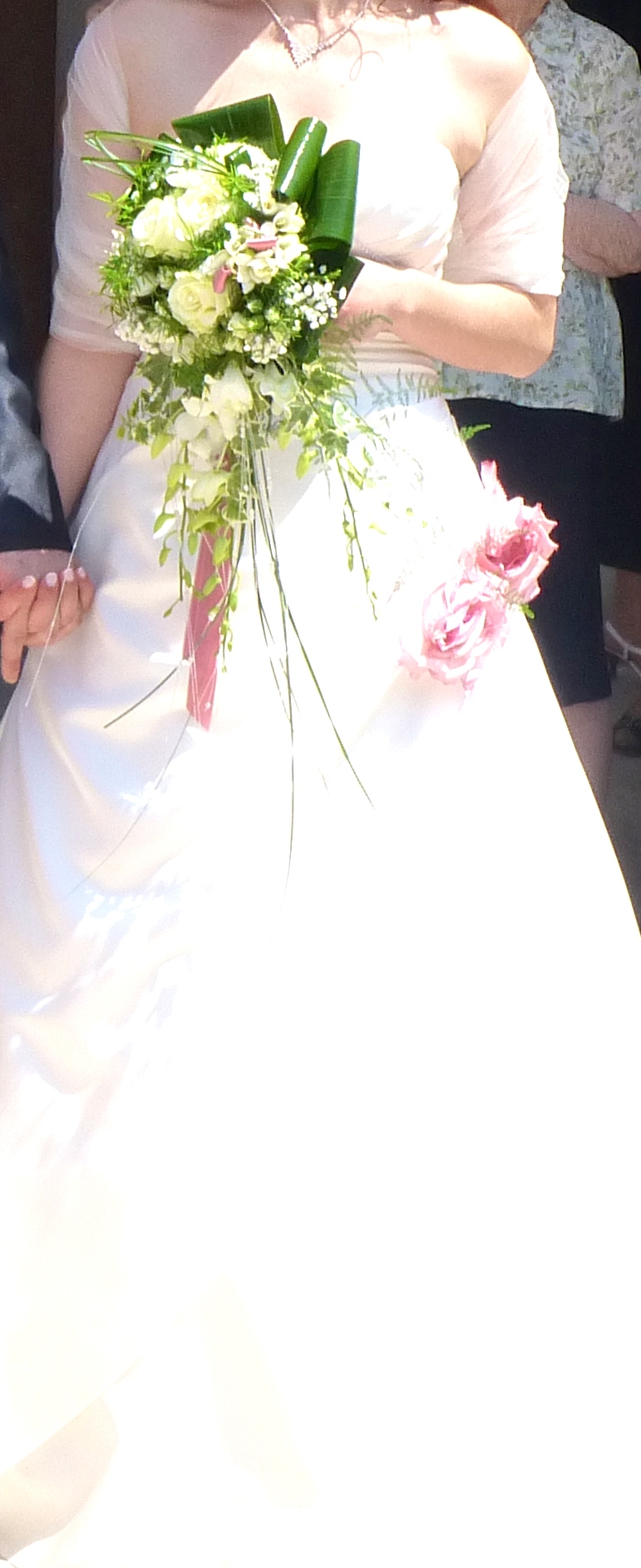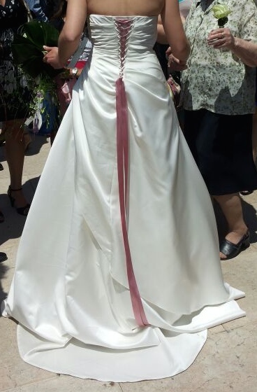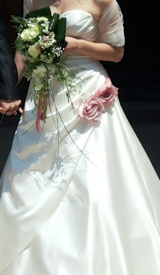 Vendesi abito da sposa avente le seguenti caratteristiche: taglia 42, rasatello bianco avorio, con applicazioni Swarovski e nastro rosa sul retro bustino, due rose laterali sulla gonna e coprispalle in tulle bianco con applicazioni Swarovski centrali, con sottogonna semirigido. Utilizzato una volta e lavato e stirato in tintoria, ottime condizioni.