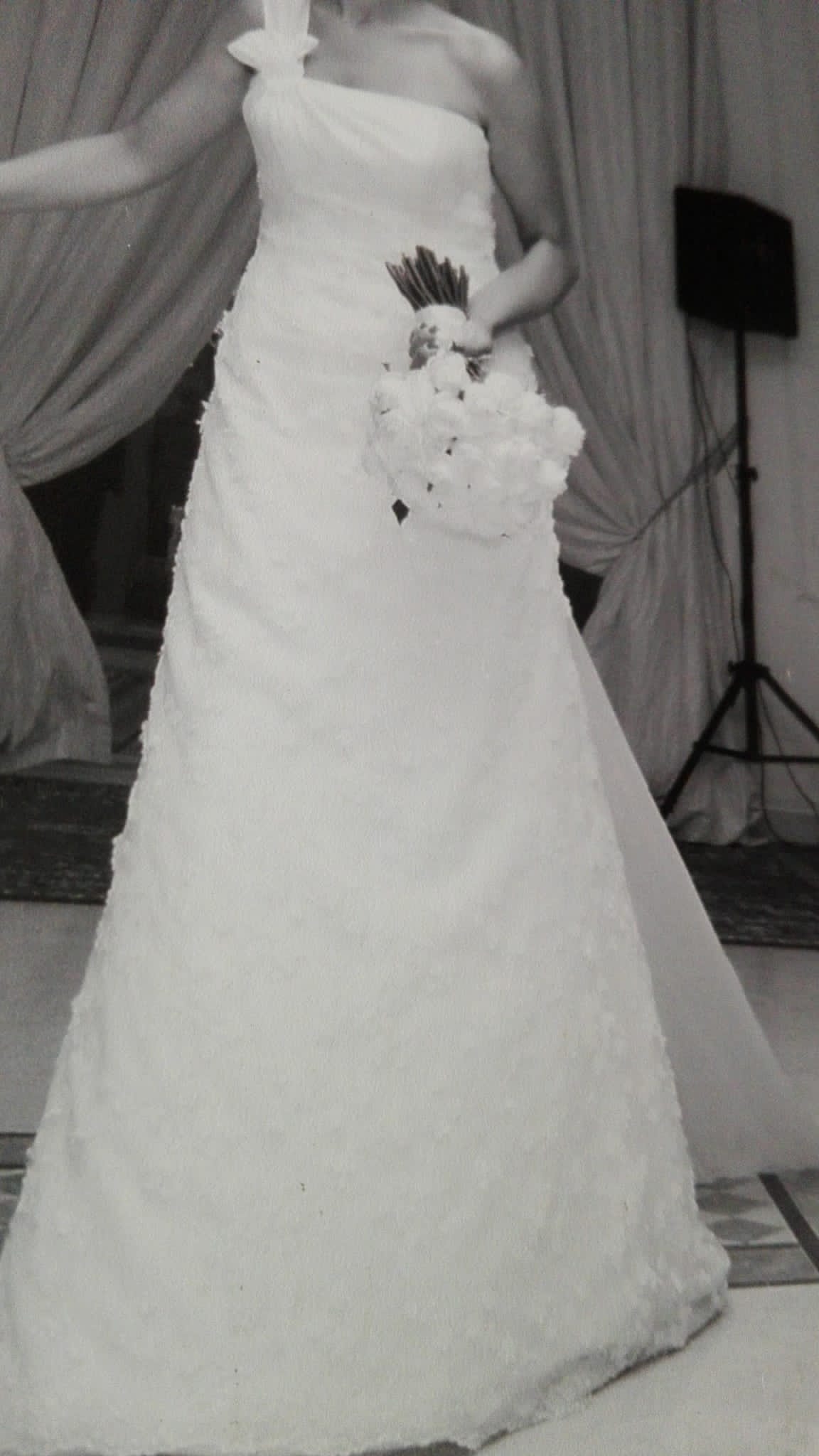 Abito monospalla in pizzo e con coda sovrapposta all’abito in shantung di seta. Compreso nel prezzo velo lungo liscio di seta con strascico. Chiedo cortesemente di contattare se interessati.