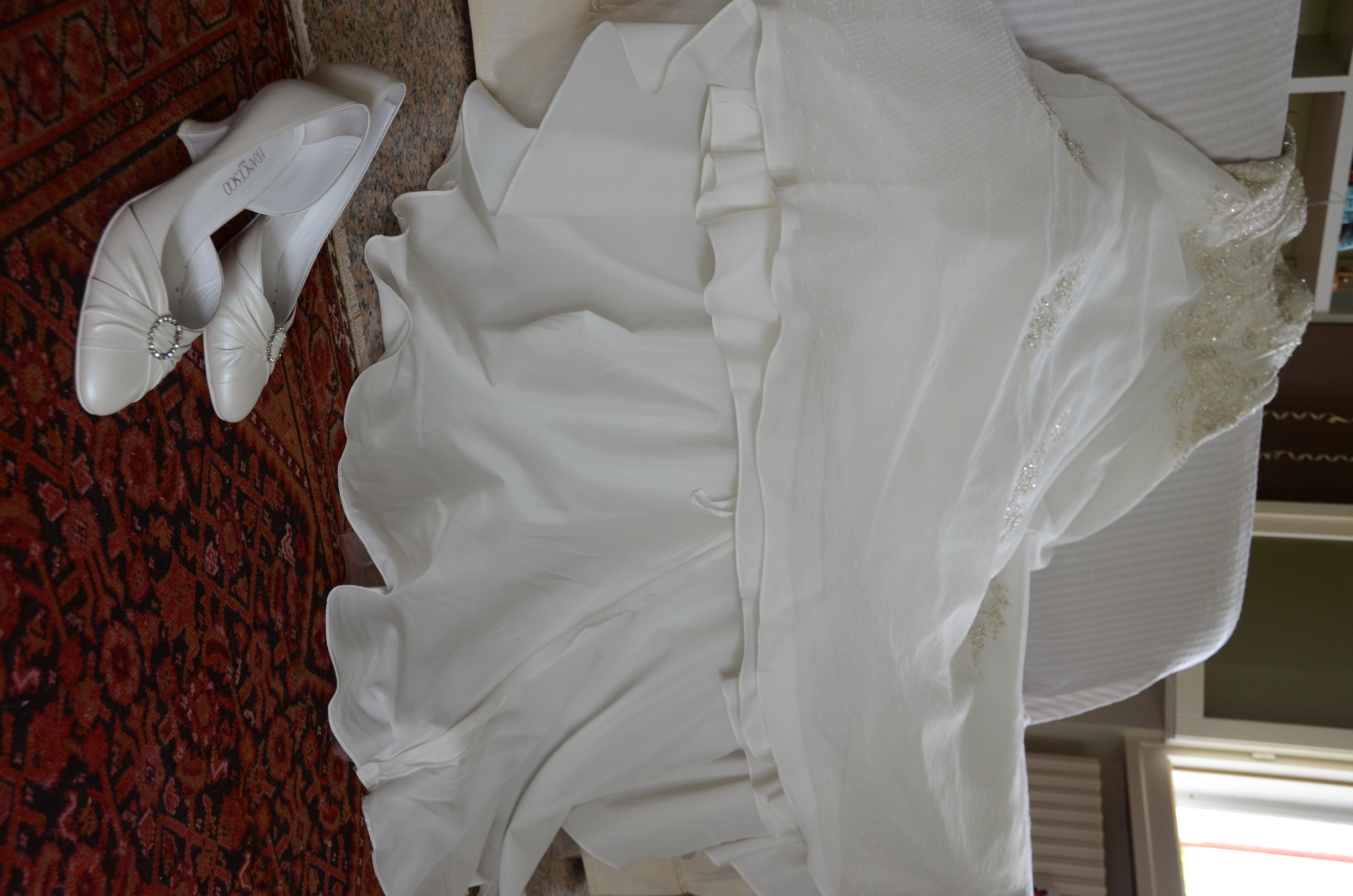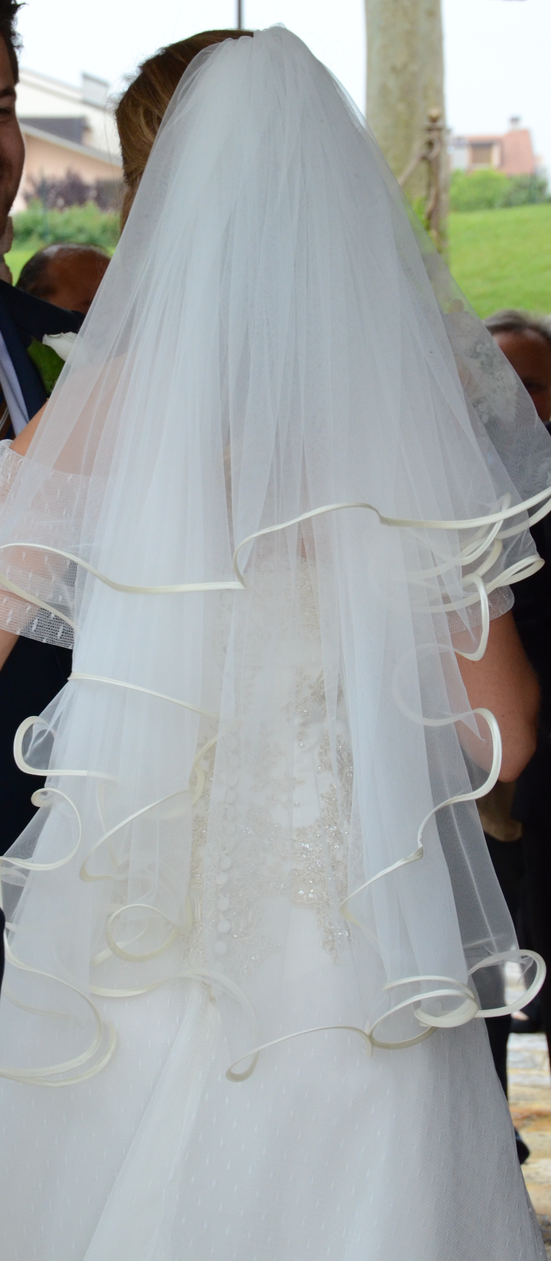 Il prezzo include il coprispalla realizzato con lo stesso materiale della gonna e fissato al corpetto attraverso del velcro. Il velo è di tulle di lunghezza media con un bordo in raso e comprende il pettinino invisibile per fissarlo ai capelli.