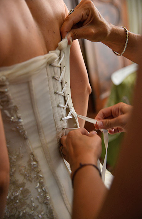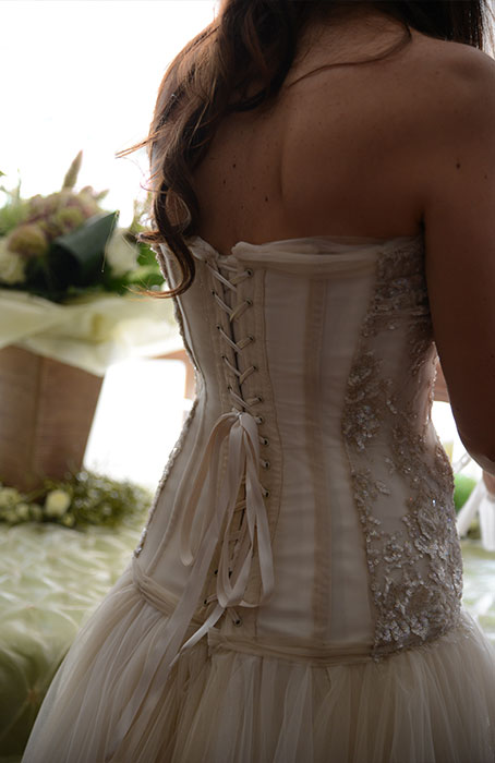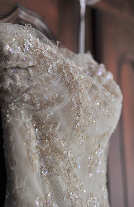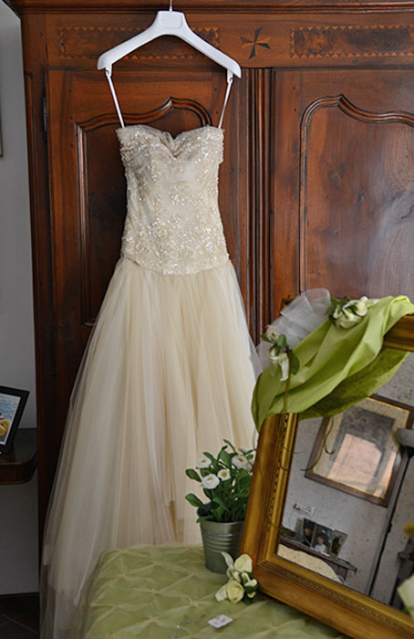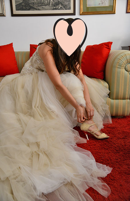 la gonna è fatta di veli di tulle in diverse nuance all’avorio allo champagne.