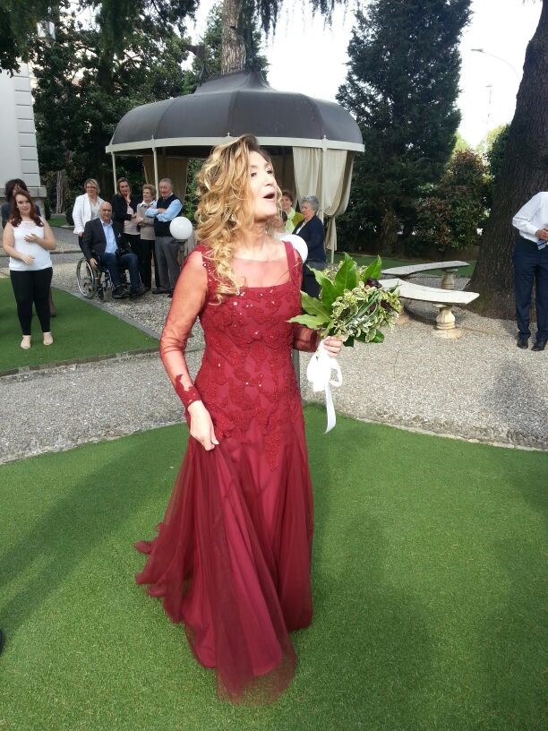 Abito da sposta rosso rubino realizzato da atelier, taglia 44, altezza 1.64 – 1.68. La parte in tulle con ricami in pizzo è separabile dall’abito in raso con spalline che può essere indossato singolarmente dopo la cerimonia o in altra elegante occasione. Completa l’abito una stola in raso dello stesso colore per un totale di € 700.