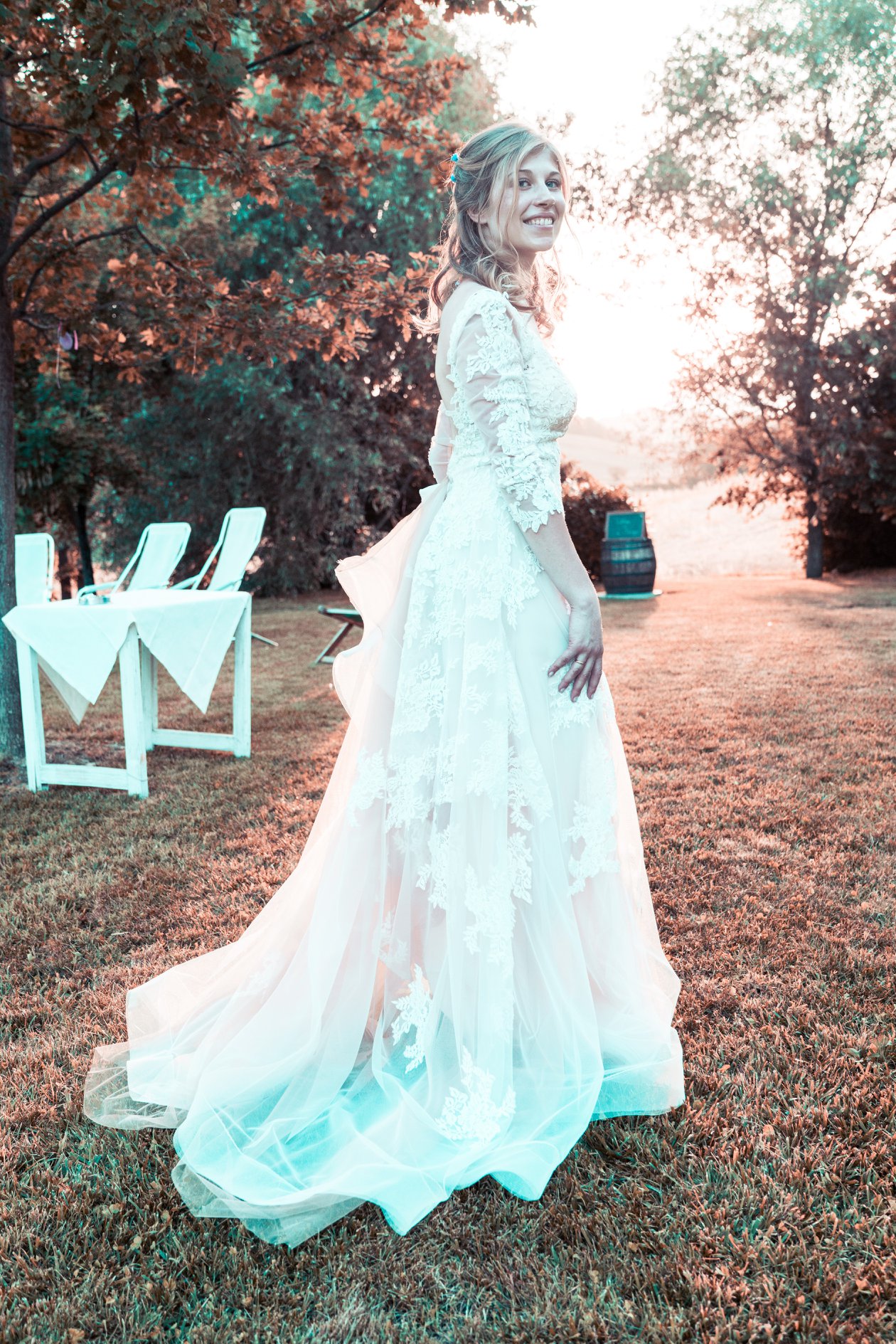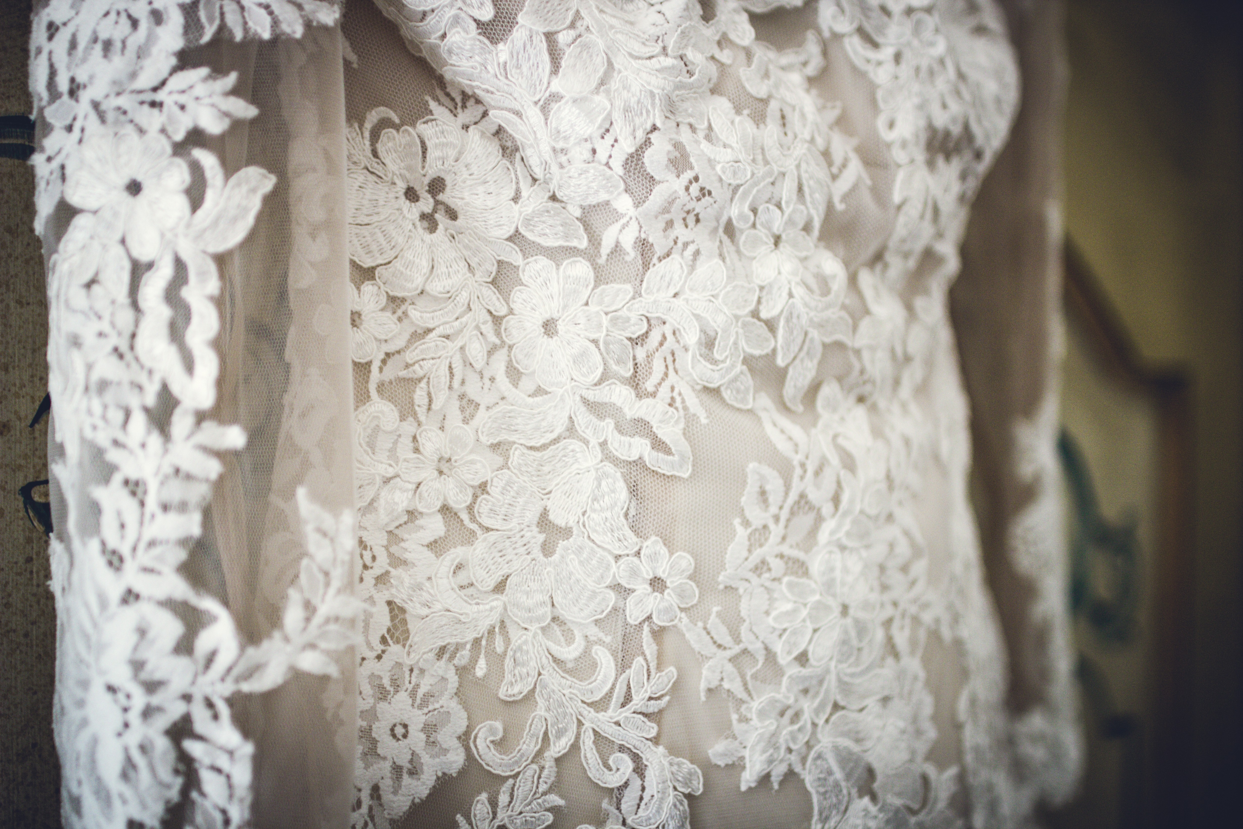 Romantico abito da sposa in pizzo e sottoveste in seta, confezionato dall’atelier Idea Sposa di Torino (modello simile al Trisha di Alessandra Rinaudo), lavato a secco subito dopo il matrimonio e conservato in perfette condizioni.