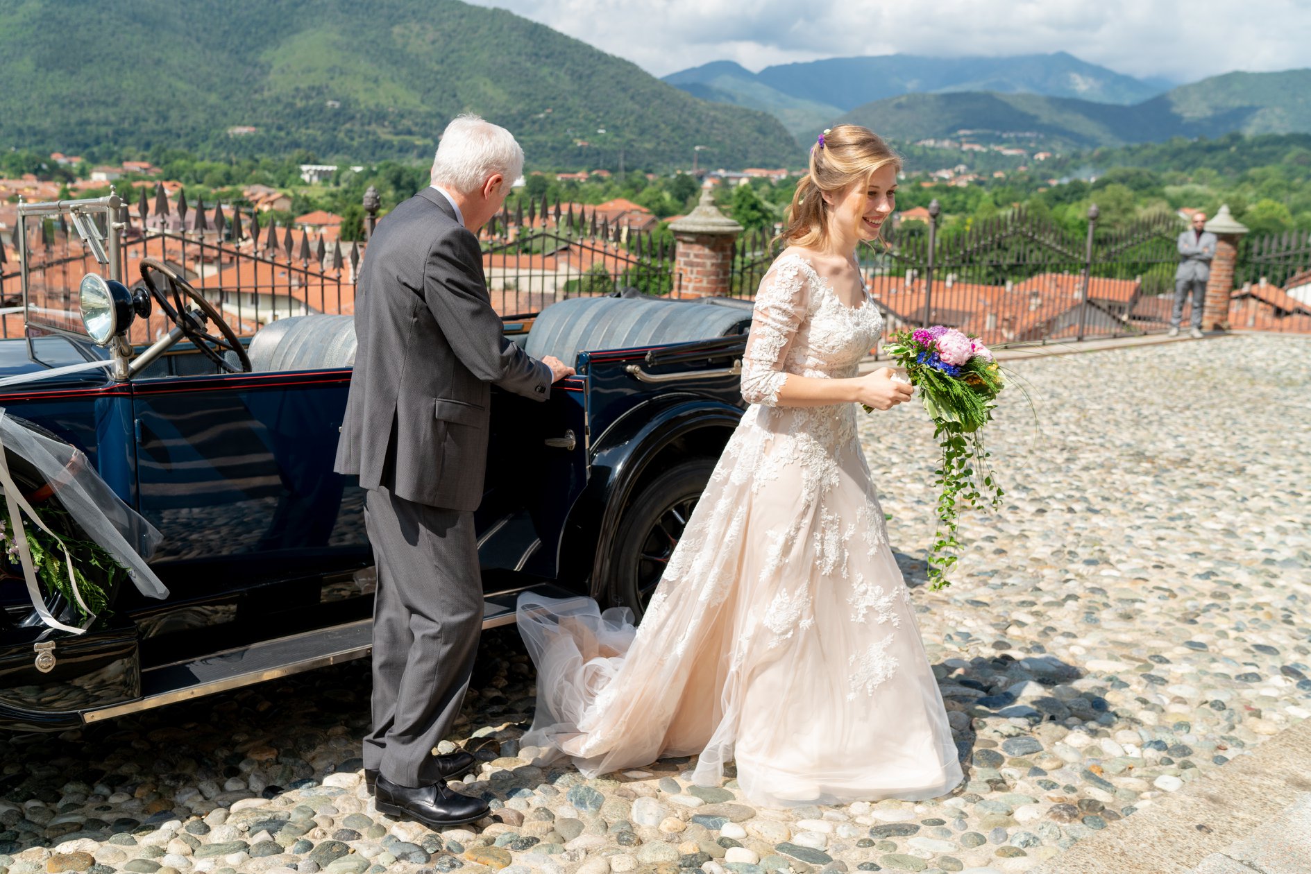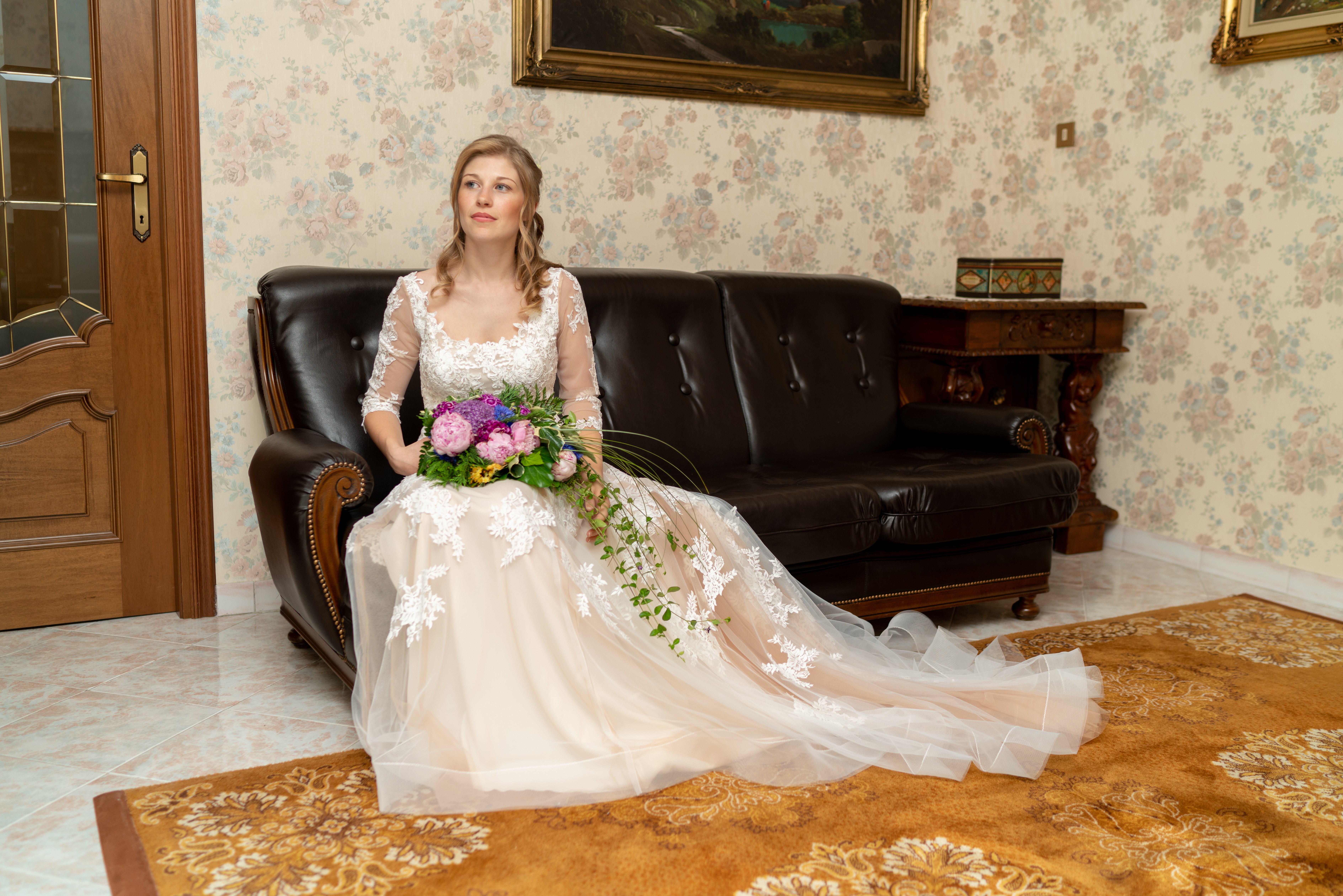 L’abito scende morbido sui fianchi con un elegante ricamo di fiori. Ampio scollo sulla schiena e strascico. Manica a 3/4 con disegni in pizzo.