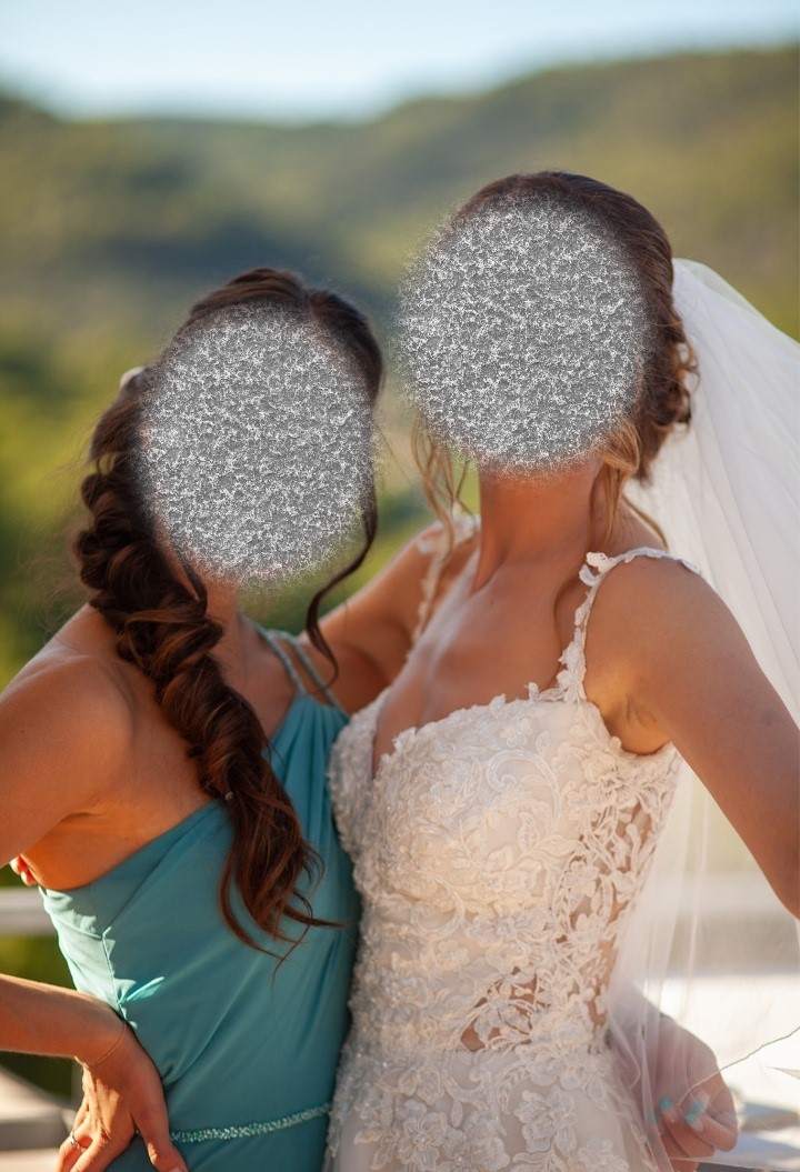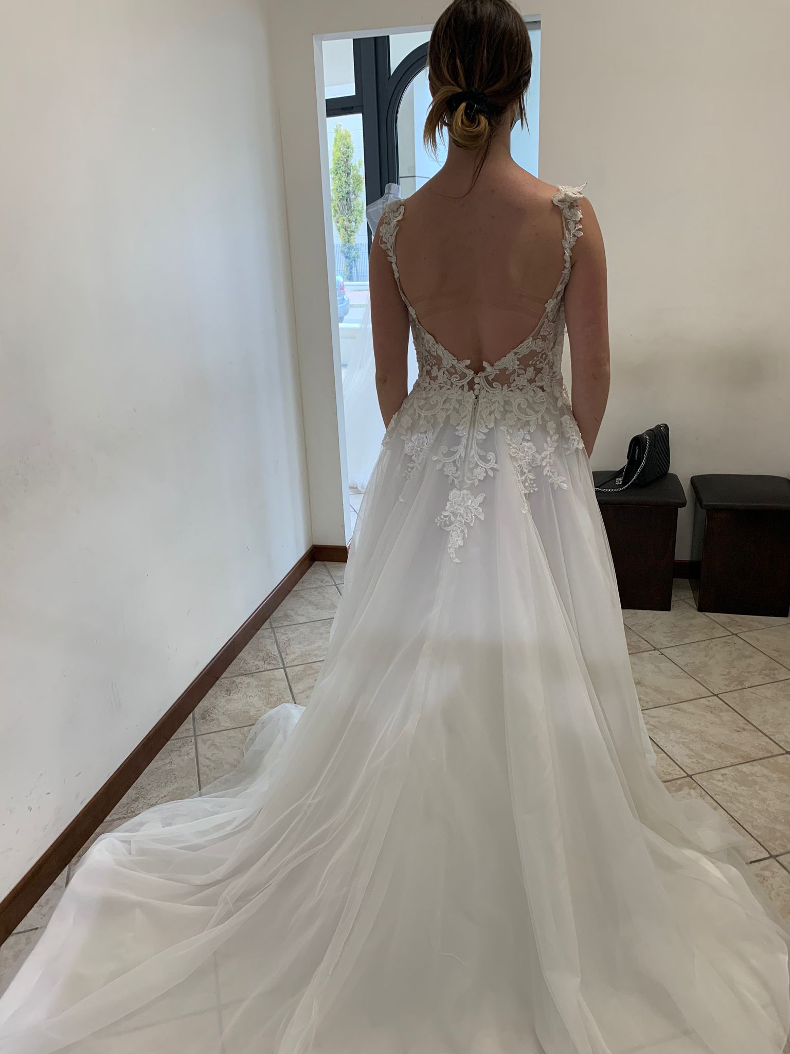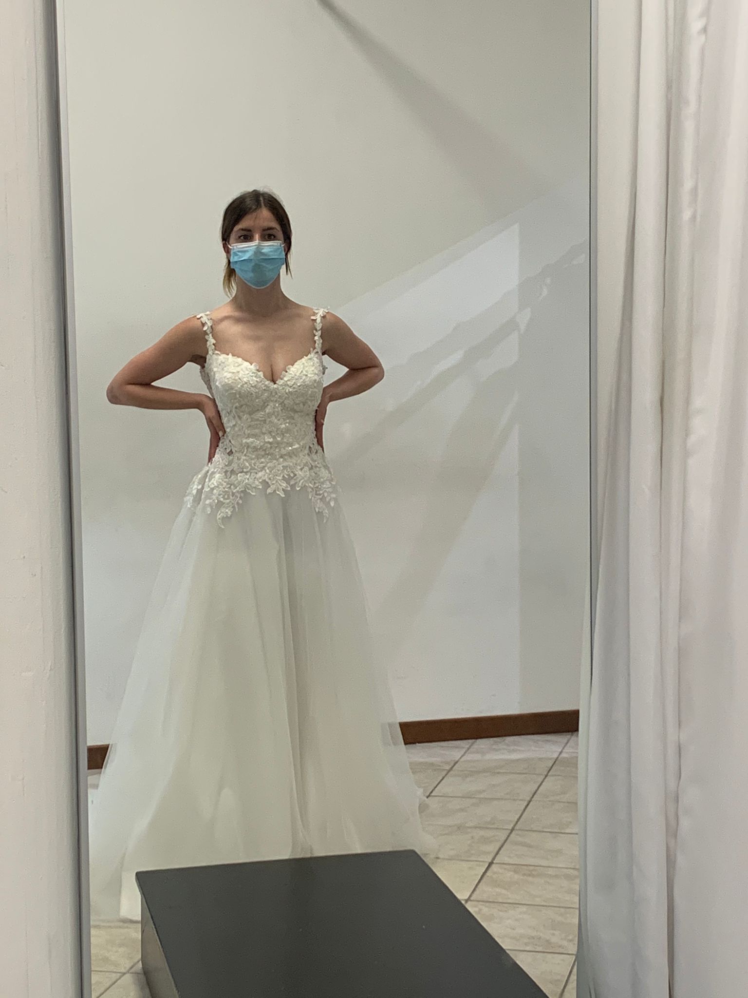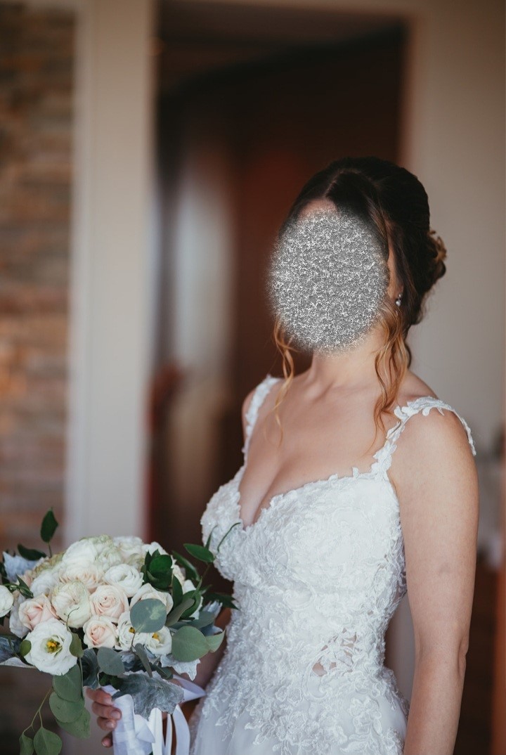 Vendo romantico e bellissimo abito da sposa marca Nicole Milano collezione Jolie. Abito stile A-line con coda, indossato a settembre 2021. L’abito è scivolato con un bellissimo corpetto in pizzo con scollo a cuore e inserti di pizzo che arrivano fino all’inizio della gonna, coppe imbottite e un sensuale scollo a V. La gonna in tulle rende l’abito scivolato molto leggero ed elegante. Inoltre il corpetto crea un bel punto vita.