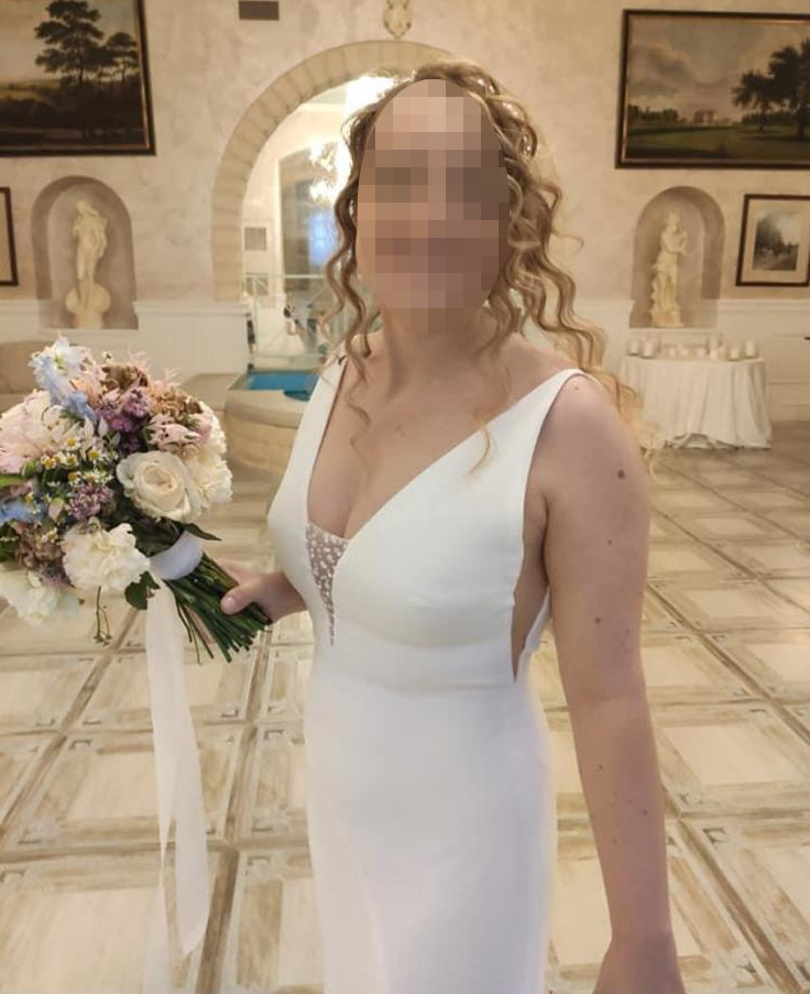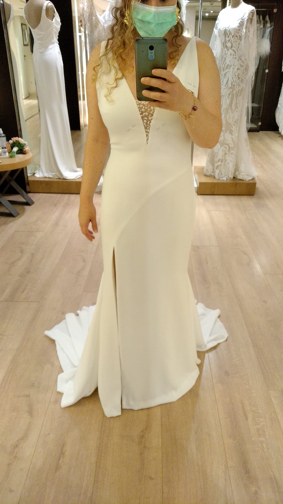 Abito da sposa Pronovias (taglia italiana 42) a sirena con scollatura a V e tessuto in crepe, gonna con spacco, apertura sulla schiena a punta.