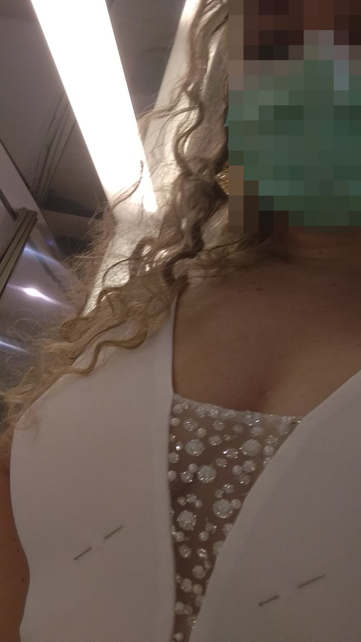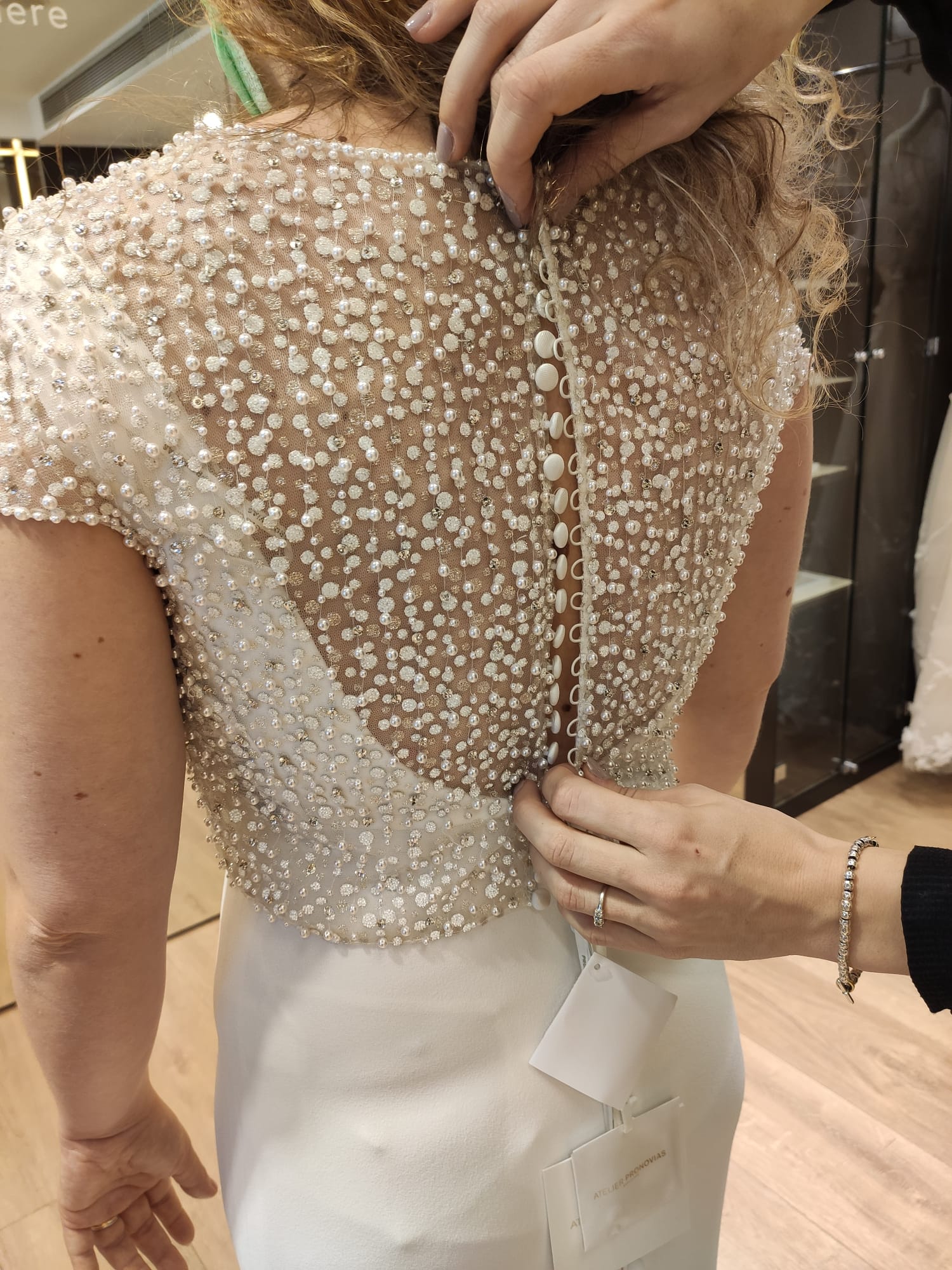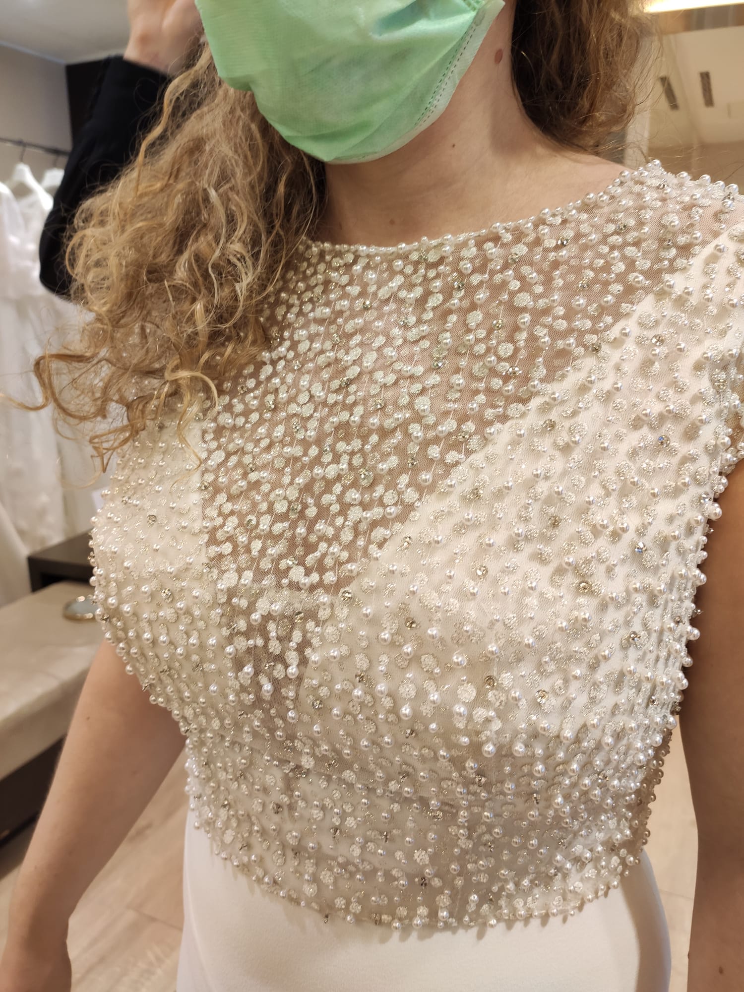 L’abito color panna, praticamente come nuovo, fa parte della collezione sposa “Blue Moon 2020” ed è stato così personalizzato su misura: dettaglio di punti luce e perline sul decolleté (dotato di comode coppe color carne), aggiunta di un copri spalle a manica corta removibile al bisogno, completamente ricoperto anch’esso di eleganti perline. Con coda accorciata particolarmente comoda (usato come secondo abito per serata danzante). Già lavato e stirato.