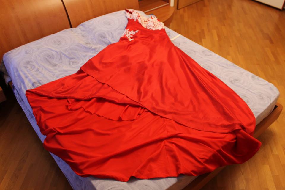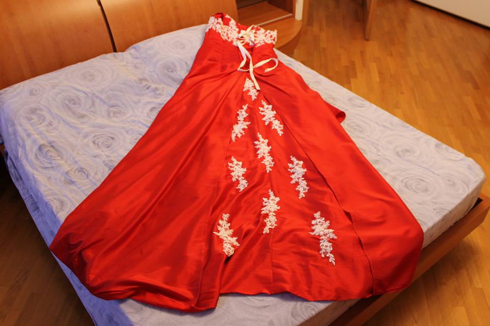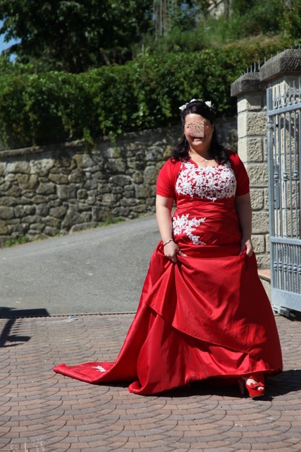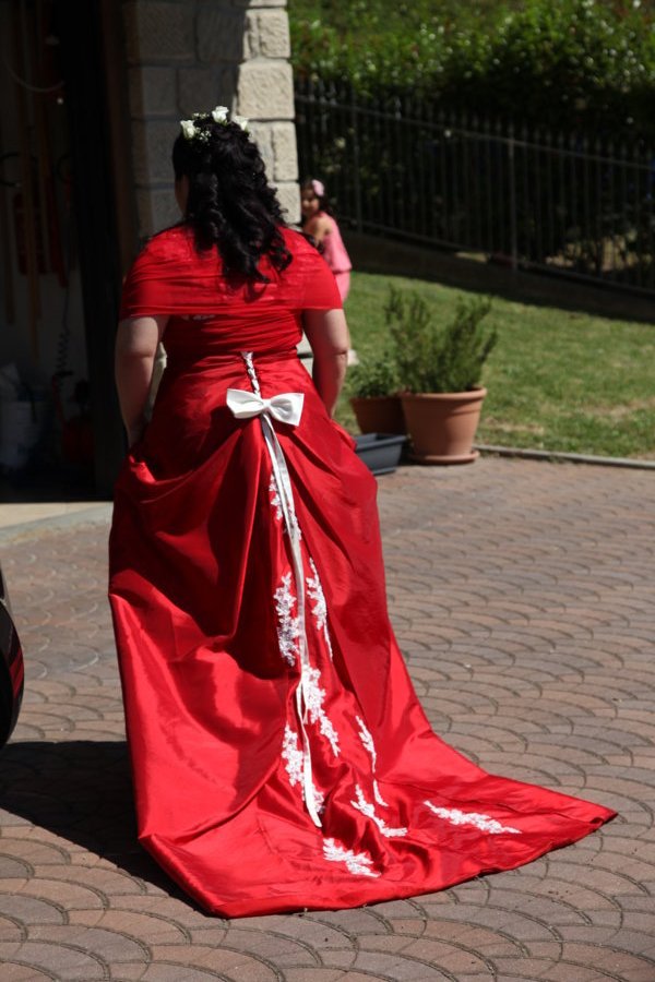 Abito da cerimonia, sposa taglia 50 color rosso e usato una sola volta e rilavato in lavanderia, completo di custodia, stola/coprispalle, in più ha un fiocco staccabile e riposizionabile.