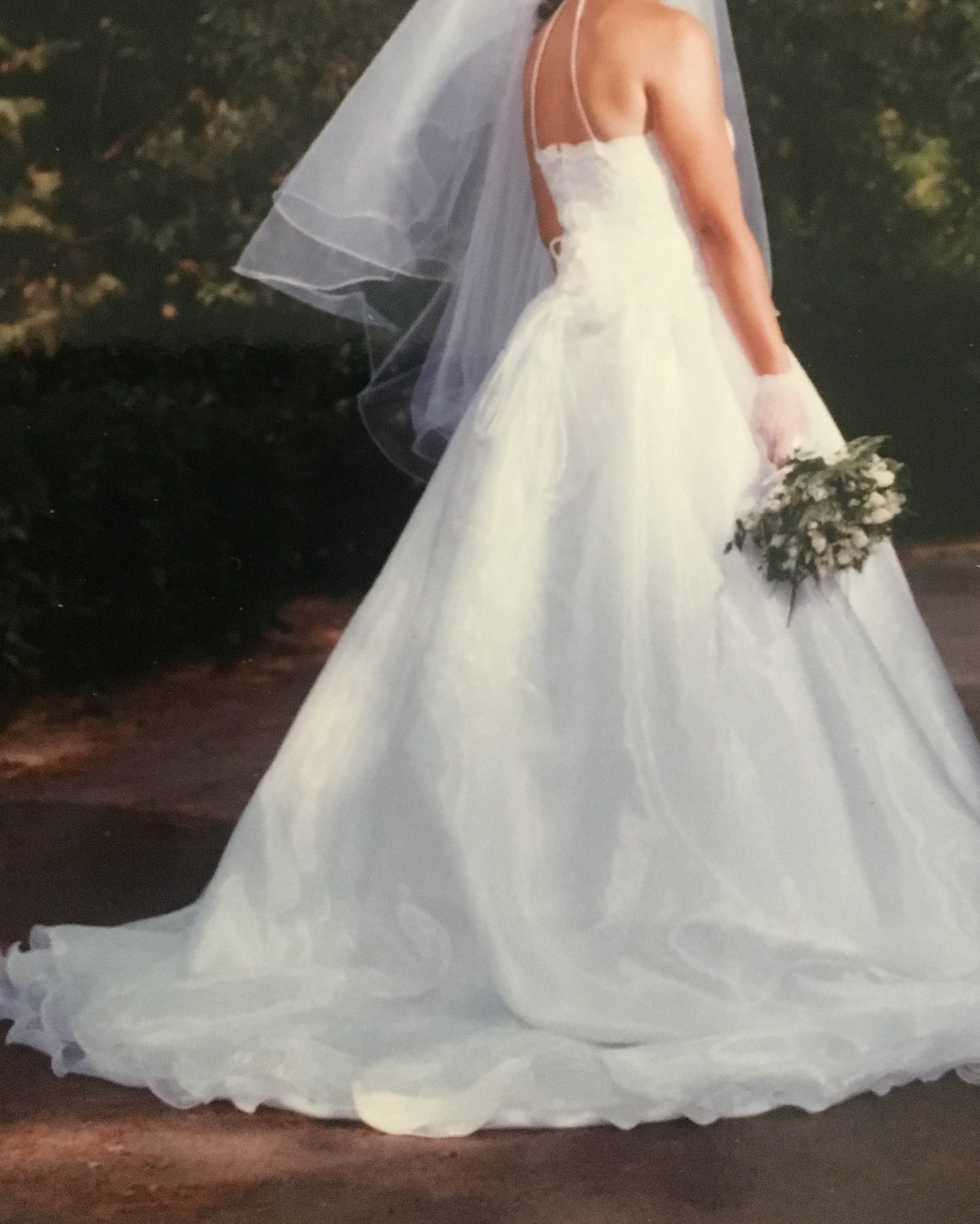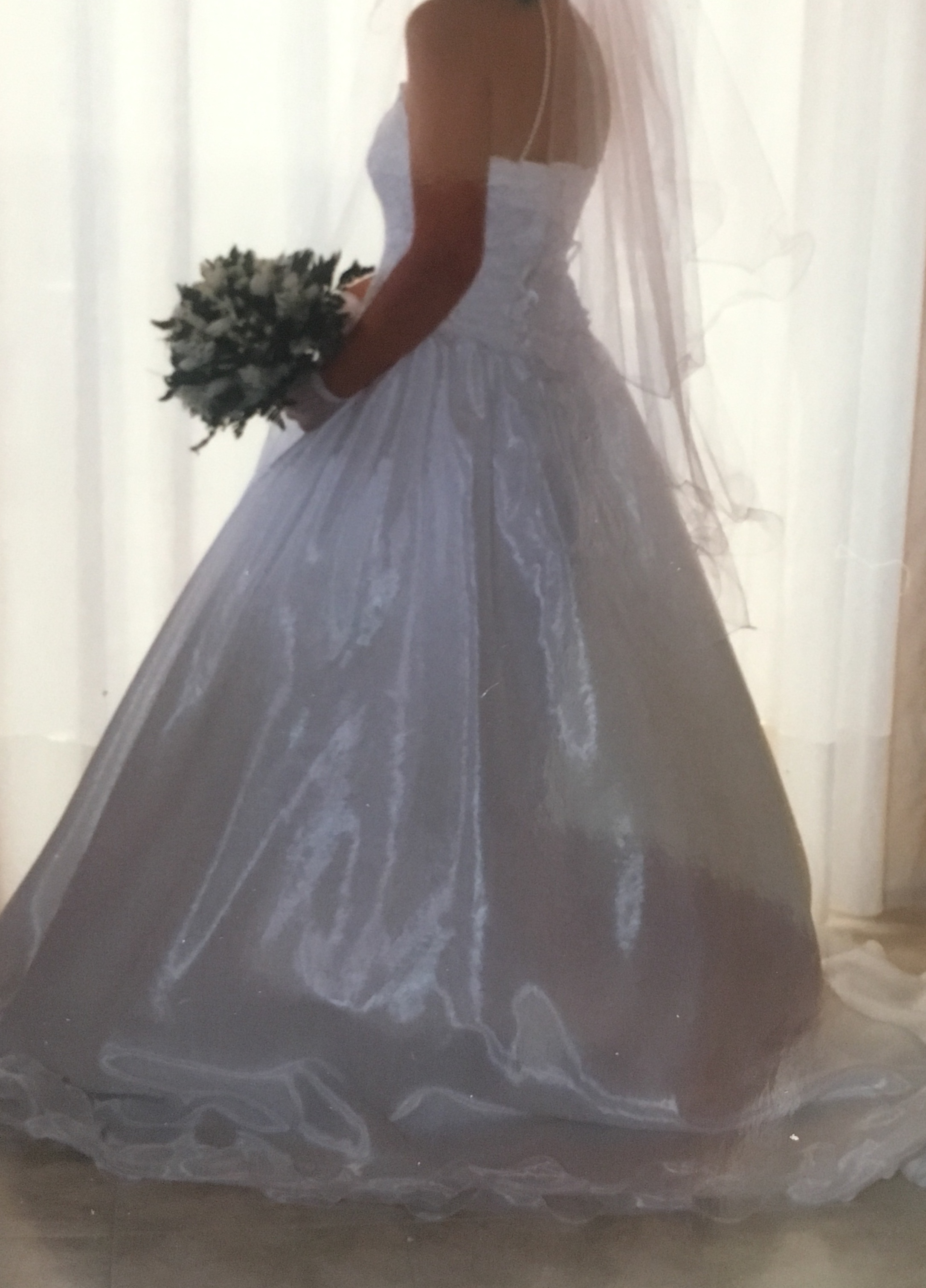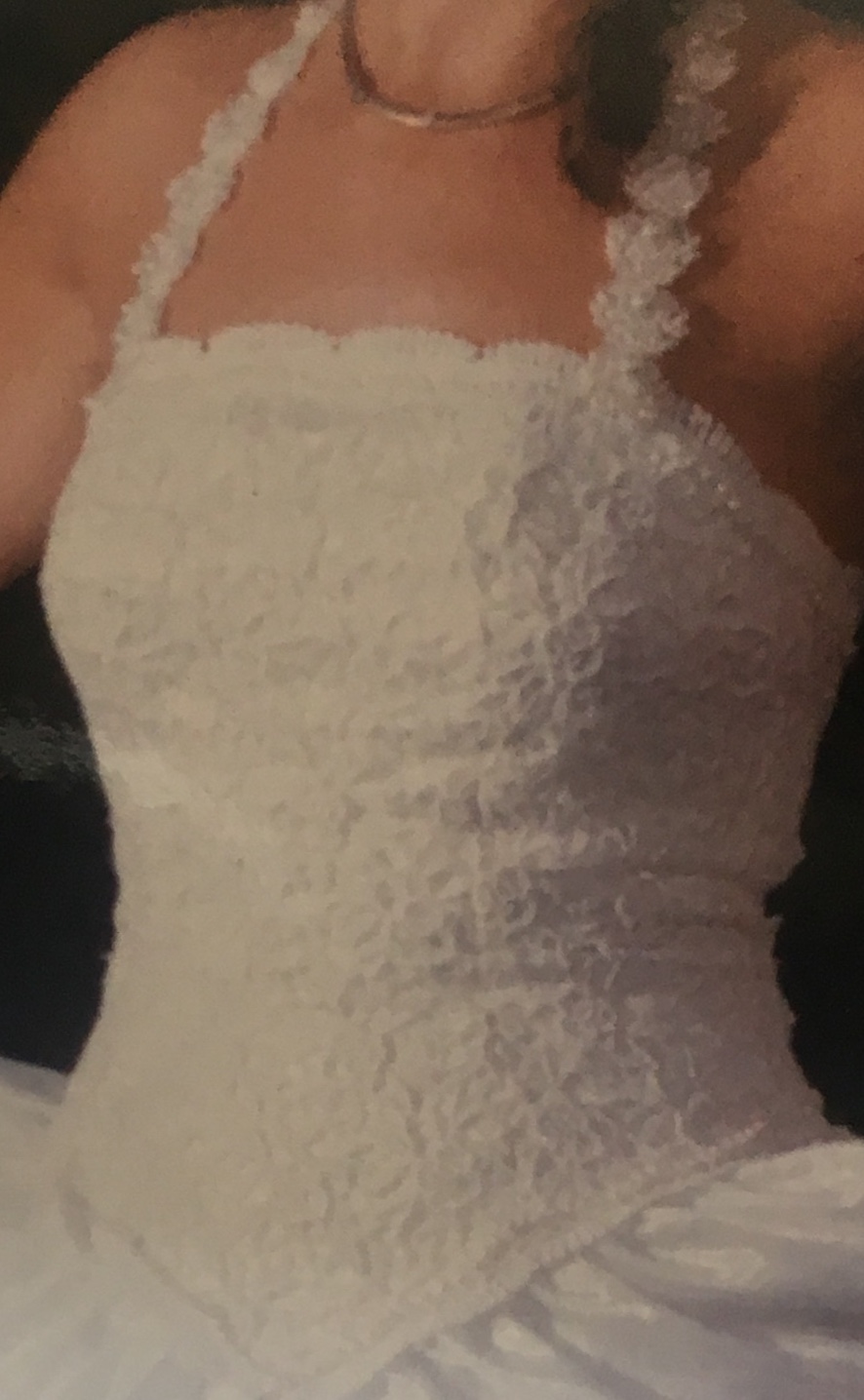 Abito sartoriale in pizzo e chiffon. Usato ma in perfette condizioni. Bretella davanti formata da fiori di perle.