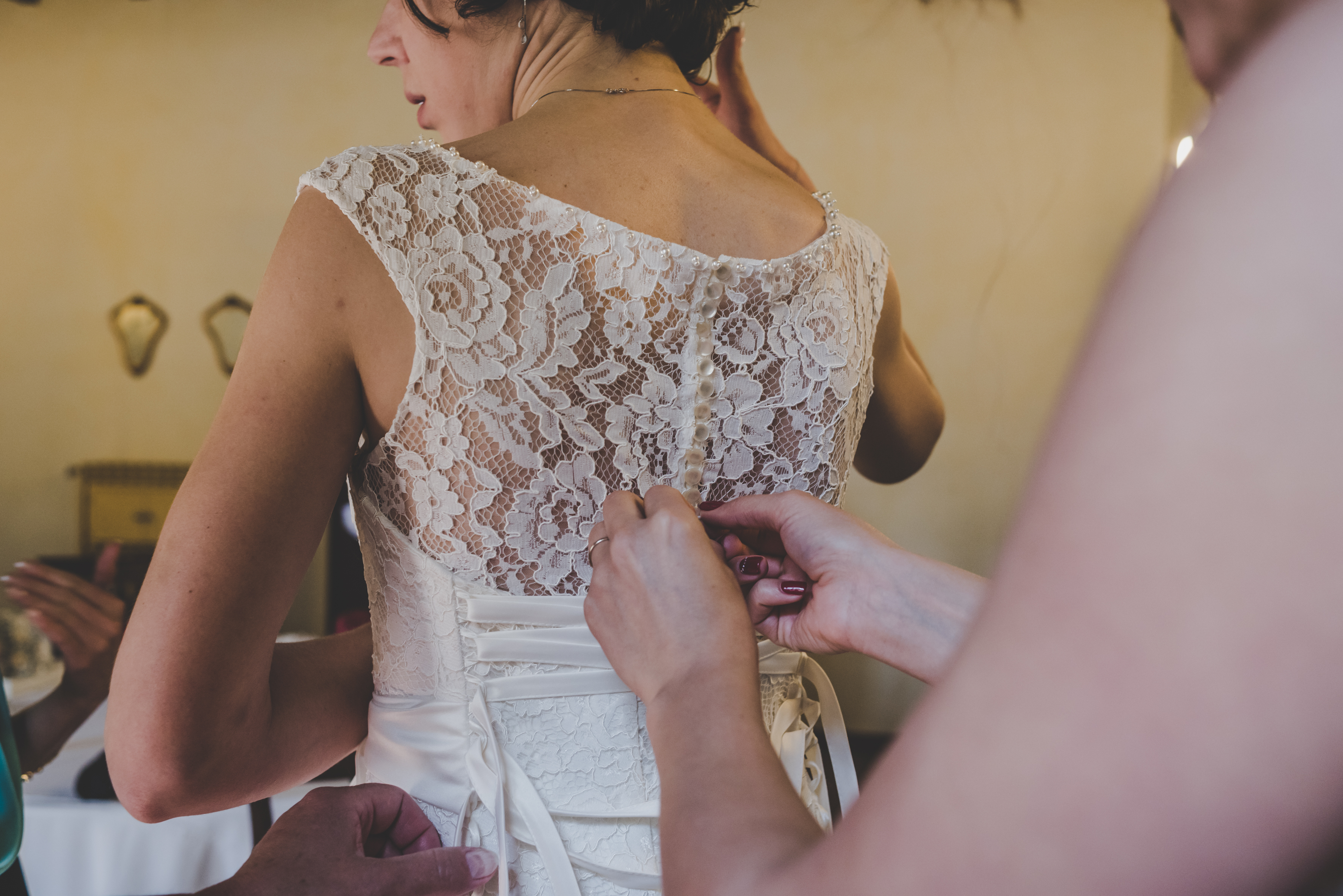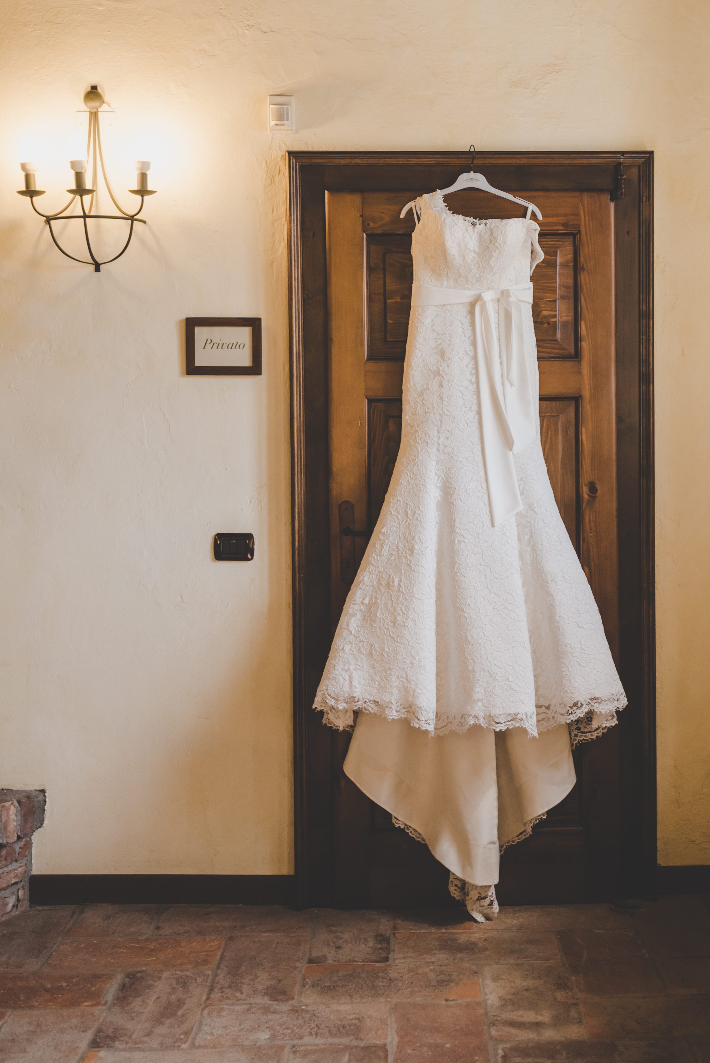 A’abito è una splendida siluette sirena è realizzato interamente in delicato pizzo, è fluido, semplice ed estremamente raffinato. Ricamato sul collo con una fila di perline. Ha una fila di bottoncini a perlina, che percorrono tutta la schiena. La gonna scampana con la legera coda, che sfiora il pavimento, dona slancio alla figura.
