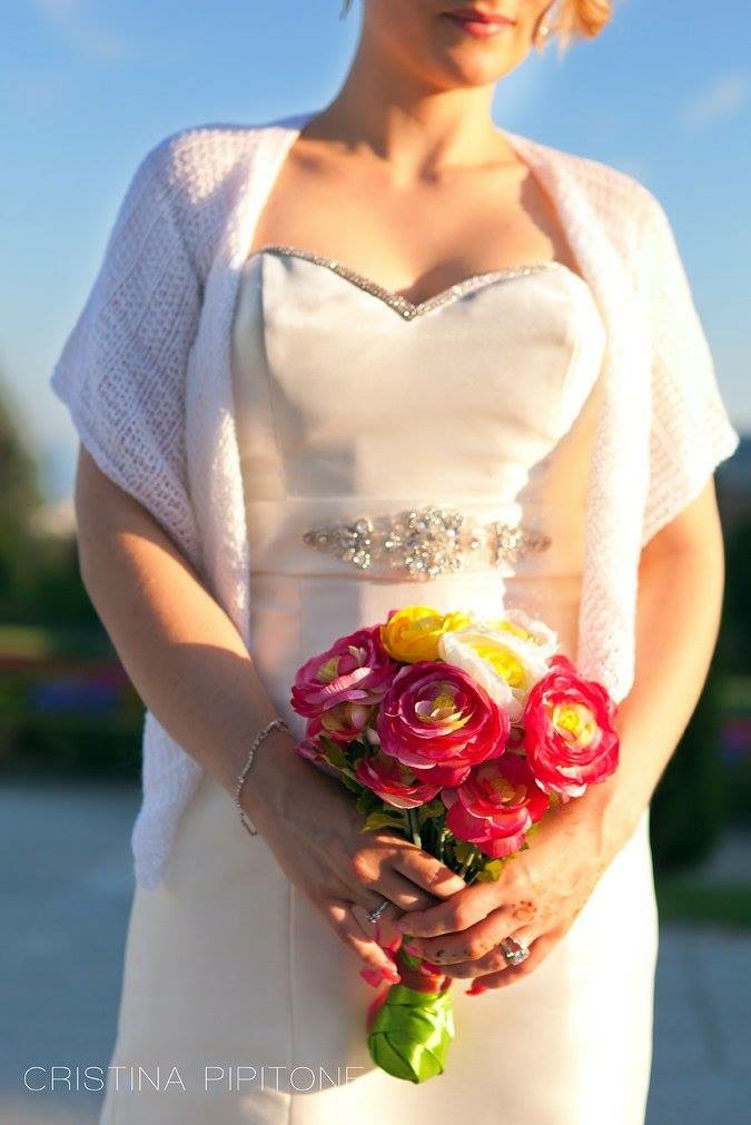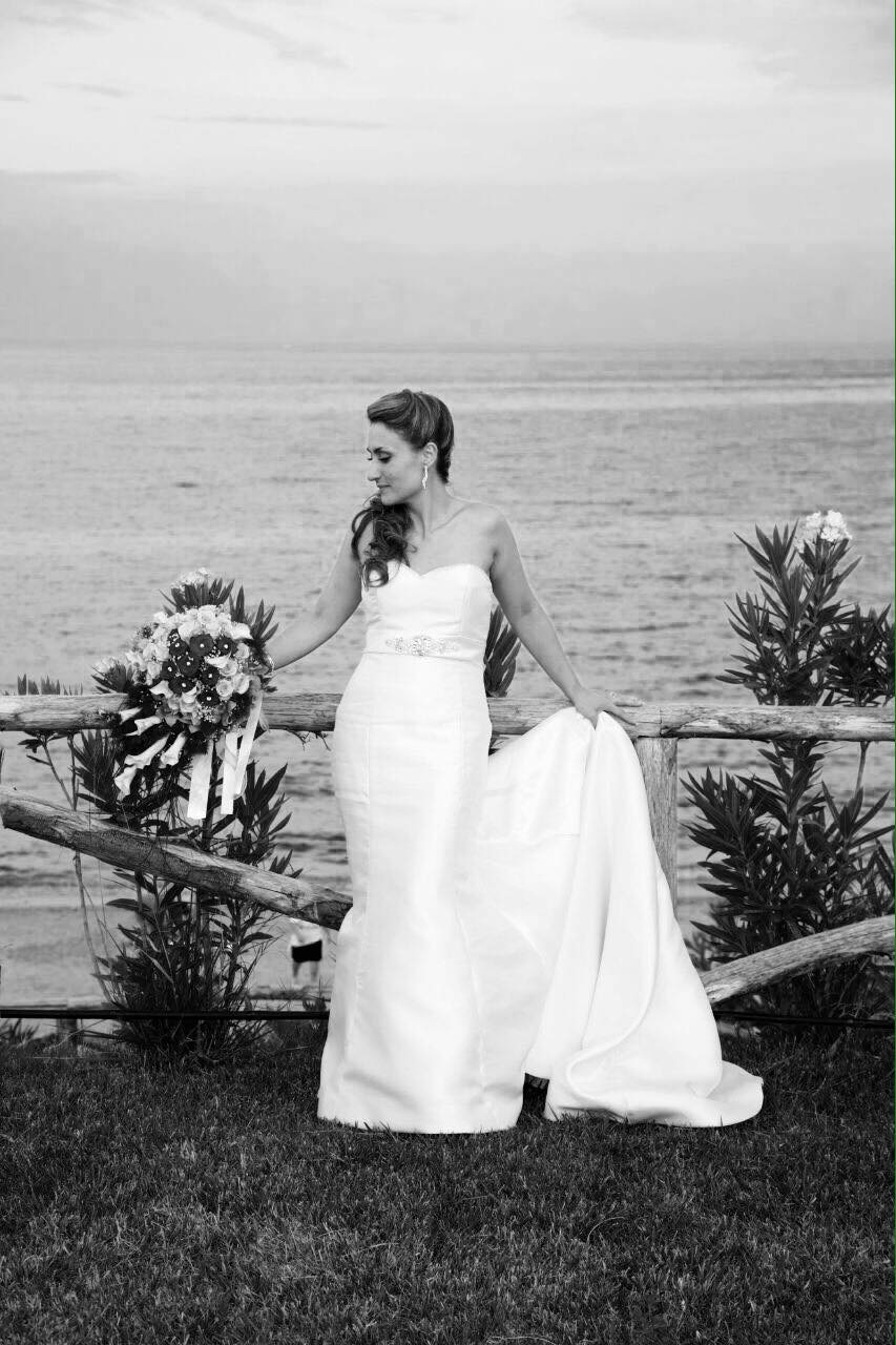 Abito Sartoriale di Atelier (pezzo unico) in pura seta di Micado, stile sirena senza spalline e con scollatura a cuore ricoperta sul bordo da Swarovskini che proseguono su tutta la scollatura retro schiena. Cinturino in vita con Swarovskini con sul retro attaccate delle rose con pendenti. Incluso di velo, giarrettiera nuova e guêpière. Abito Usato un unica volta, in buonissimo stato!