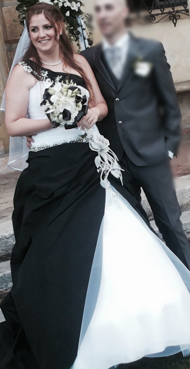 Abito utilizzato una volta tenuto in maniera maniacale completo di velo e guanti….è interamente realizzato in raso di seta e tulle, il ricamo e il fiore applicato sono fatti a interamente a mano e abbelliti da punti luce in cristallo …il vestito è un pezzo unico