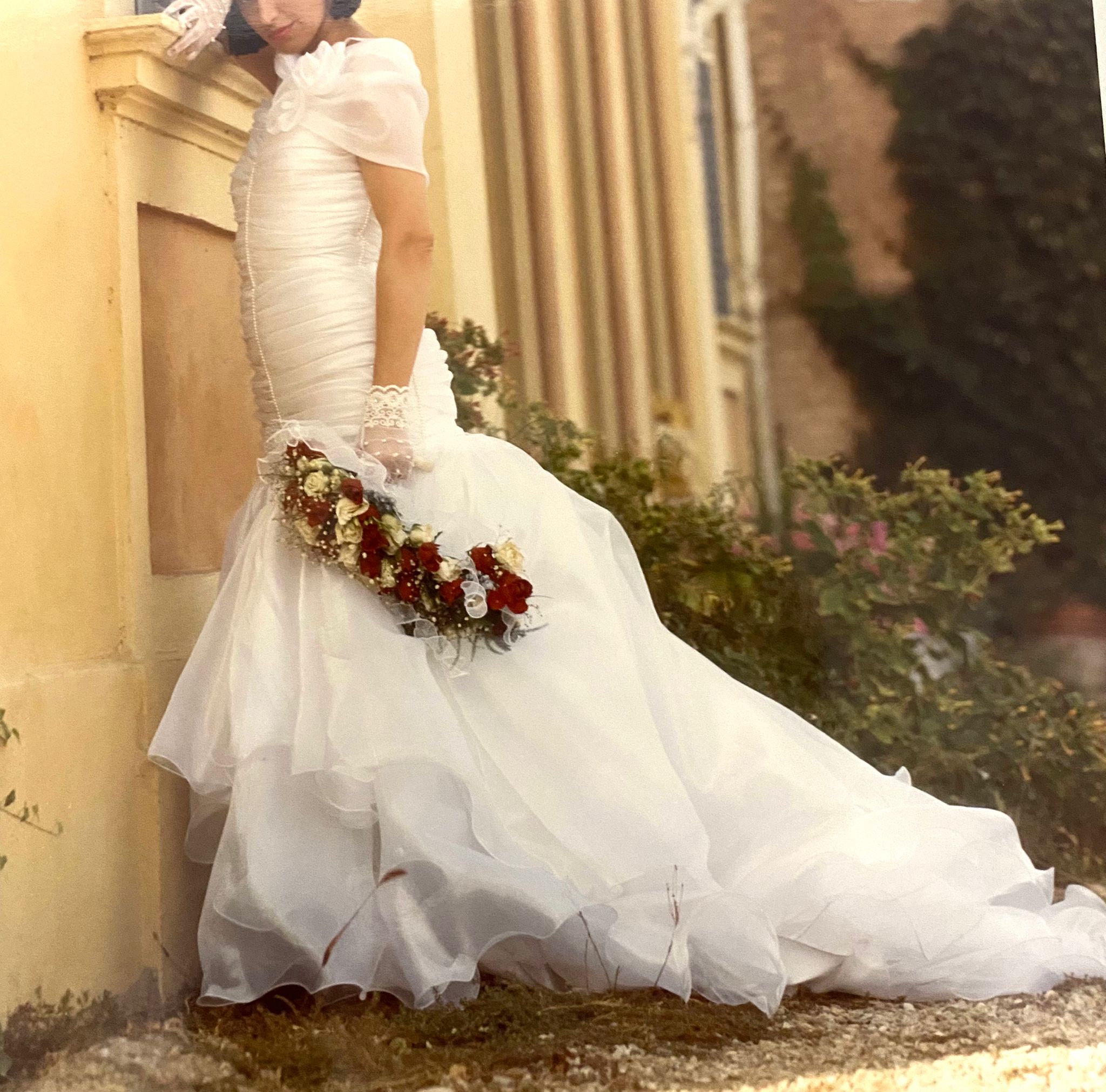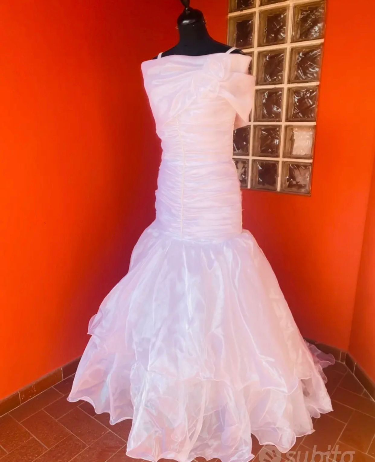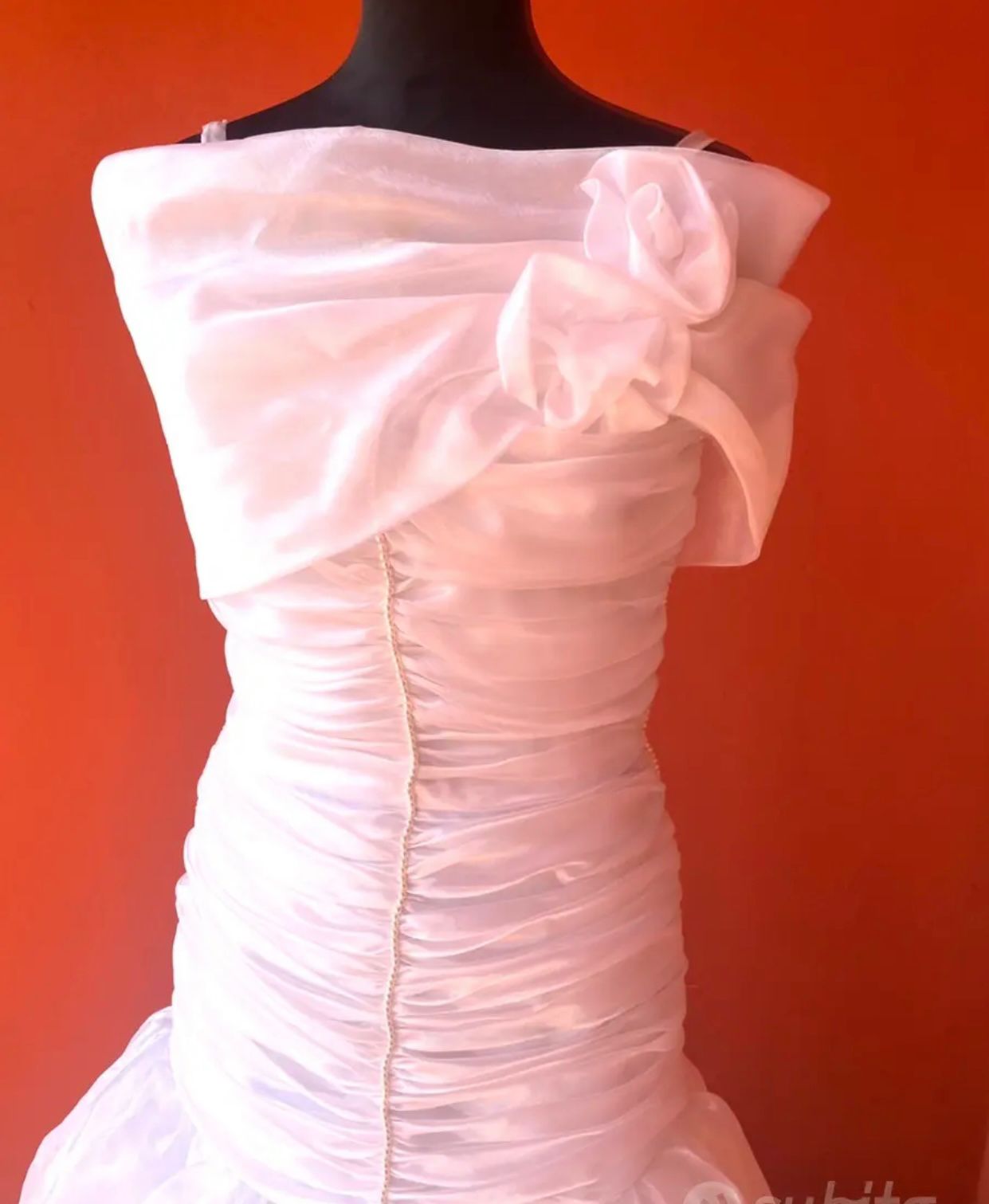 Abito delizioso fasciato in vita allargandosi dai fianchi in giu’ con più’ strati di organza, l; abito ha la coda anche se non lunghissima.
