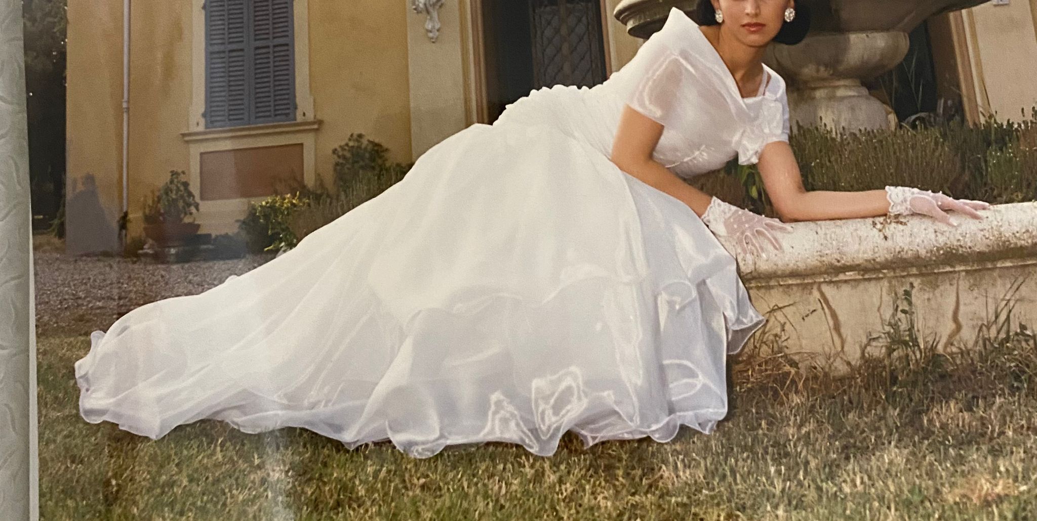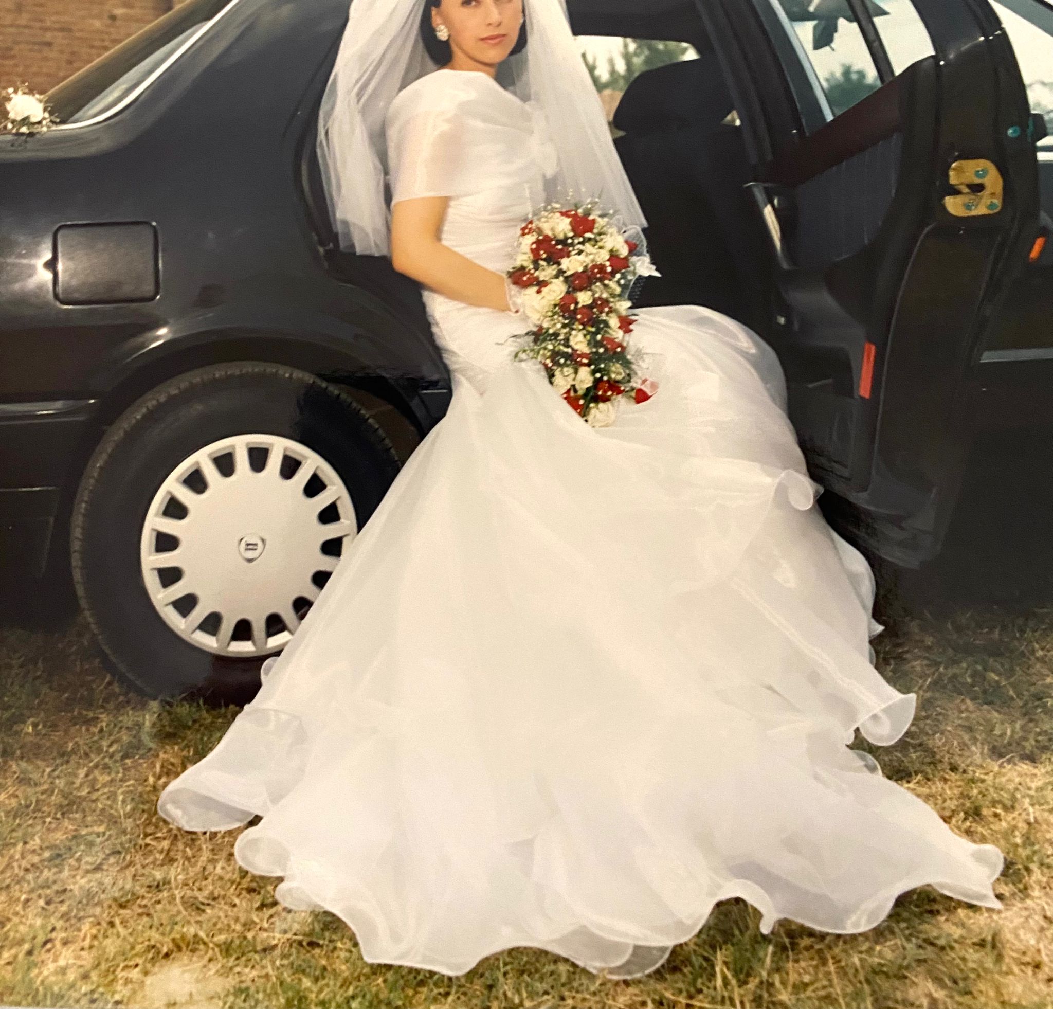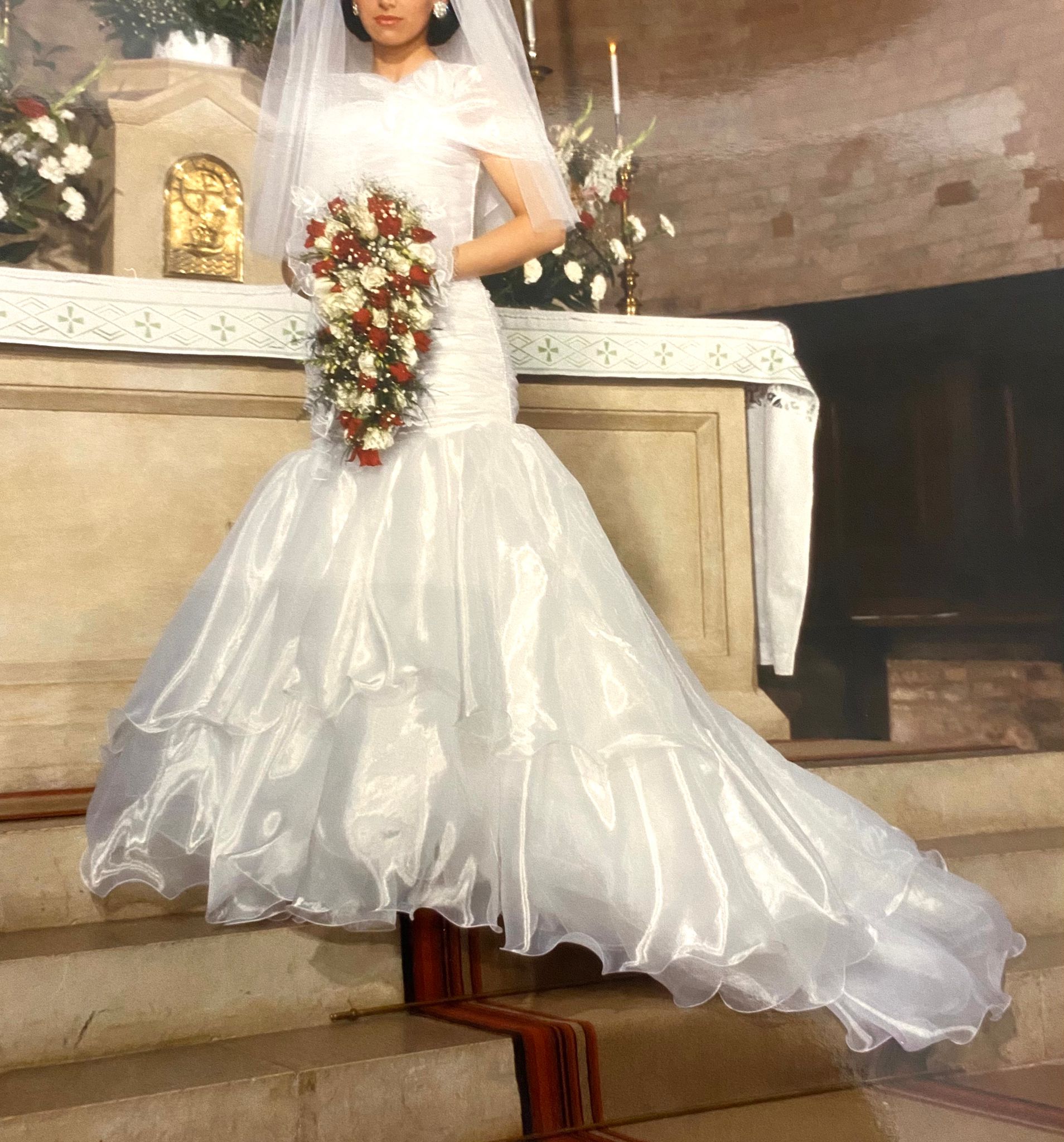 Abito delizioso fasciato in vita allargandosi dai fianchi in giu’ con più’ strati di organza, l; abito ha la coda anche se non lunghissima.
