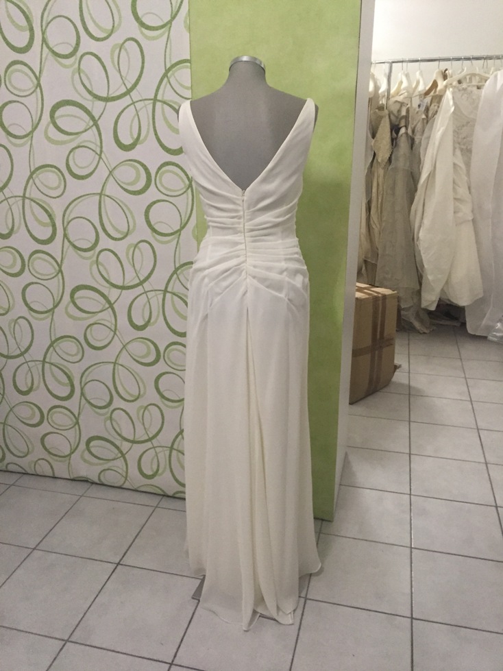 Ha un drappeggio su un lato che crea uno spacco che da libertà di movimento