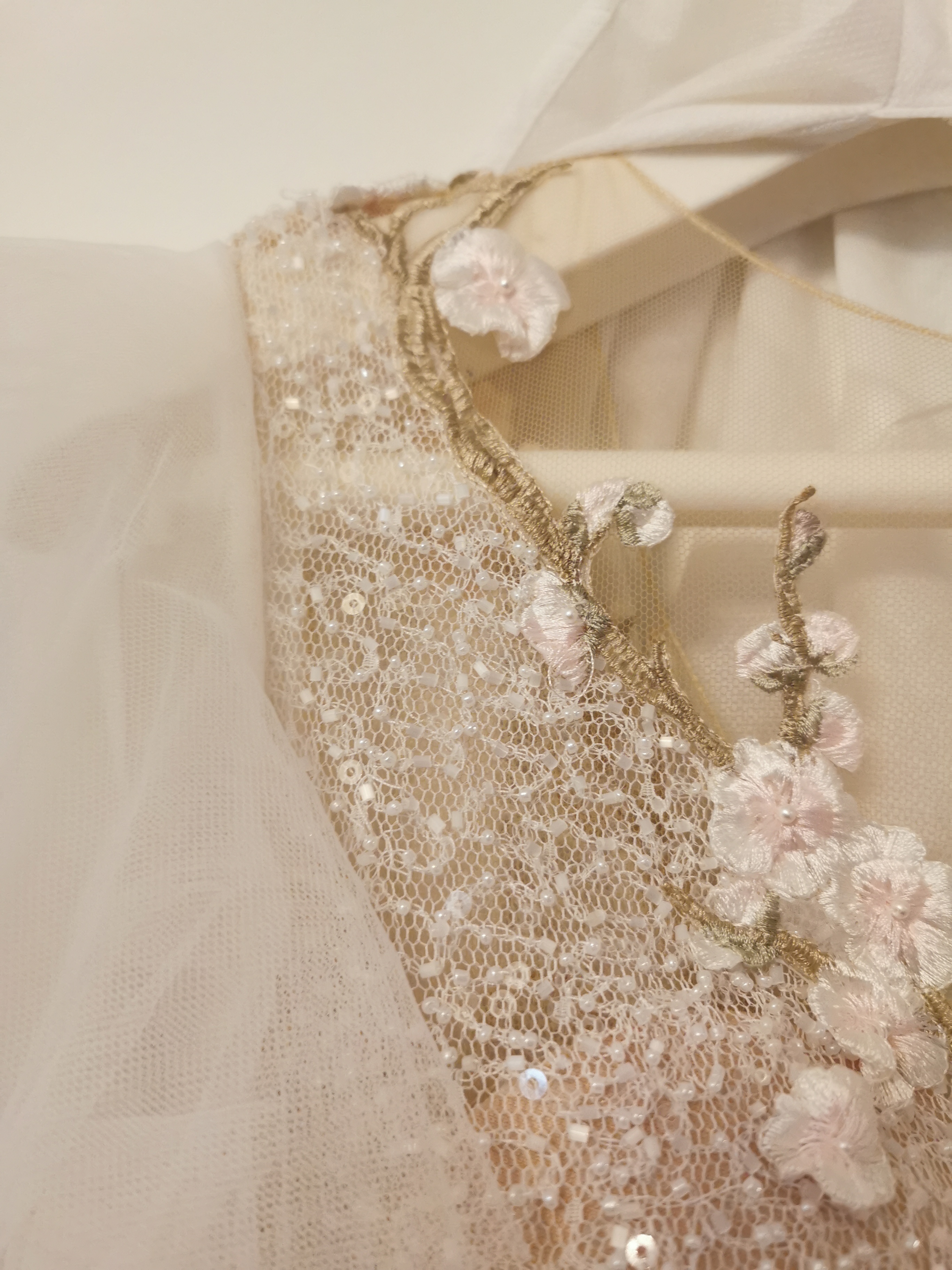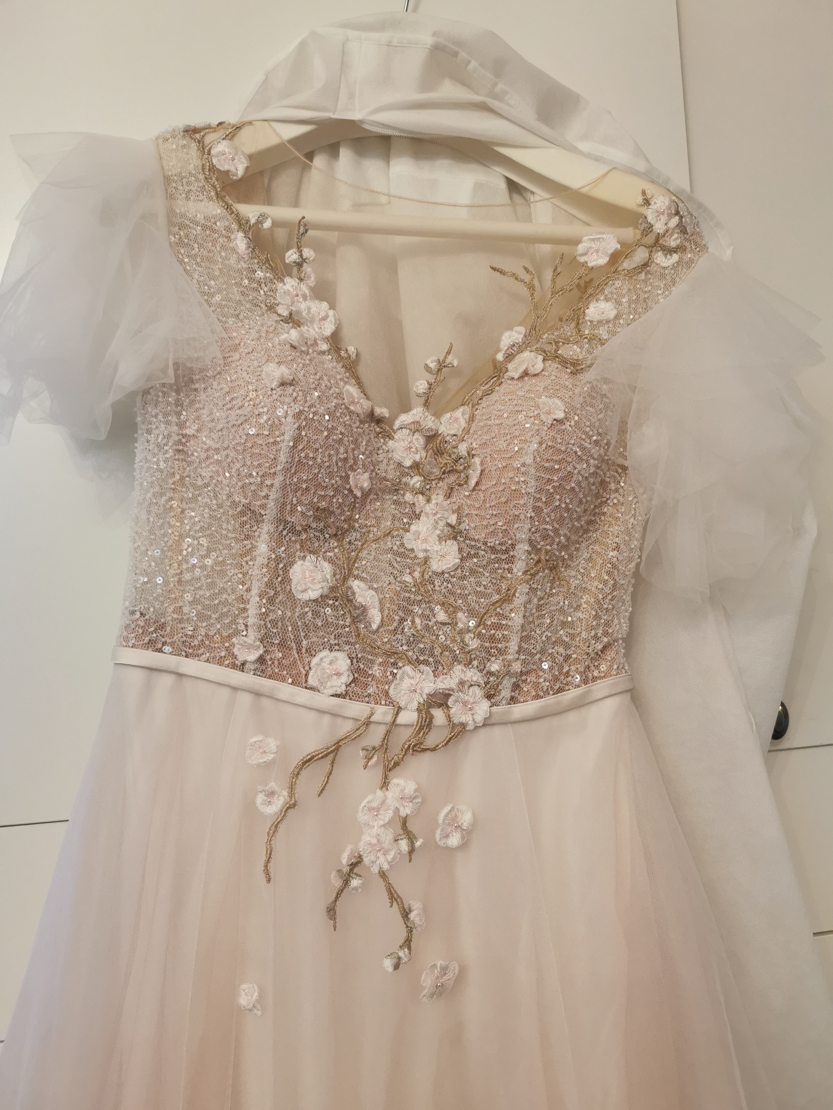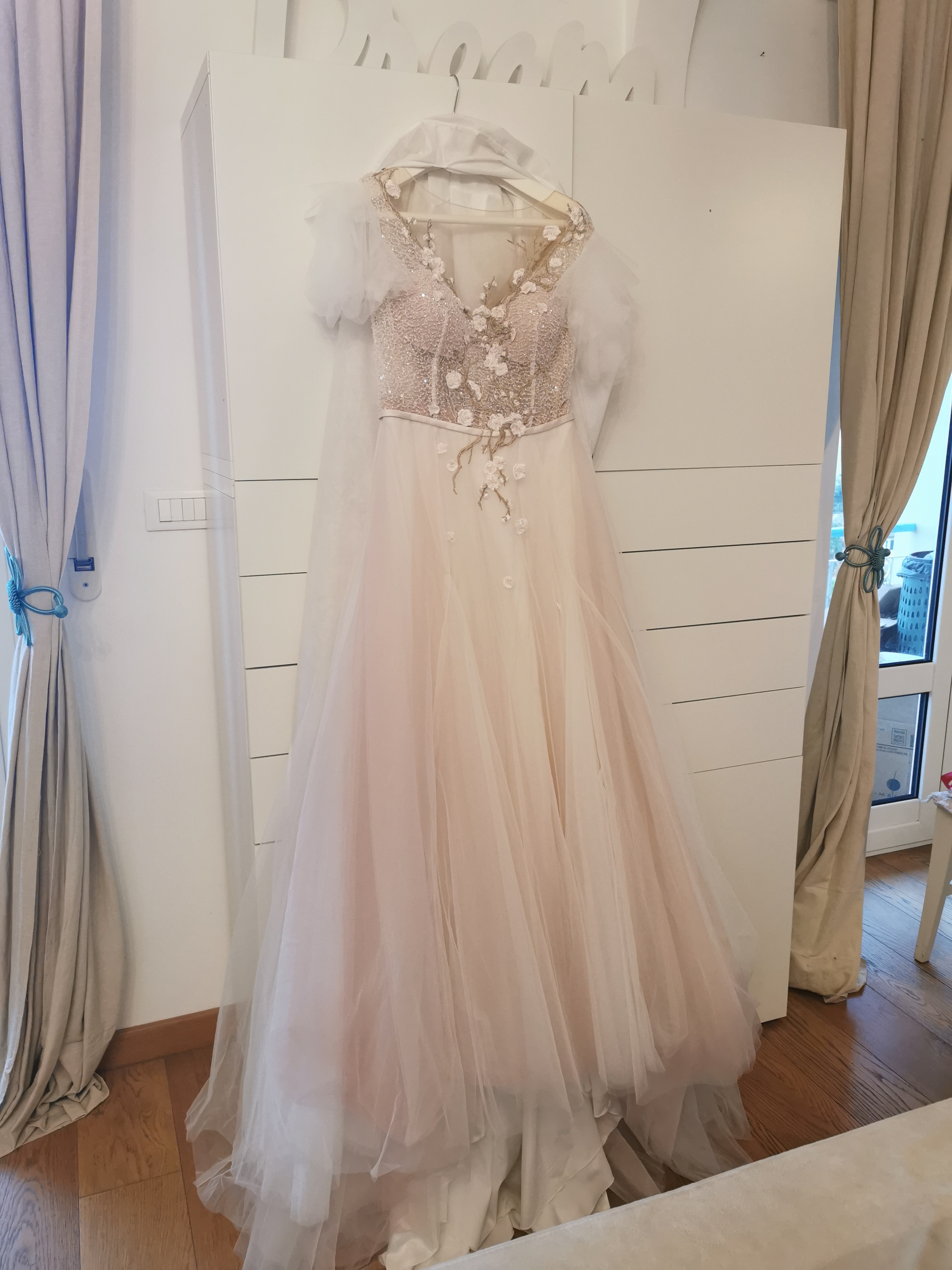 Vendo il mio splendido abito da sposa, come nuovo già lavato in tintoria. L’abito presenta un corpino ricamato con fiori e perline, tagliato in vita e gonna ampia in tulle doppio strato bianco e rosa cipria. Taglia 42/44 veste fino a una 46 asciutta. Orlo preso su una figura alta 1.60 con tacco 10. Bellissimo abito di grande effetto, leggero e confortevole da indossare nonostante lo strascico. Vendo anche sottogonna con cerchio utile per agevolare la camminata.