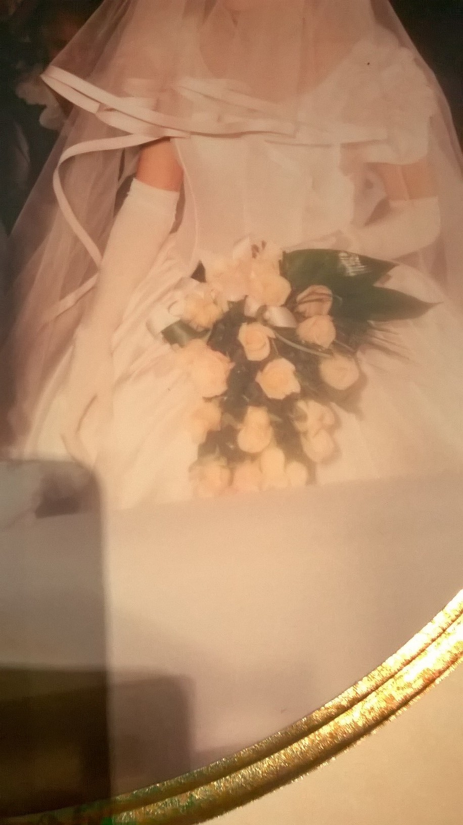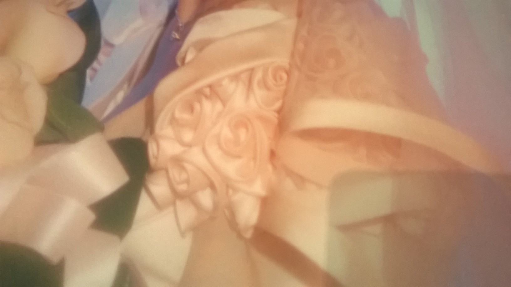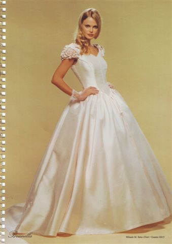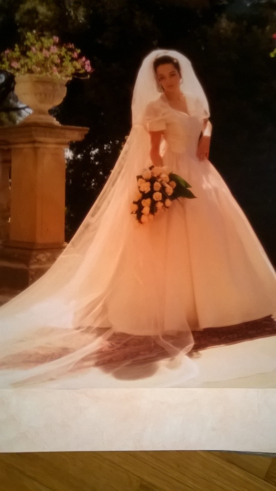 Abito in mikado di seta di un colore rosa delicatissimo. Lavato in lavanderia professionale. Completo di sottogonna. Offro, compreso nel prezzo, rose per acconciatura dello stesso tessuto dell’abito, velo con un piccolo strappo sul fondo, guanti lunghi come da foto, cuscino fedi bianco e rosa coordinato. L’abito è stato indossato nel settembre 1996 e questo è il motivo del prezzo basso rispetto al valore di acquisto.