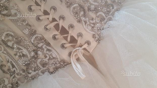 Vendo preziosissimo abito atelier aimèe, modello Clòe, tg 40-42, perfetta vestibilità grazie all’allacciatura con le stringhe ( in raso ) sulla schiena. Corpetto steccato in tulle, ricamato a mano con cristalli swarovsky, ampia gonna in tulle stile principessa Sissi.