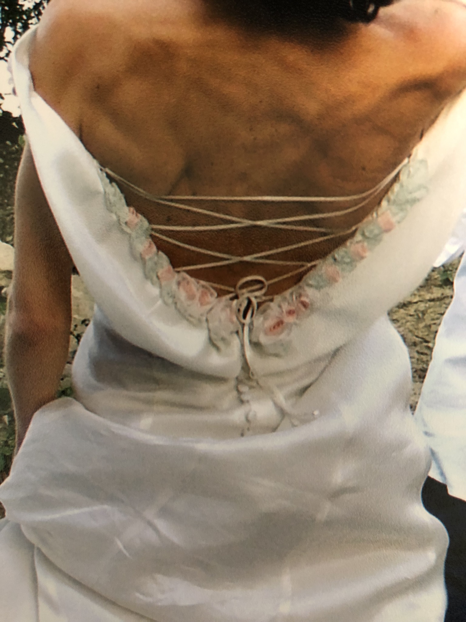 Abito in Raso di seta con roselline di seta applicate sullo scollo e in aggiunta per decorazione acconciatura