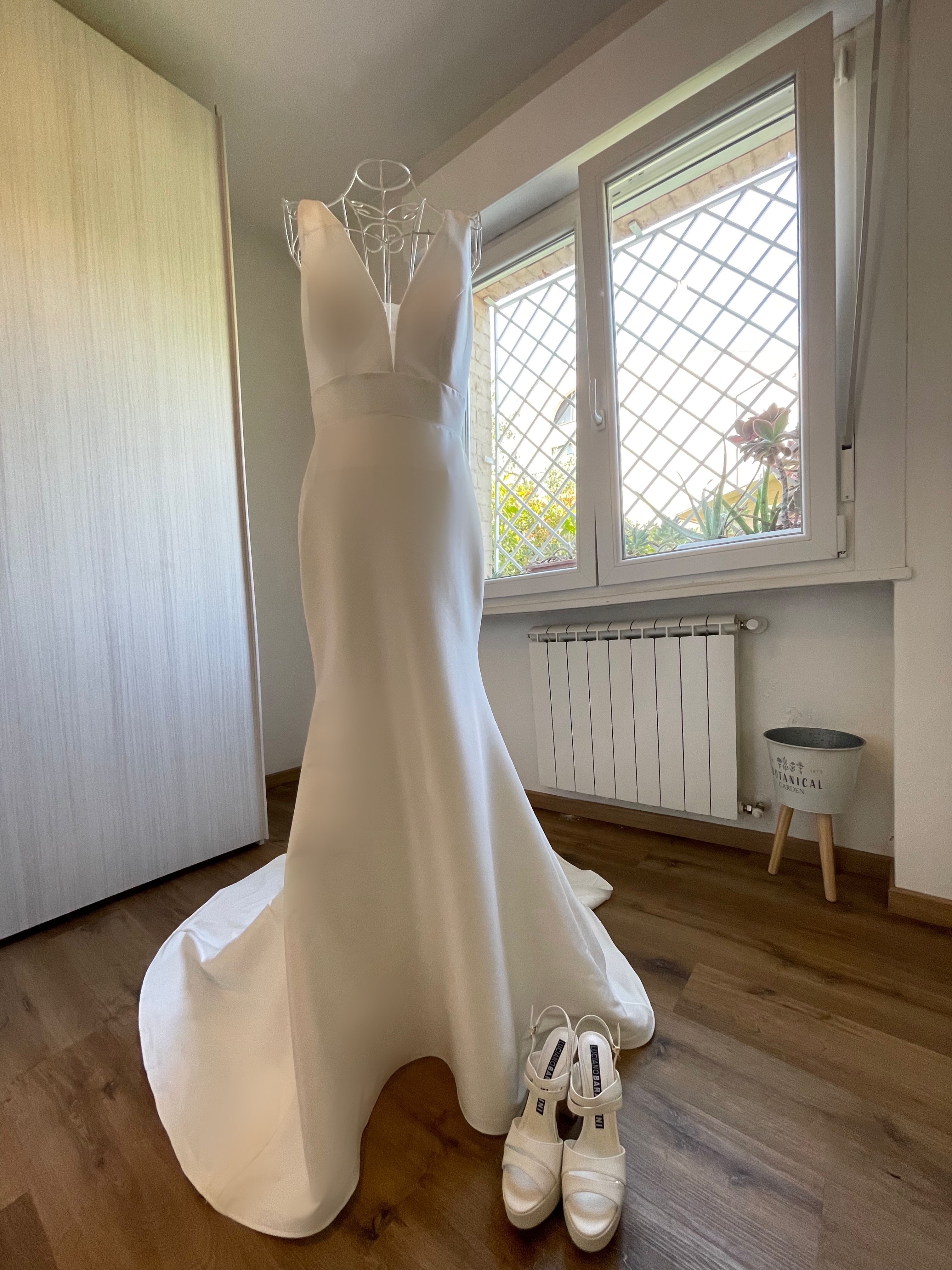 Realizzato in mikado elastico, è un’opera d’arte di sensualità ed eleganza per un matrimonio classico di gusto contemporaneo.