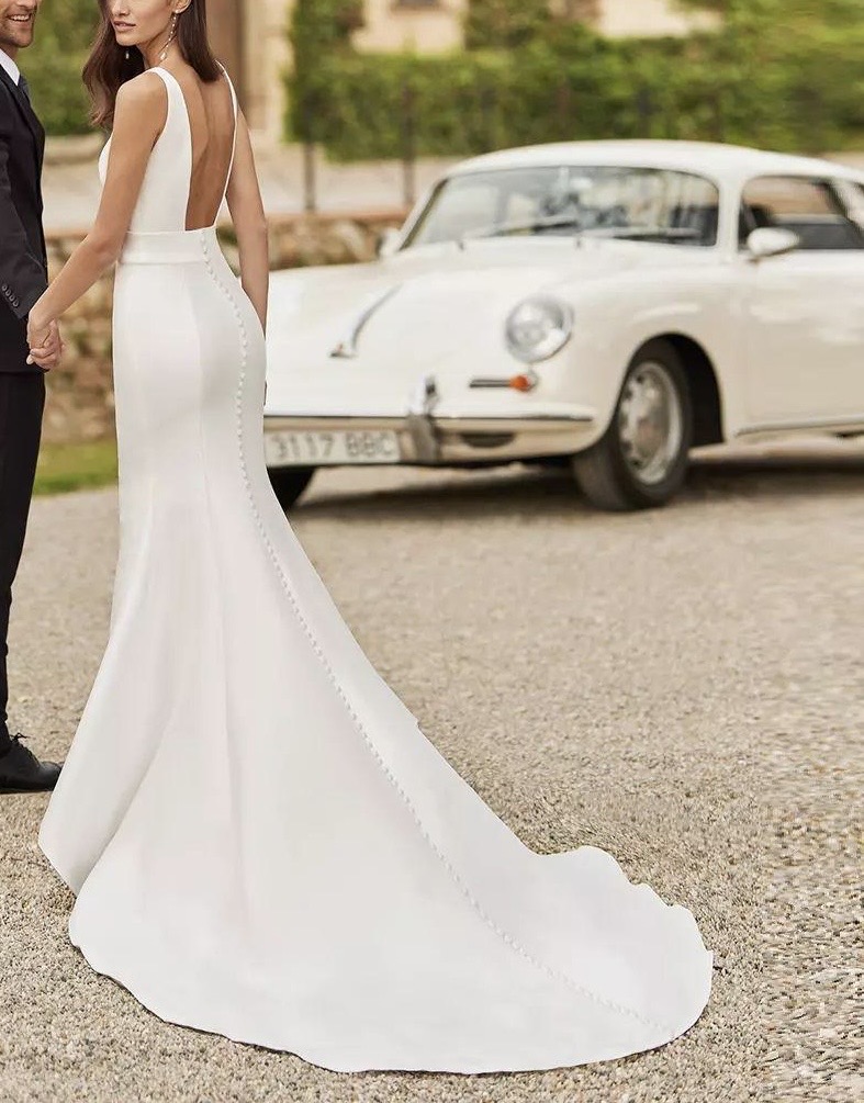 L’abito da sposa modello sirena di Aire Barcelona incanta con il suo design sensuale. Il decolleté profondo a V e la schiena scoperta aggiungono un tocco audace al look glamour.