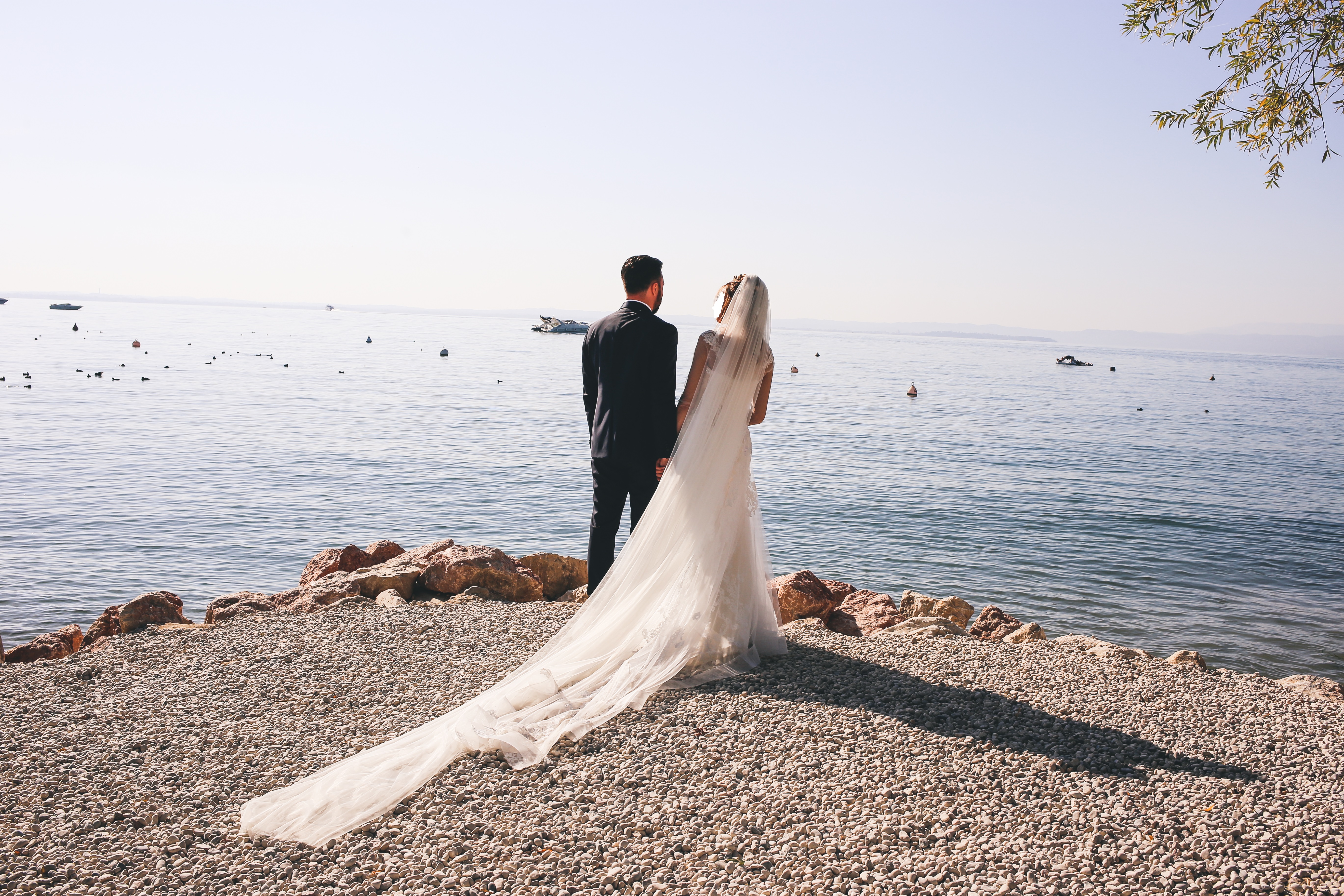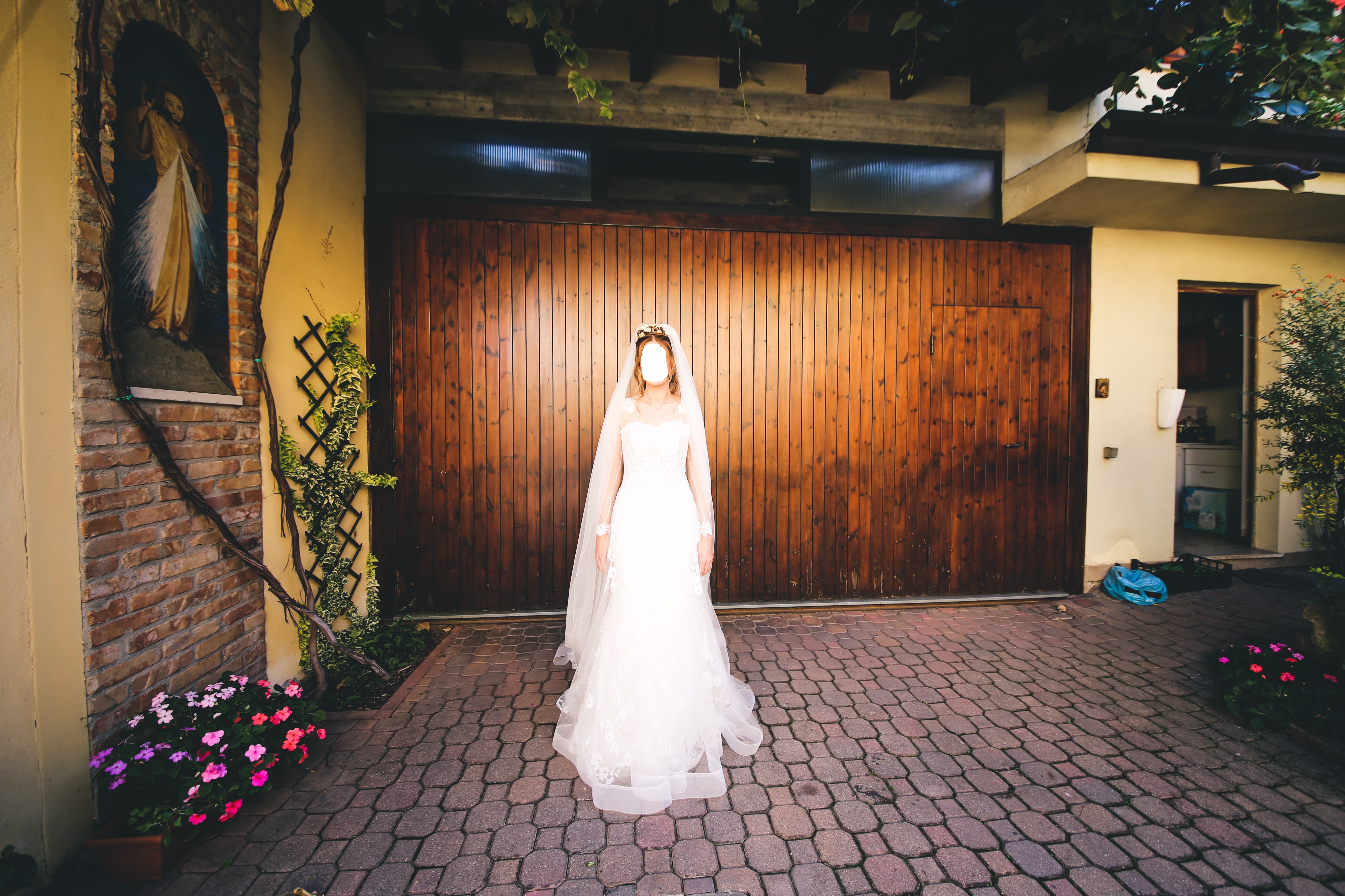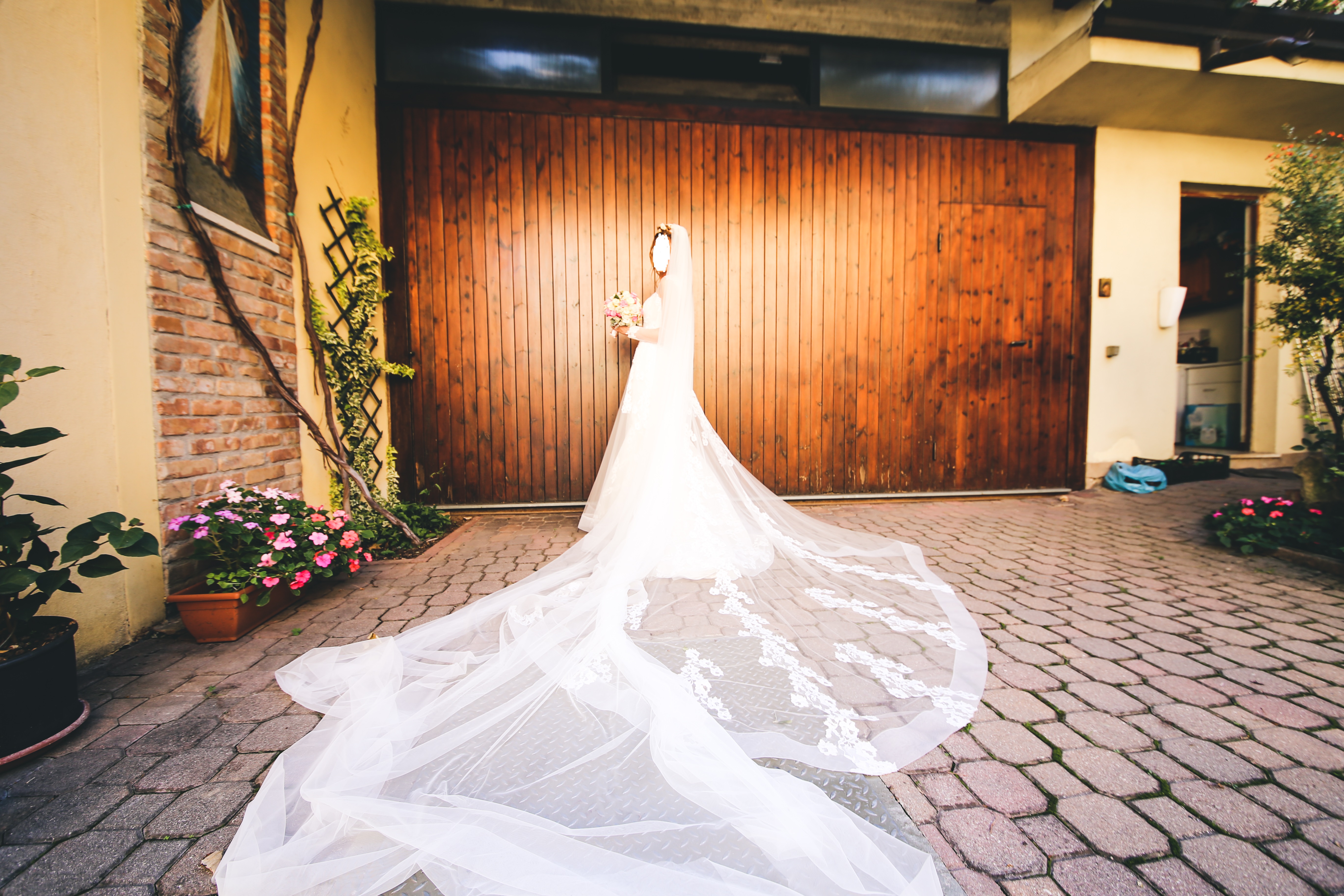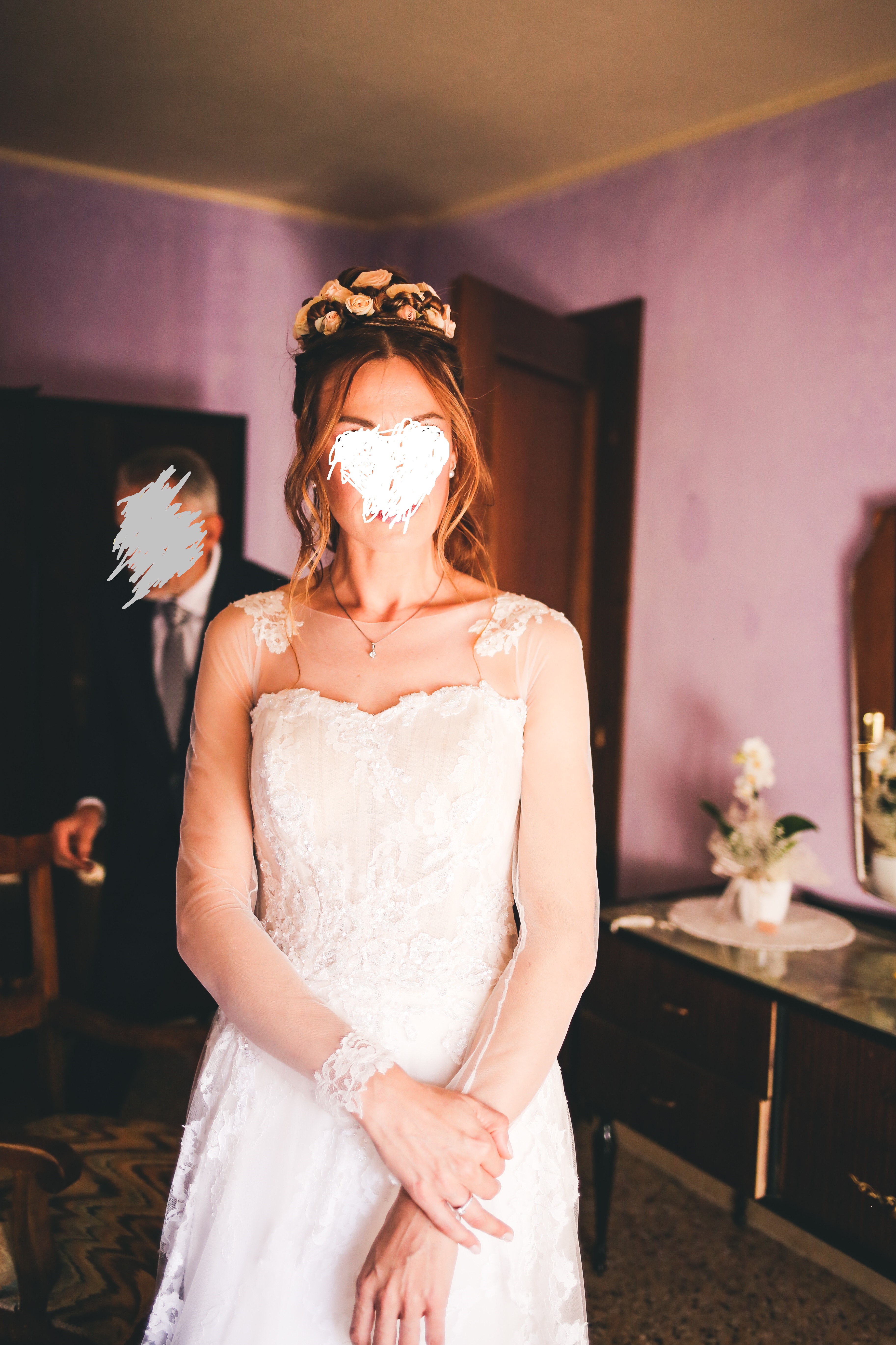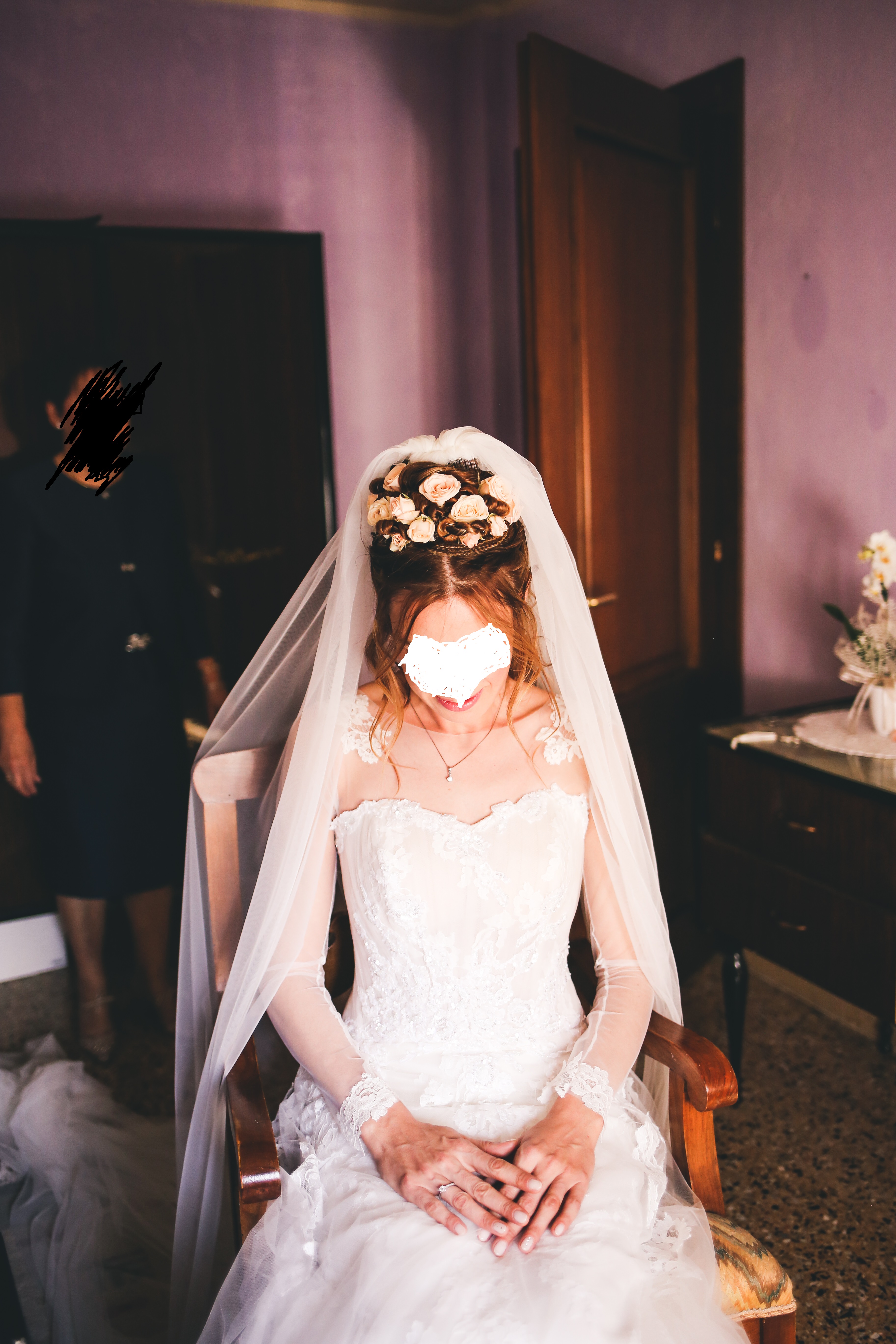 Abito a sirena in pizzo francese, che esalta le forme ma con un effetto romantico dato da un velo in tulle con applicazioni di pizzo che avvolge il vestito prolungandolo con un strascico morbido lungo 2 m. ,il corsetto con forma a cuore è lavorato con paiette .E’ stato aggiunto una maglia effetto nude, in tulle con applicazioni di pizzo , che si attacca al vestito con bottoncini interni .