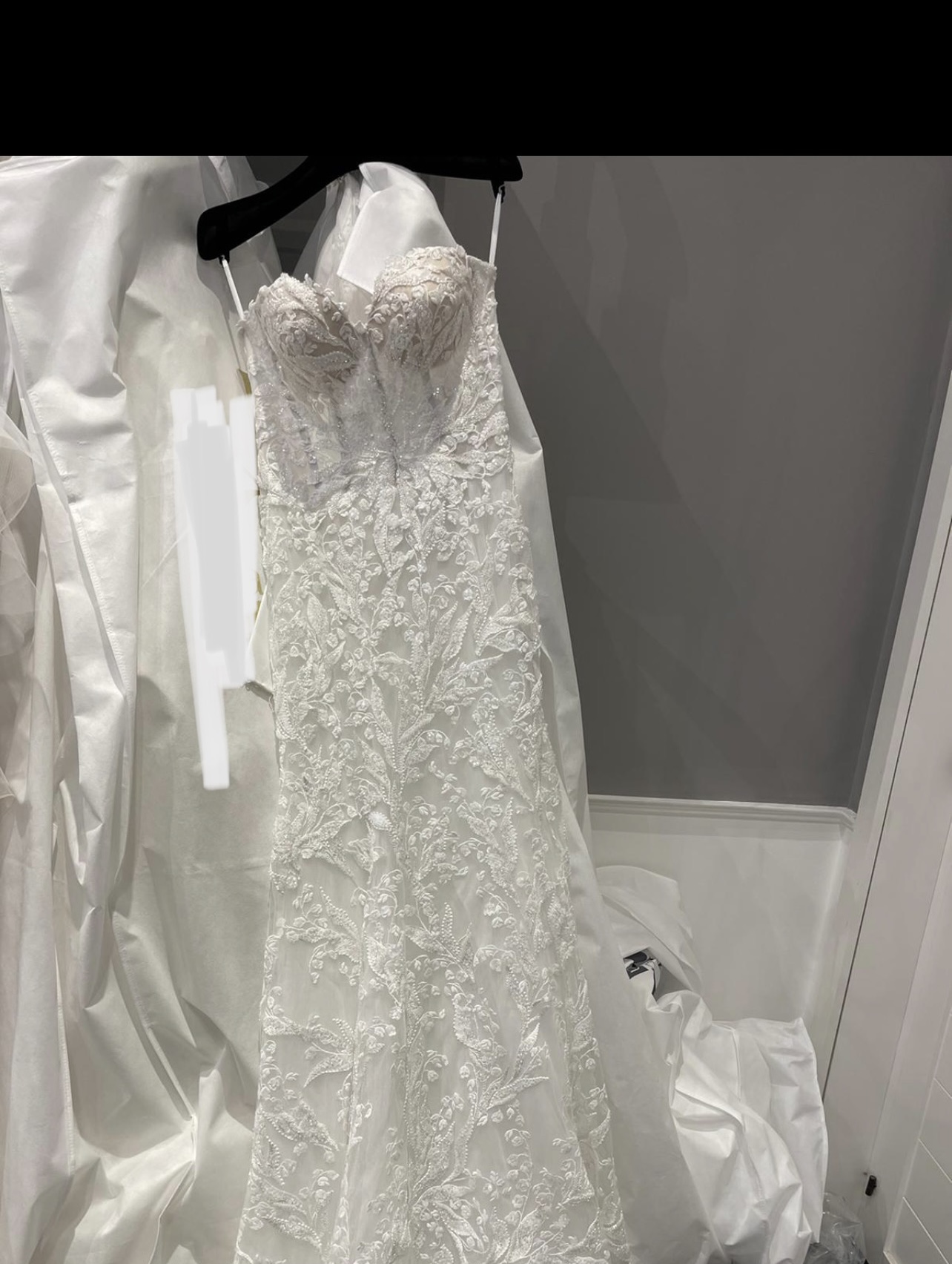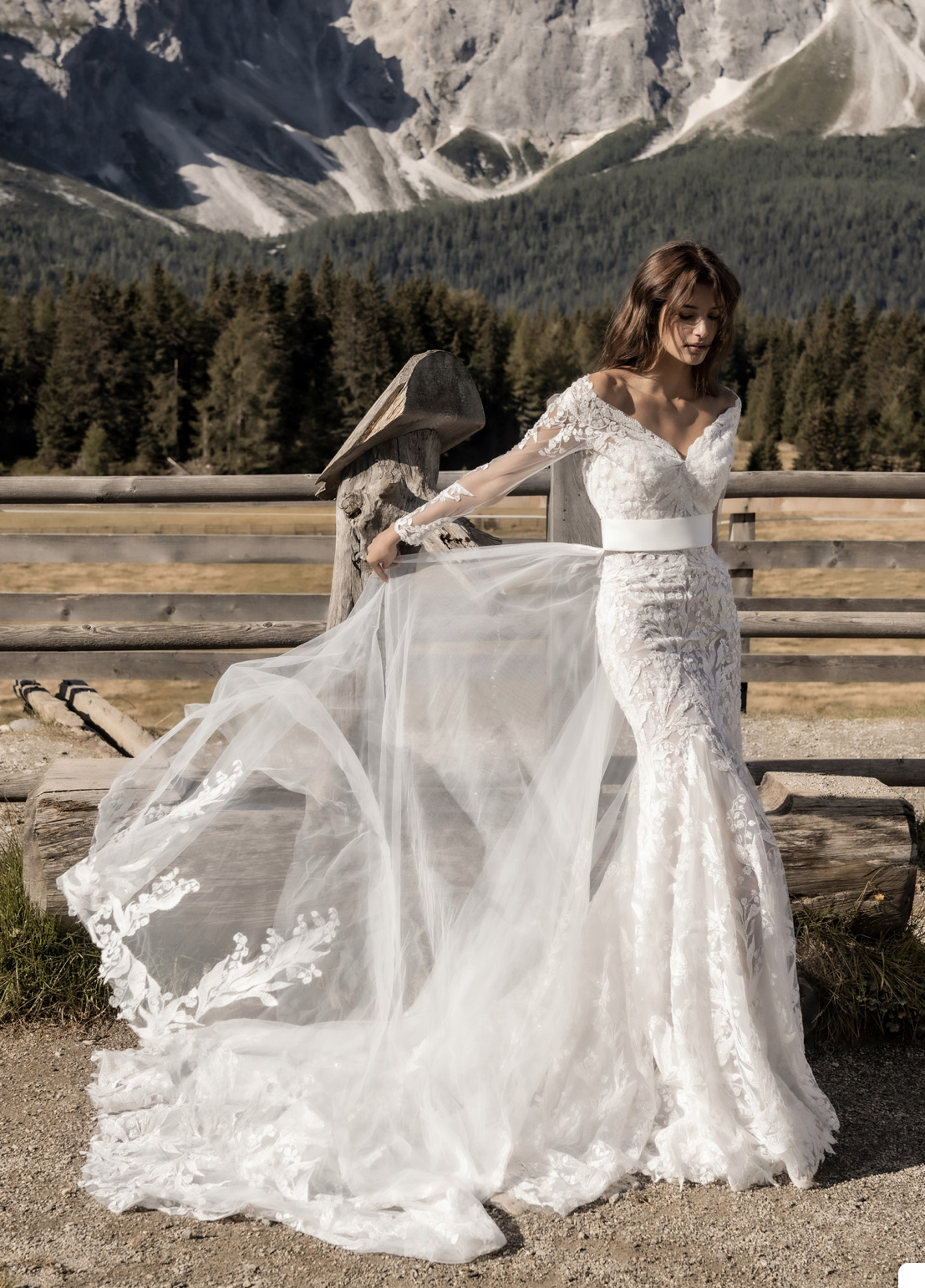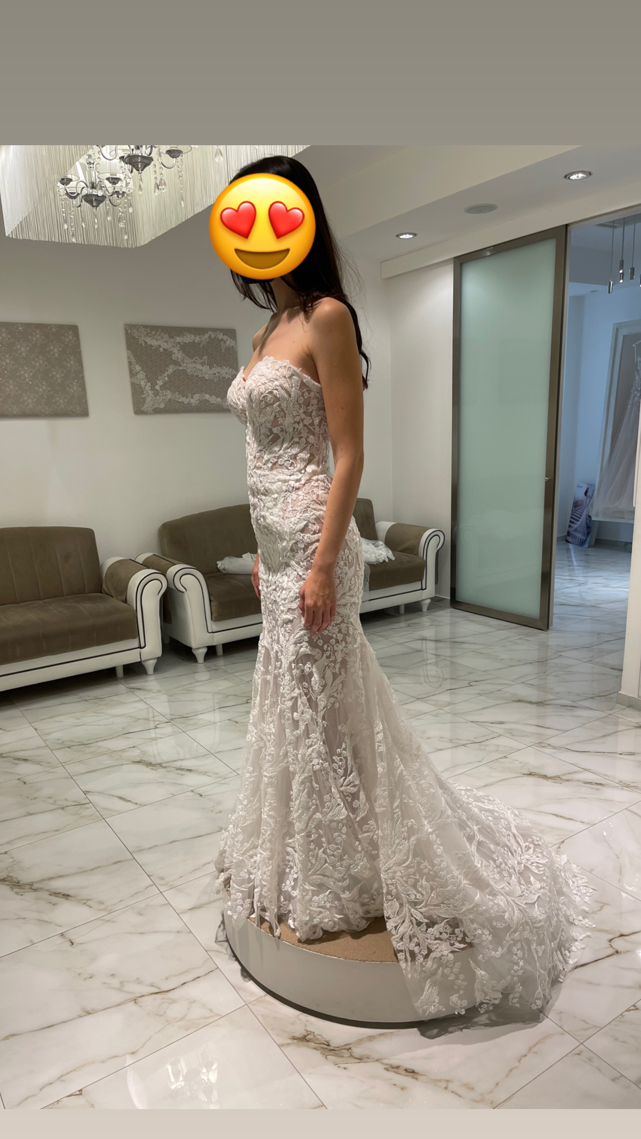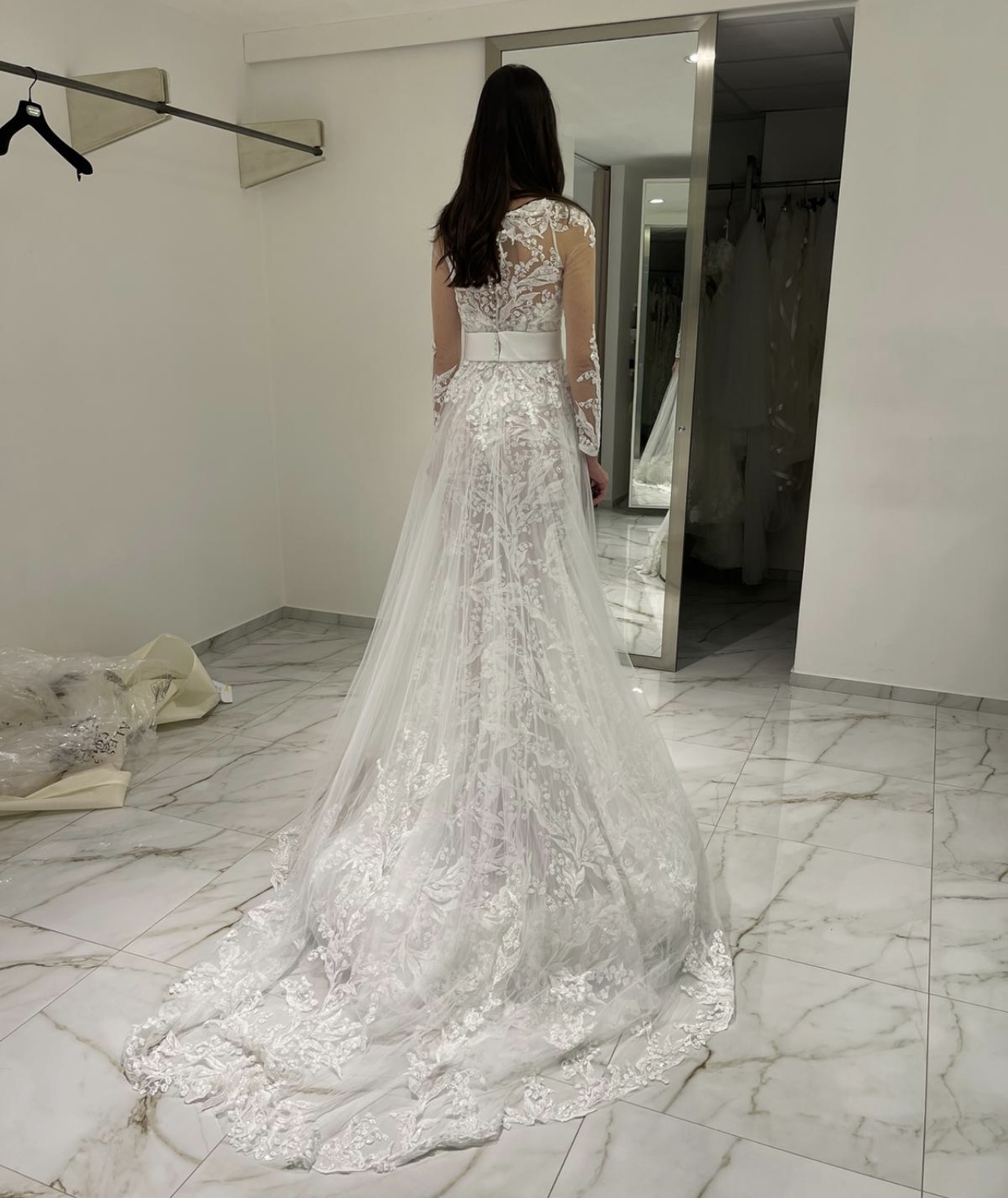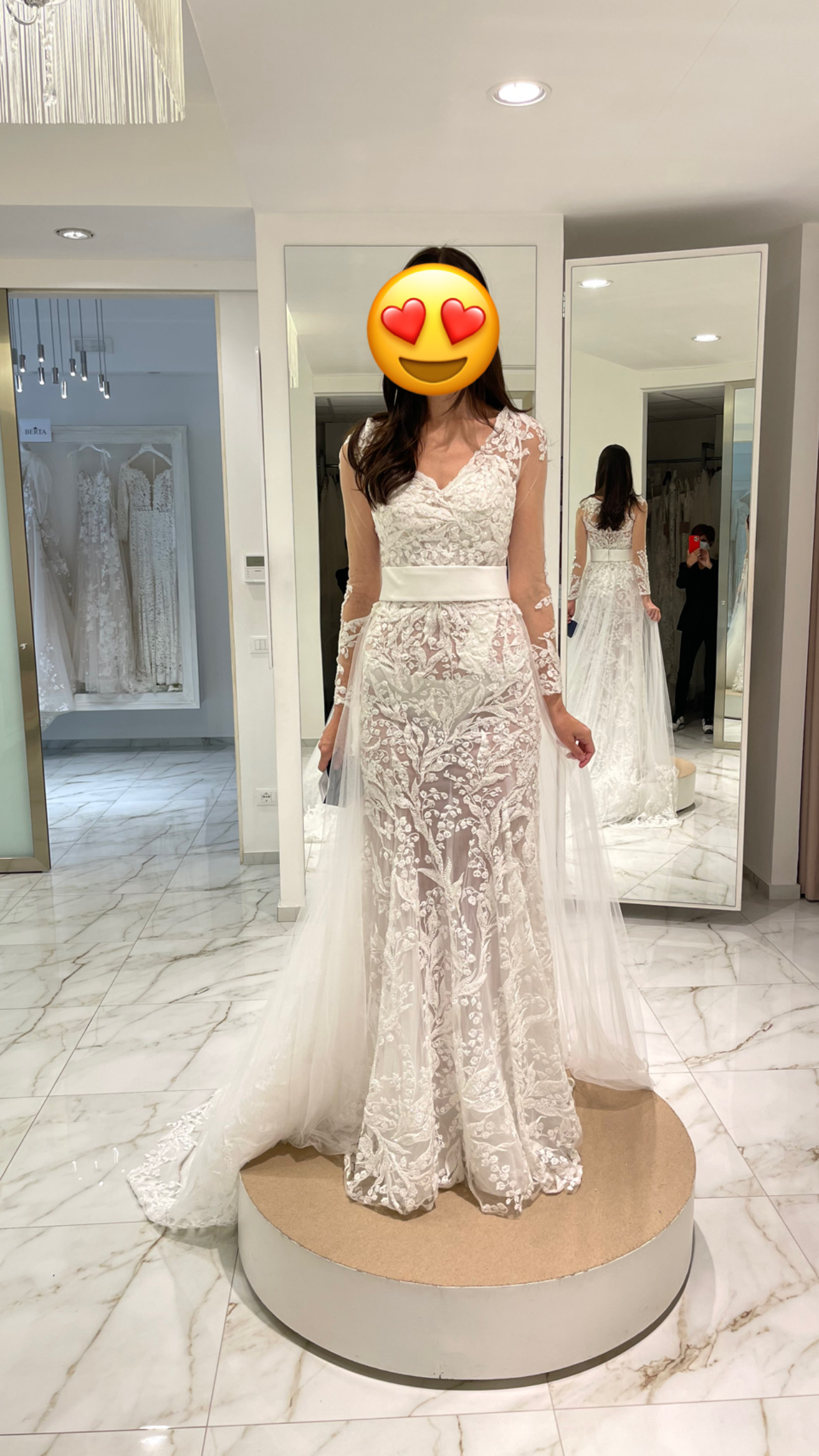 abito couture a sirena realizzato in pregiato guipure e ricamato con un esclusivo disegno di mughetti. Nuovo, MAI usato, in perfette condizioni. E’ un abito doppio. Il giacchino con le maniche lunghe e la coda attaccata alla cintura si possono togliere, e sopra rimane il corpetto a cuore, come si vede nella foto. Ottima soluzione per chi non vuole cambiare l’abito durante la serata.