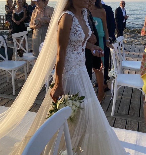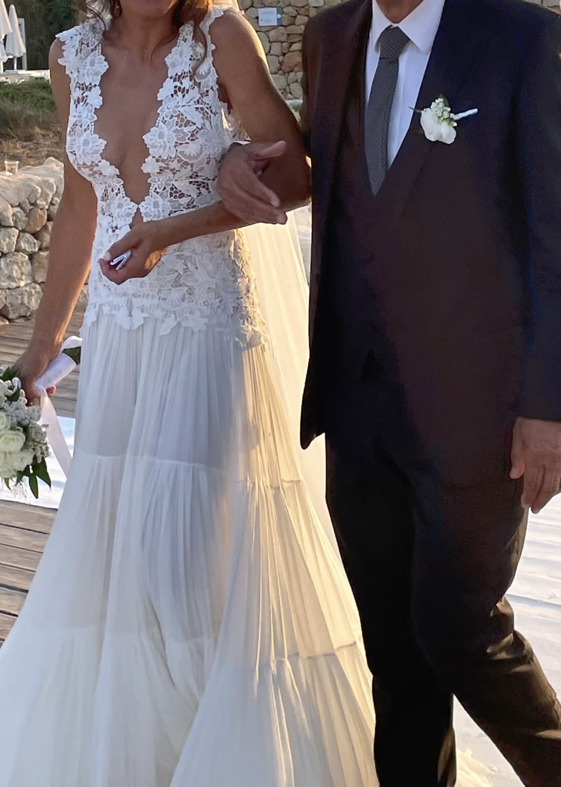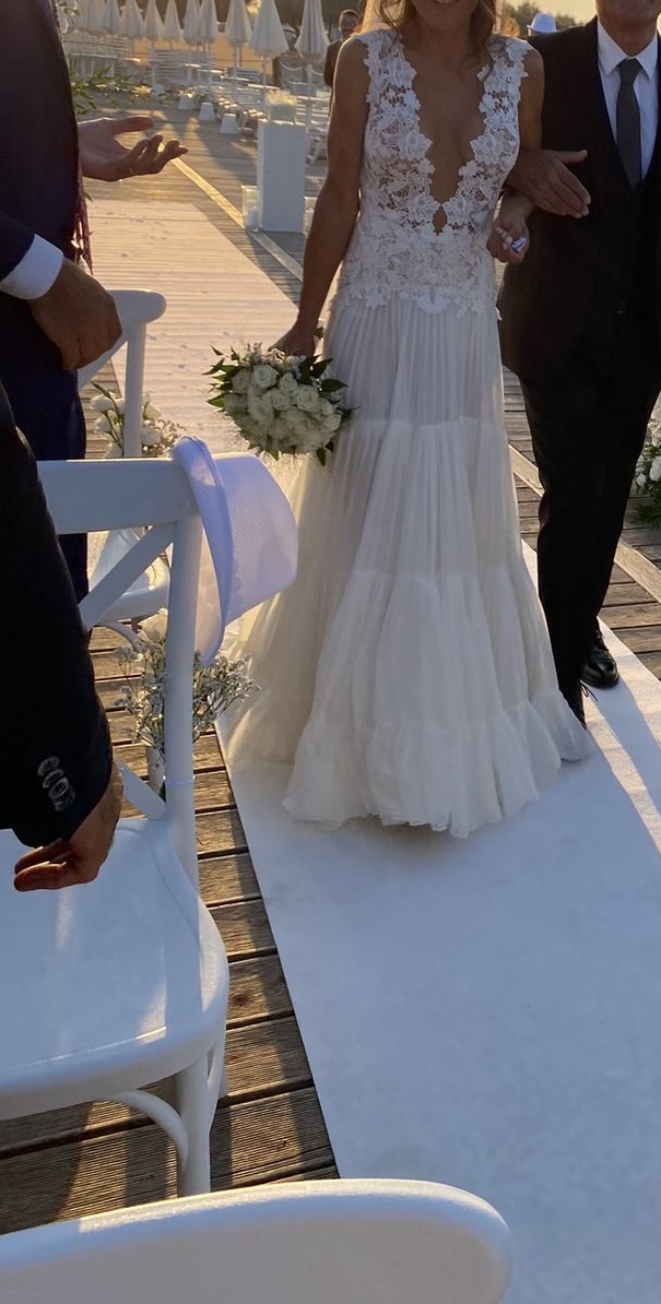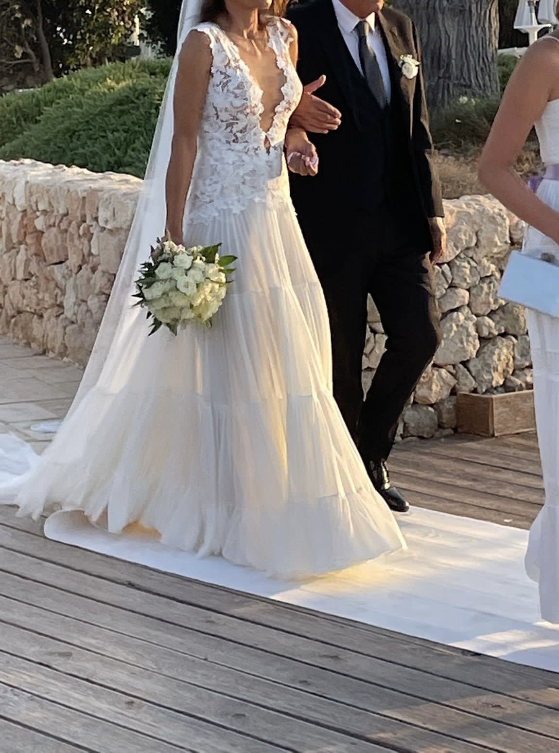 Abito meraviglioso Collezione 2023 – acquistato in atelier Milano – tutto in seta morbida con aggiunta di sottogonna sempre in seta per renderlo più ampio- già lavato e stirato in lavanderia – nuovo perche usato solo per cerimonia perchè prima della festa ho fatto cambio abito. Prezzo di acquisto 6900