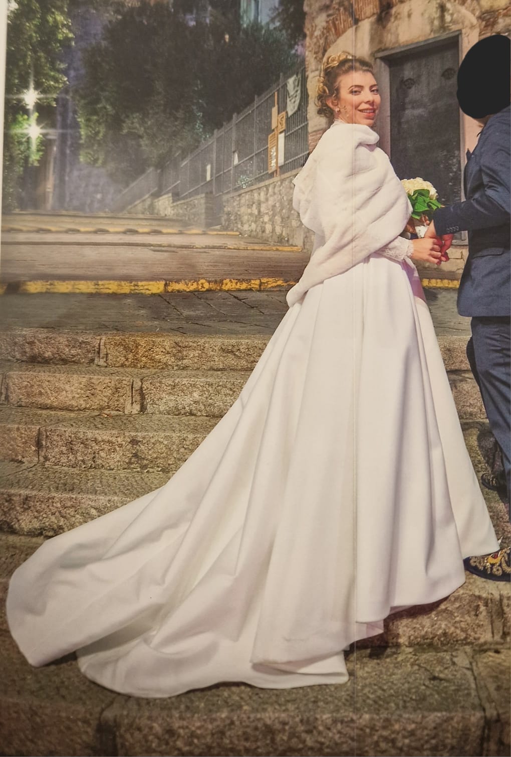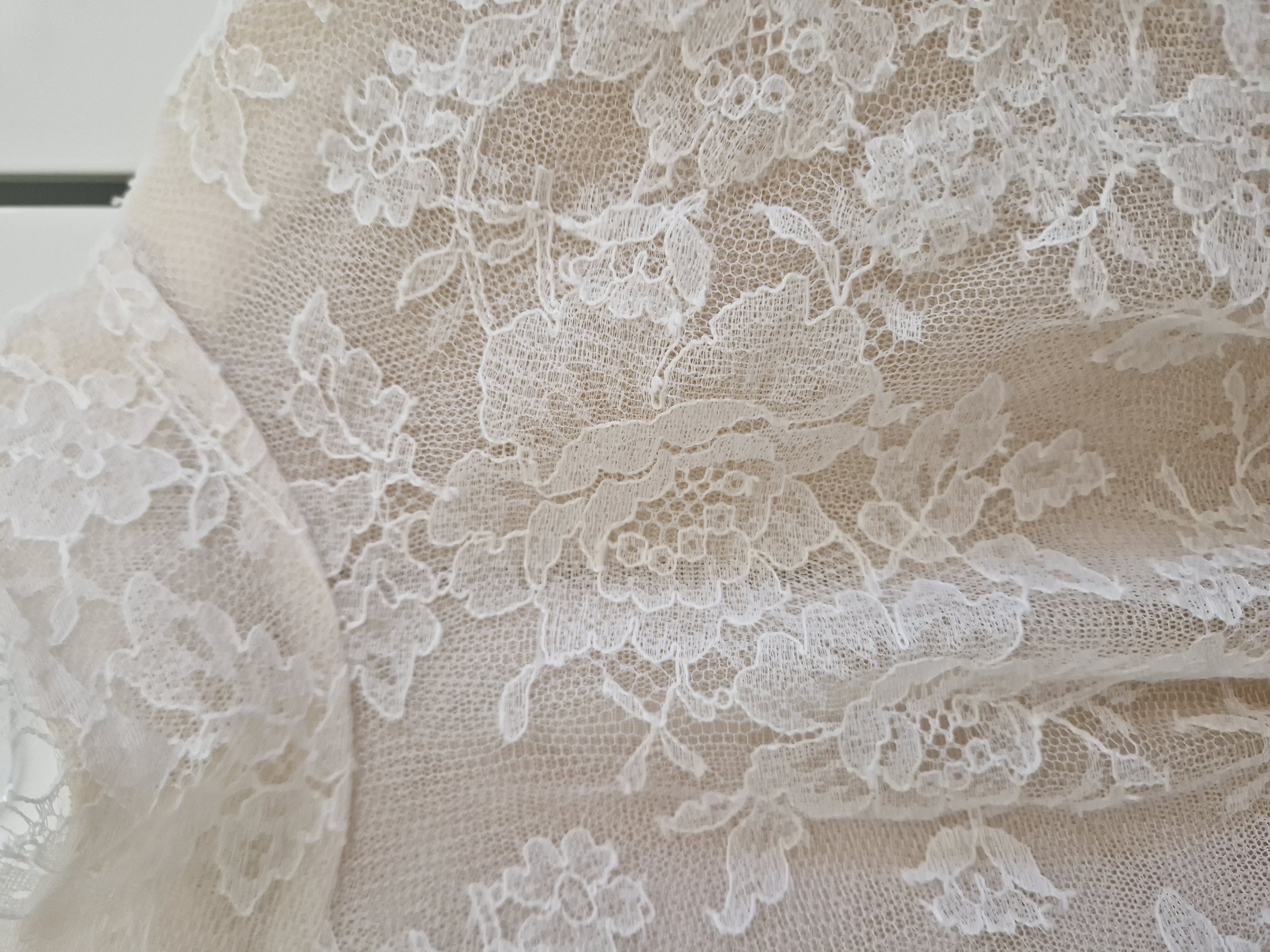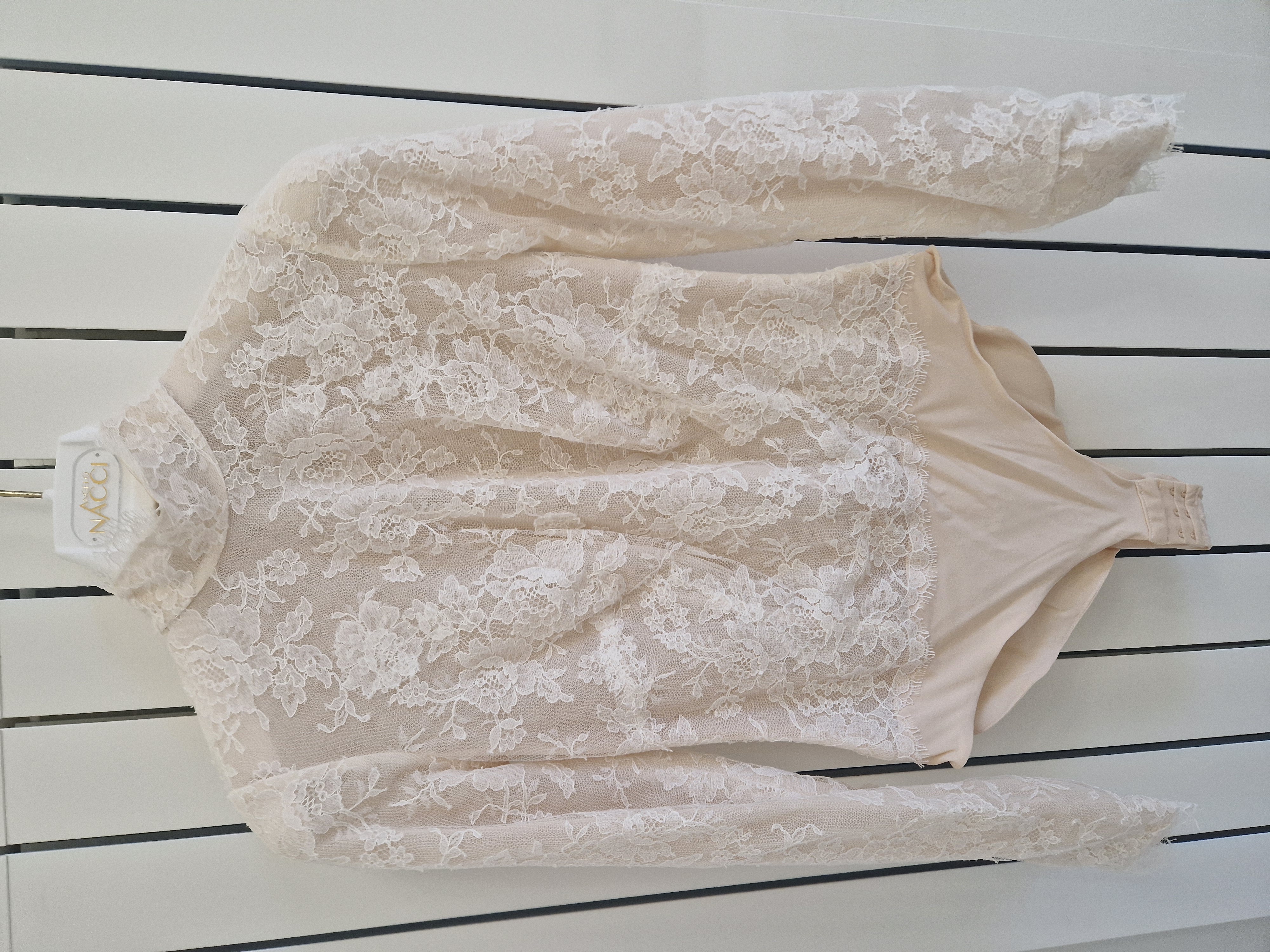 Abito da sposa griffato Angelo Nacci. L’abito è stato confezionato su misura ed è un capo UNICO poiché lo stilista non usa modelli standardizzati ma crea per ogni sposa un vestito personalizzato per scelta di tessuto, forma, colore e dettagli. La gonna è in mikado (tessuto prezioso realizzato secondo un’antica tecnica giapponese di lavorazione della seta, che rende il tessuto leggermente granuloso in superficie, ma al tempo stesso brillante e straordinariamente luminoso), presenta uno strascico di media lunghezza, un elegante fiocco sul retro e due tasche che danno un tocco di modernità (e si sono rivelate estremamente utili per riporre i fazzoletti e il foglio delle promesse); la vita è alta e ha una circonferenza di 78 cm. È perfettamente intatta e non rovinata ma ovviamente va lavata. Il body è interamente ricamato a mano, fatto in pizzo francese, anche qui misura del girovita 78 cm e del giro seno 92 cm. Il tessuto originale aveva un effetto nudo poiché la pelle si vedeva in trasparenza, ho fatto cucire all’interno la fodera in tulle color carne così da mascherare i tatuaggi ma si può facilmente rimuovere.