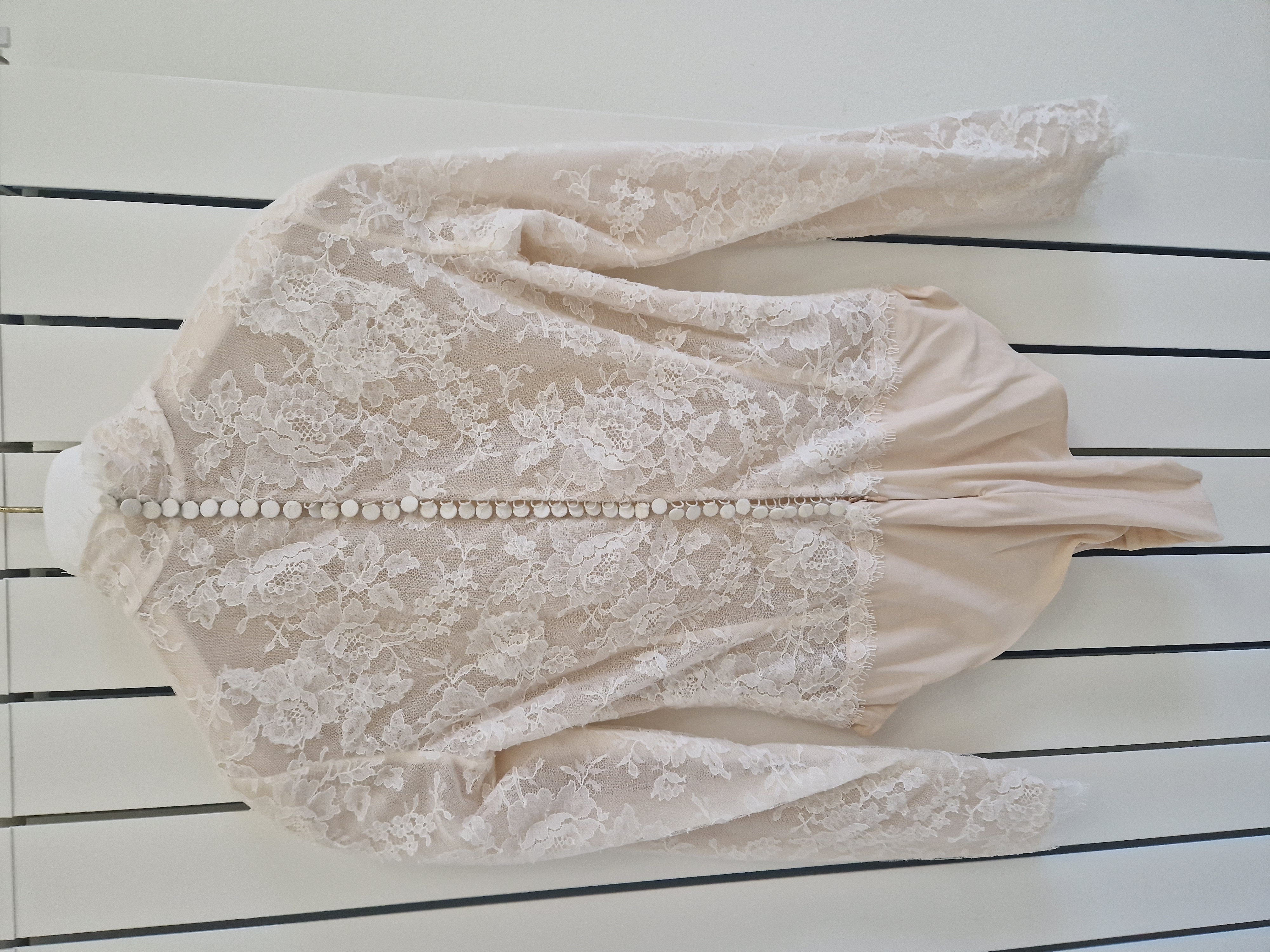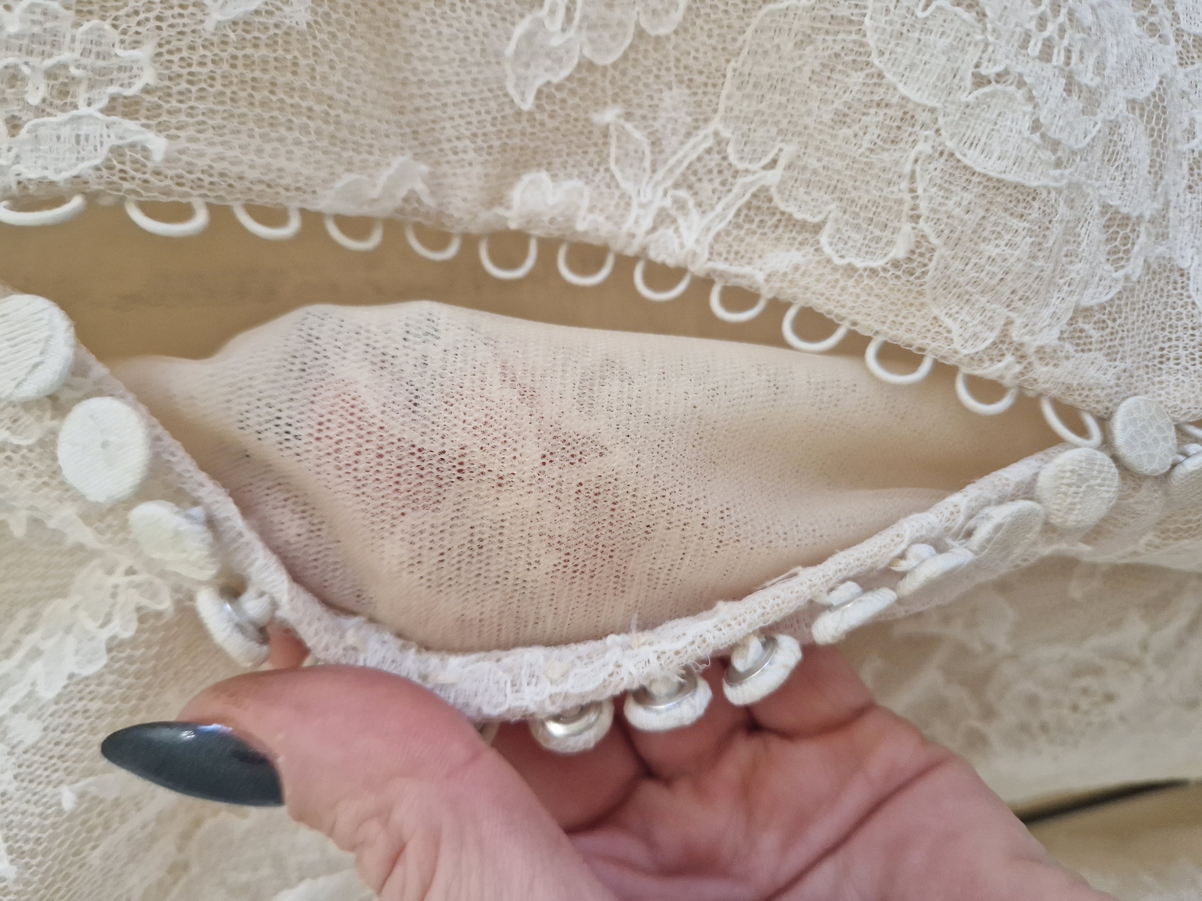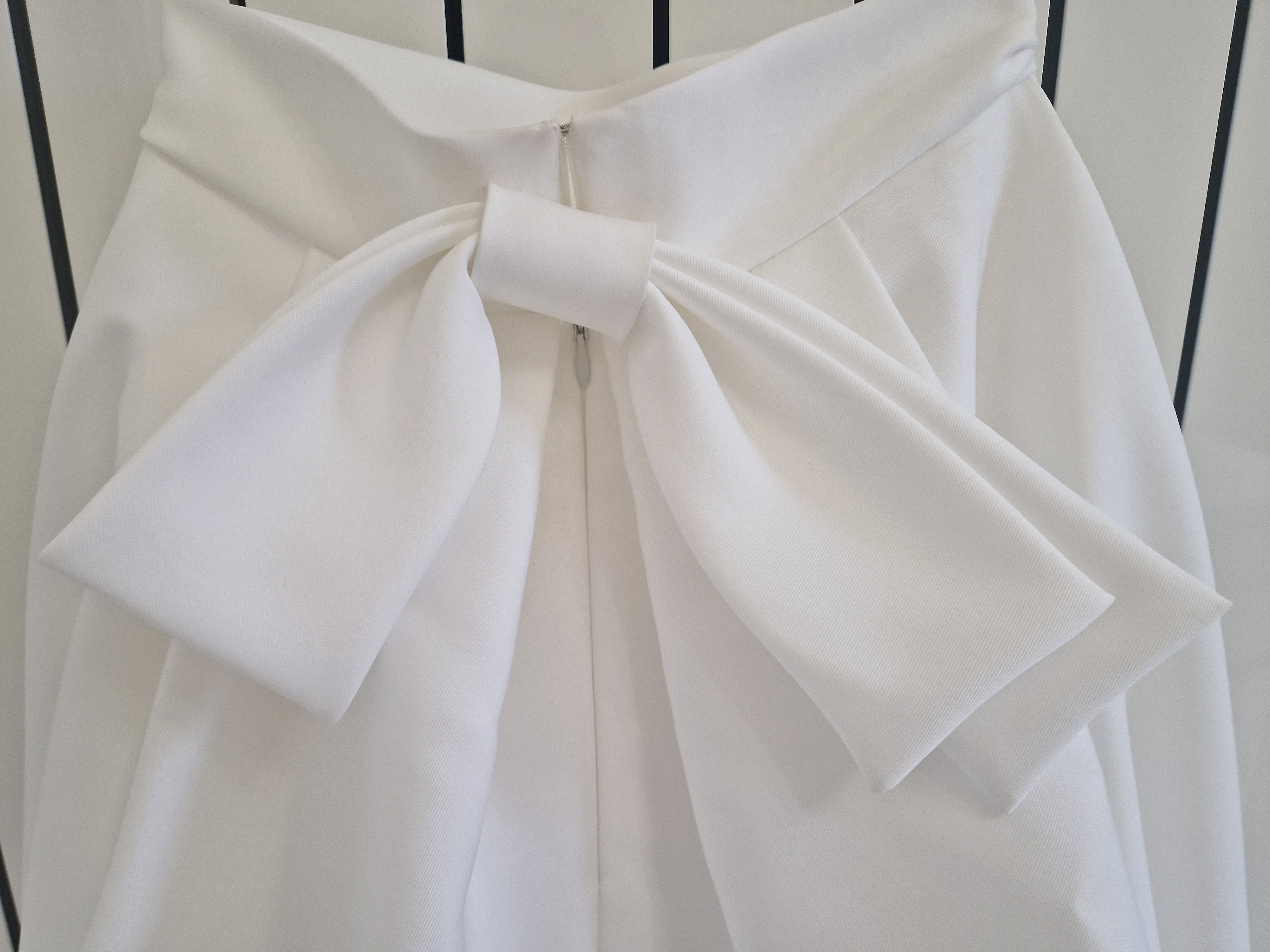 Abito da sposa griffato Angelo Nacci. L’abito è stato confezionato su misura ed è un capo UNICO poiché lo stilista non usa modelli standardizzati ma crea per ogni sposa un vestito personalizzato per scelta di tessuto, forma, colore e dettagli. La gonna è in mikado (tessuto prezioso realizzato secondo un’antica tecnica giapponese di lavorazione della seta, che rende il tessuto leggermente granuloso in superficie, ma al tempo stesso brillante e straordinariamente luminoso), presenta uno strascico di media lunghezza, un elegante fiocco sul retro e due tasche che danno un tocco di modernità (e si sono rivelate estremamente utili per riporre i fazzoletti e il foglio delle promesse); la vita è alta e ha una circonferenza di 78 cm. È perfettamente intatta e non rovinata ma ovviamente va lavata. Il body è interamente ricamato a mano, fatto in pizzo francese, anche qui misura del girovita 78 cm e del giro seno 92 cm. Il tessuto originale aveva un effetto nudo poiché la pelle si vedeva in trasparenza, ho fatto cucire all’interno la fodera in tulle color carne così da mascherare i tatuaggi ma si può facilmente rimuovere.