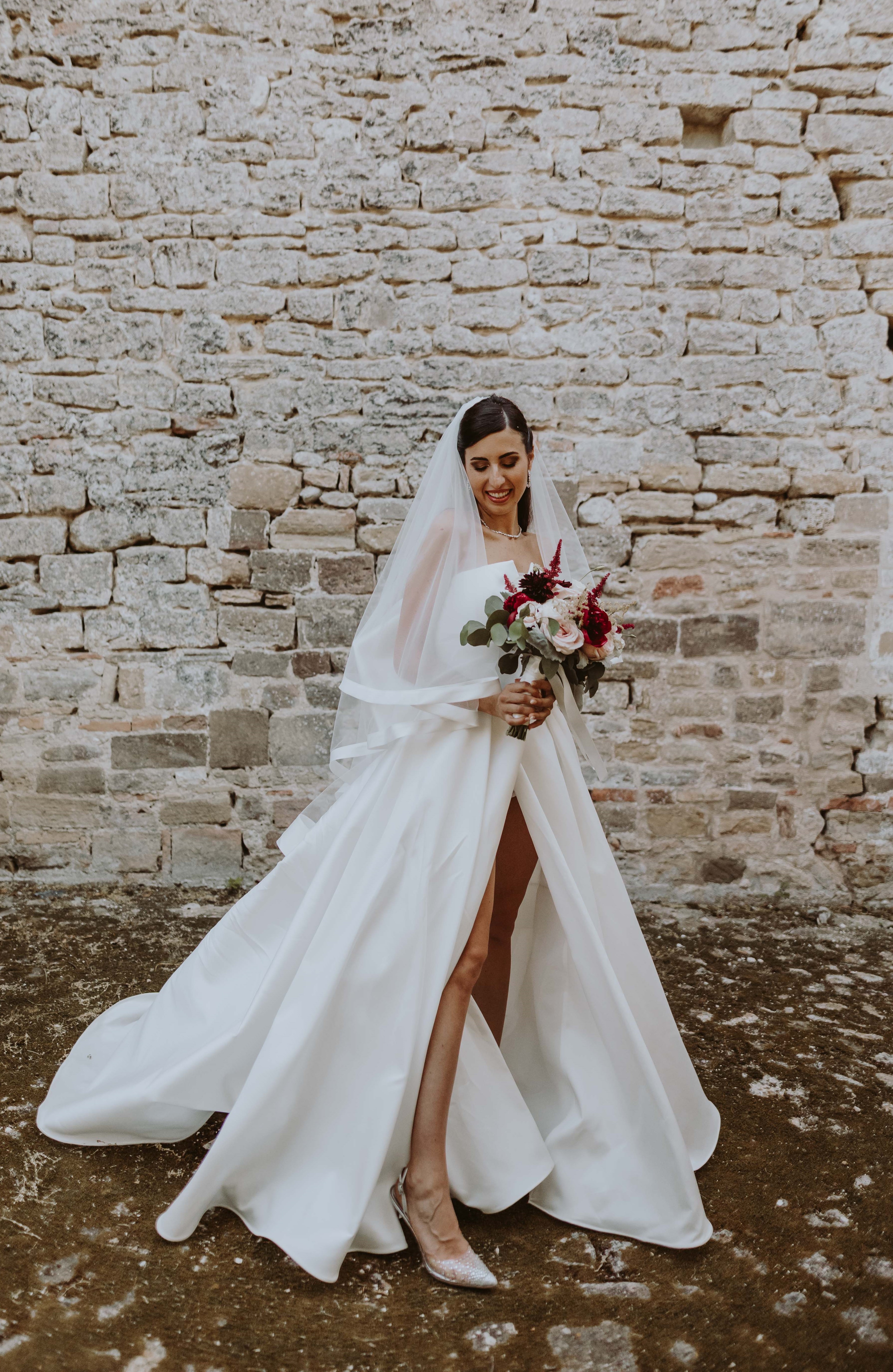 Particolarità: è dotato di velo lungo con bordo dello stesso tessuto dell’abito, coda con maxi fiocco removibile e pantaloncino dello stesso tessuto dell’abito