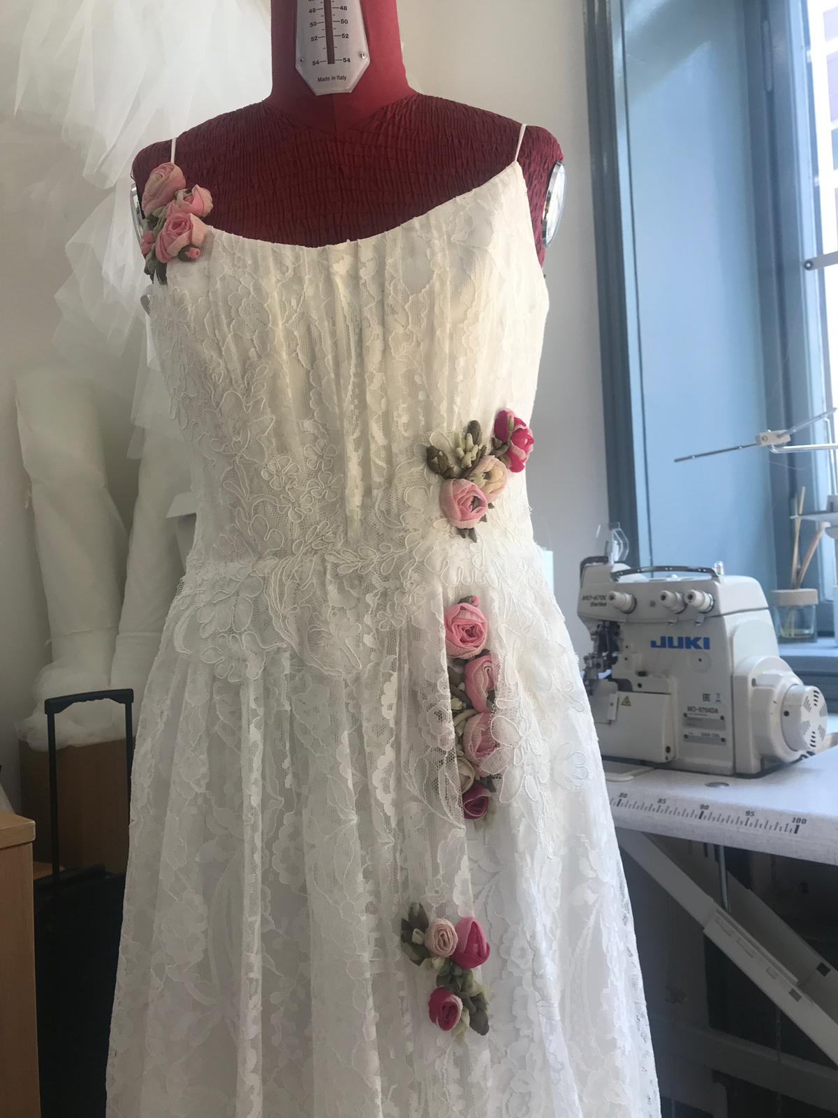 Vendo stupendo abito in pizzo macramè con fiori in organza cuciti a mano di Atelier Emè Mod. Letizia nuovo, mai indossato ma provato solo una volta e modificato leggermente causa dimagrimento della sposa. La taglia è diventata circa una 41 sul corpetto, ma l’orlo non è ancora stato fatto quindi è adatto anche ad una ragazza alta. Vendo completo di velo classico in tulle bianco, lunghezza 3 metri ancora da orlare e in regalo 2 composizioni floreali cucite a mano uguali a quelle applicate sull’abito, del valore di € 45,00 ciascuna, da poter applicare sul velo, o sulle scarpe o altri usi a vostra discrezione. Le misure del corpetto sono: seno 87 cm., vita 72 cm., bacino 92 cm., paragonabili ripeto a una taglia 41.