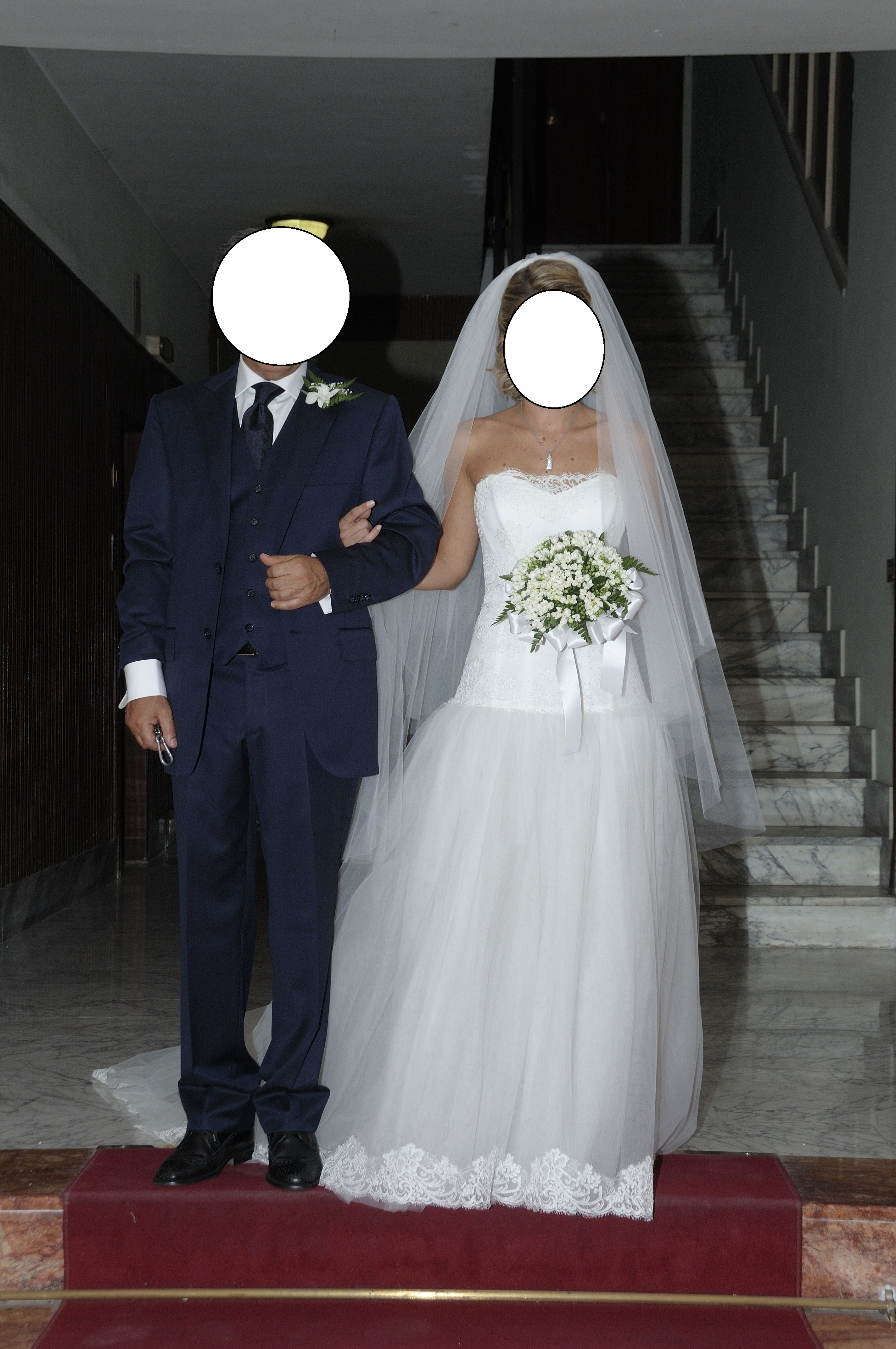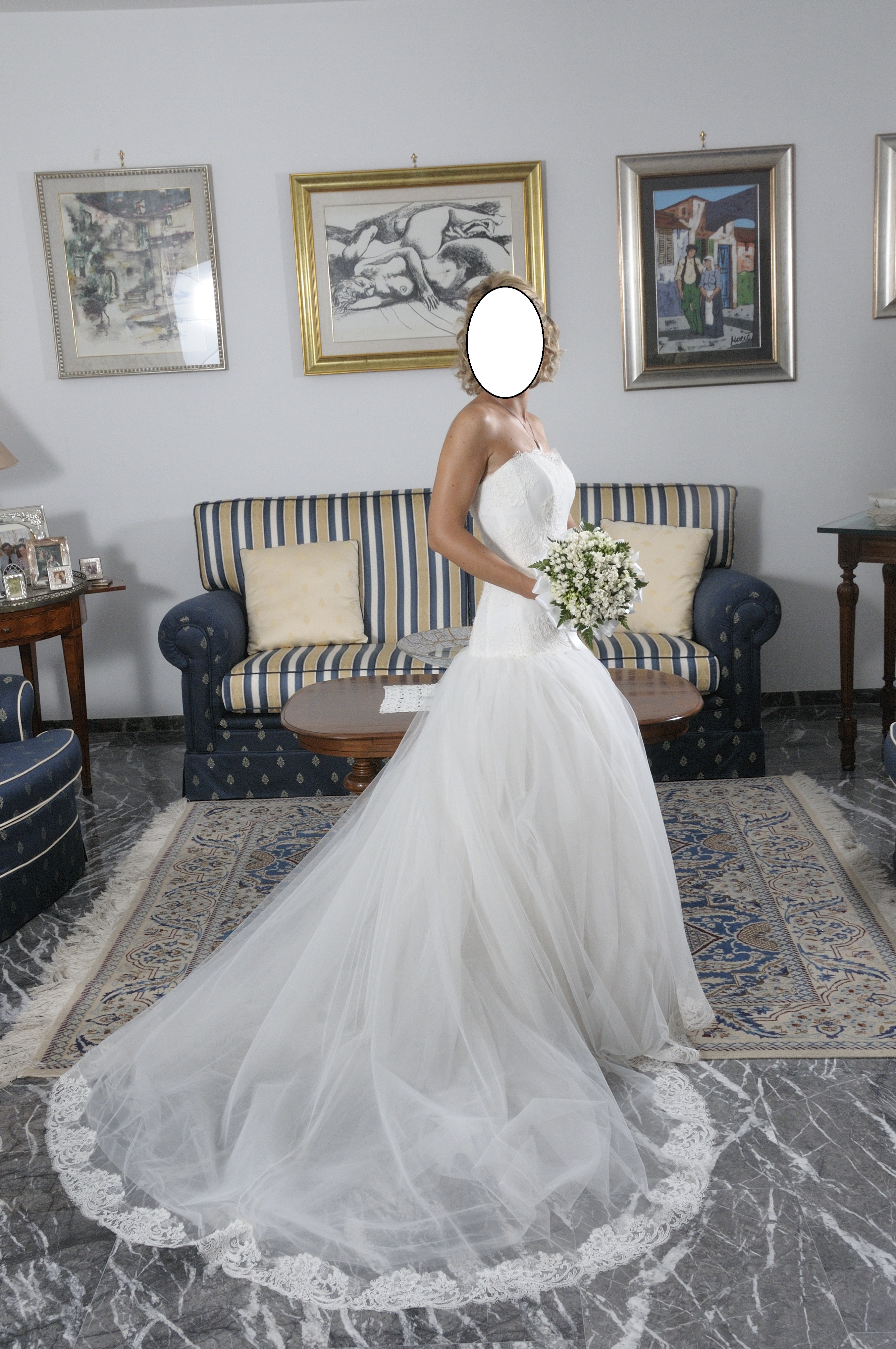 Occasione : abito esclusivo con bustino sagomato in pizzo macramè, gonna in tulle bordata di pizzo, completo di velo.