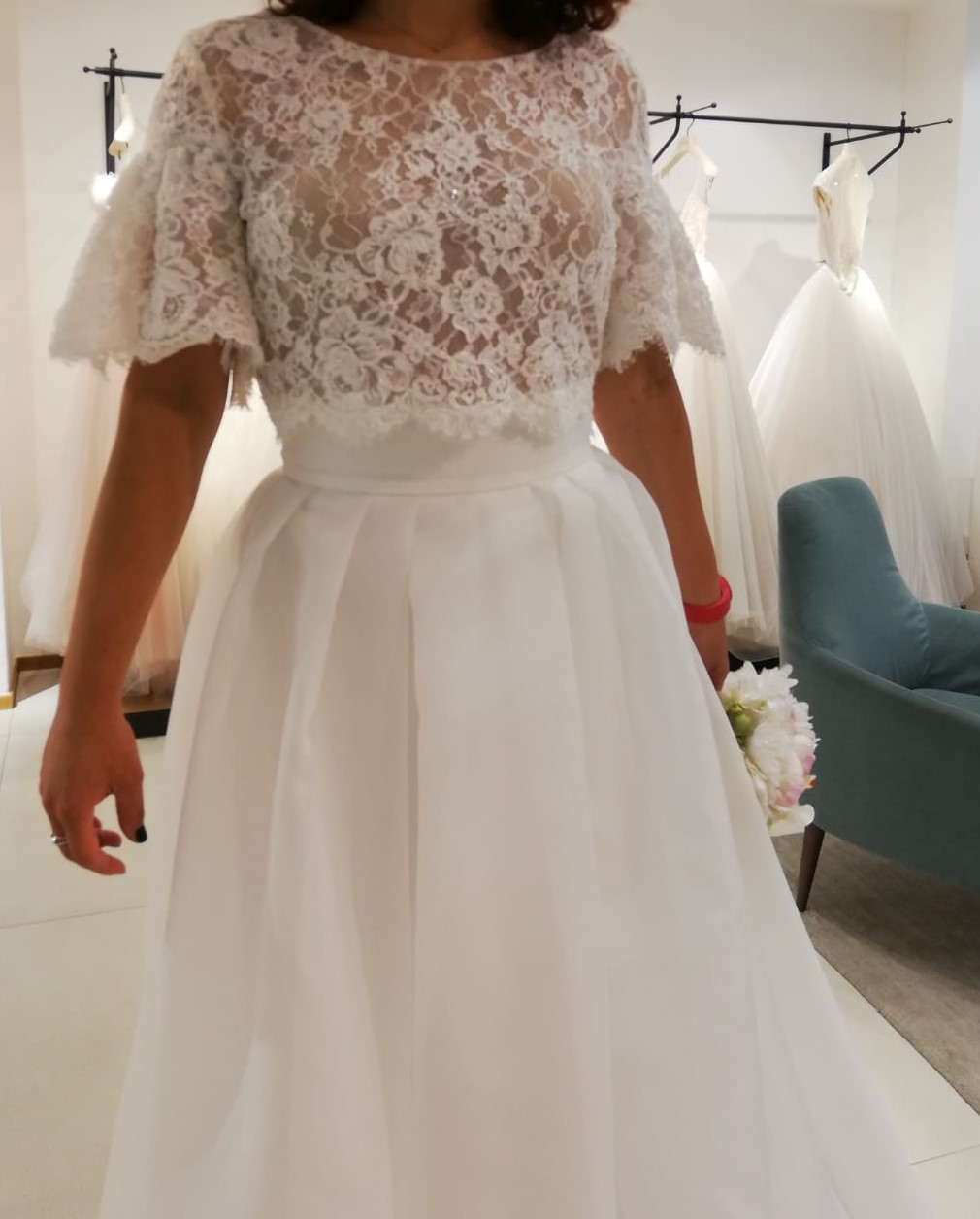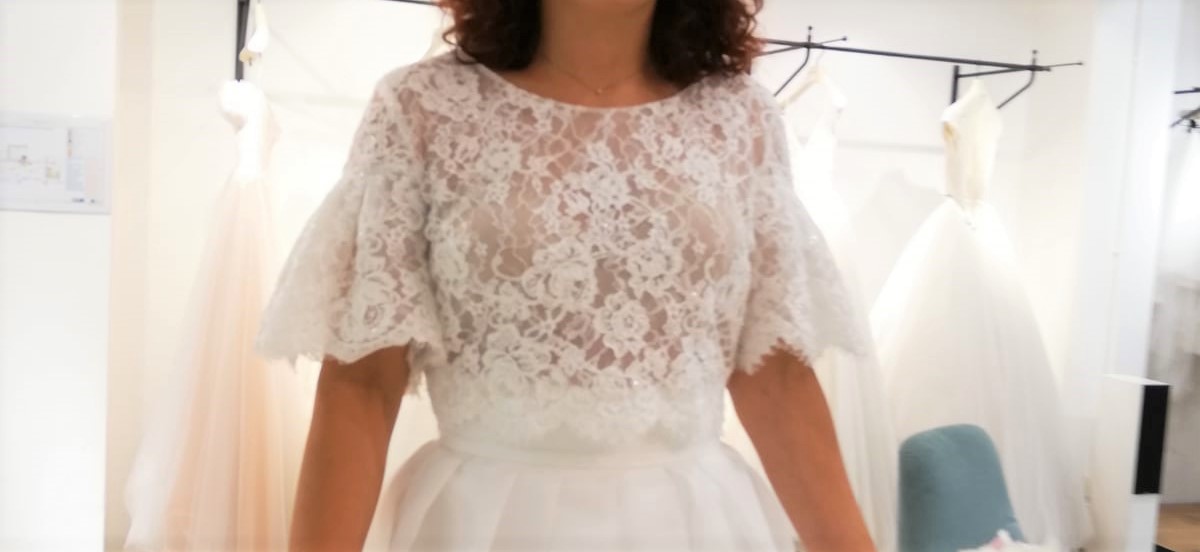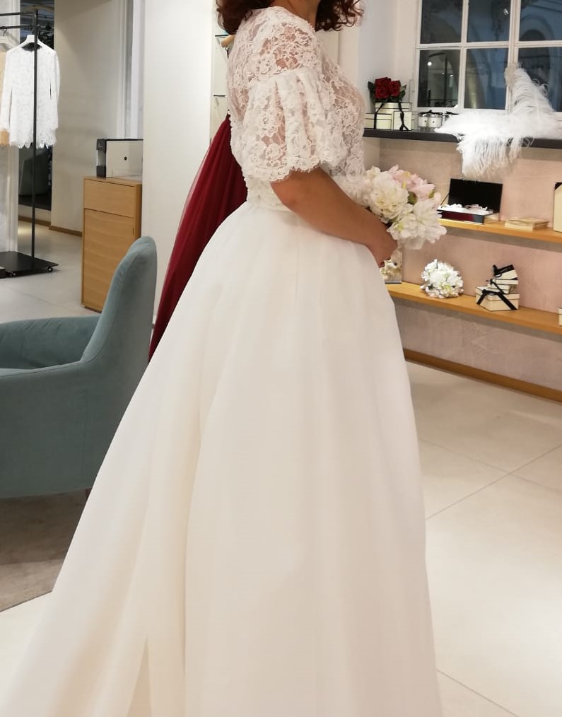 Questo abito da sposa è composto da due pezzi, un corpetto in pizzo e una gonna di raso. E’ color bianco avorio.