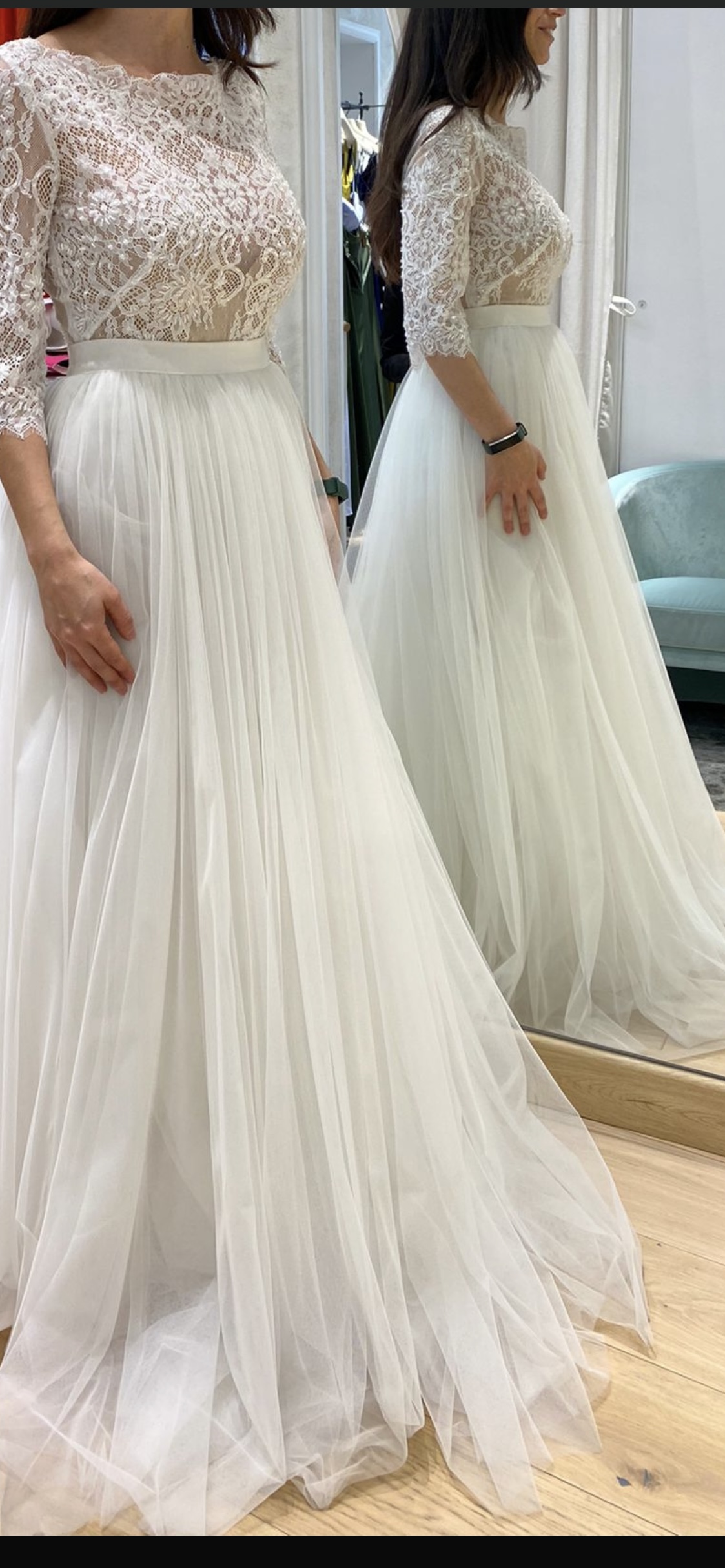 L’abito è stato usato solo il giorno del matrimonio. Ottime condizioni, gonna non portata in tintoria mentre il corpetto si.