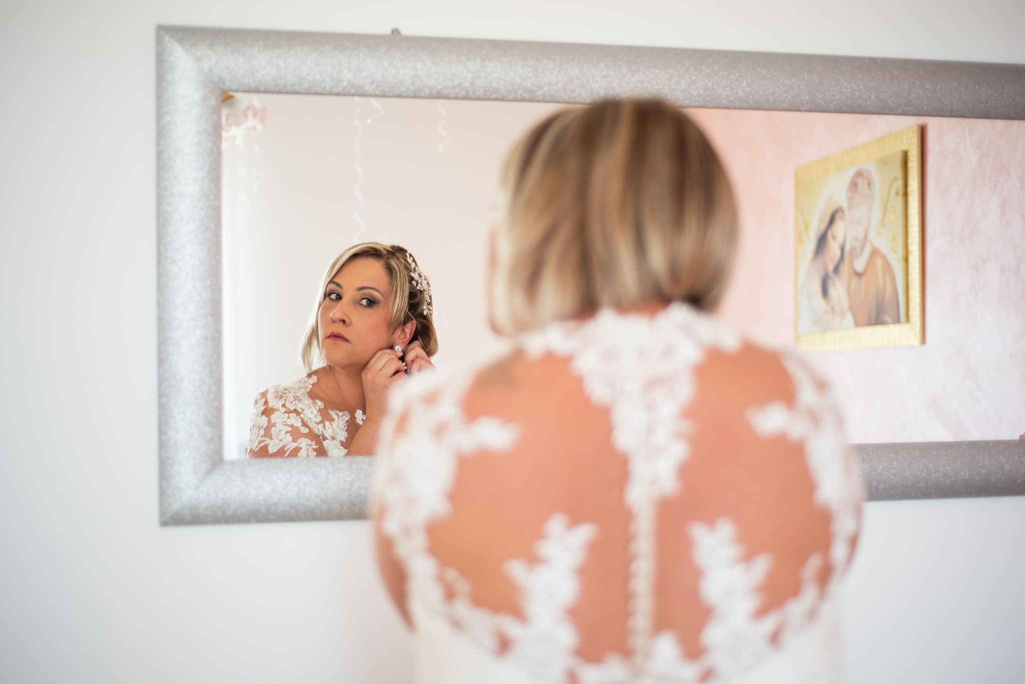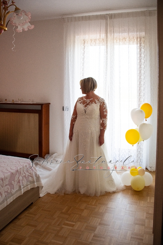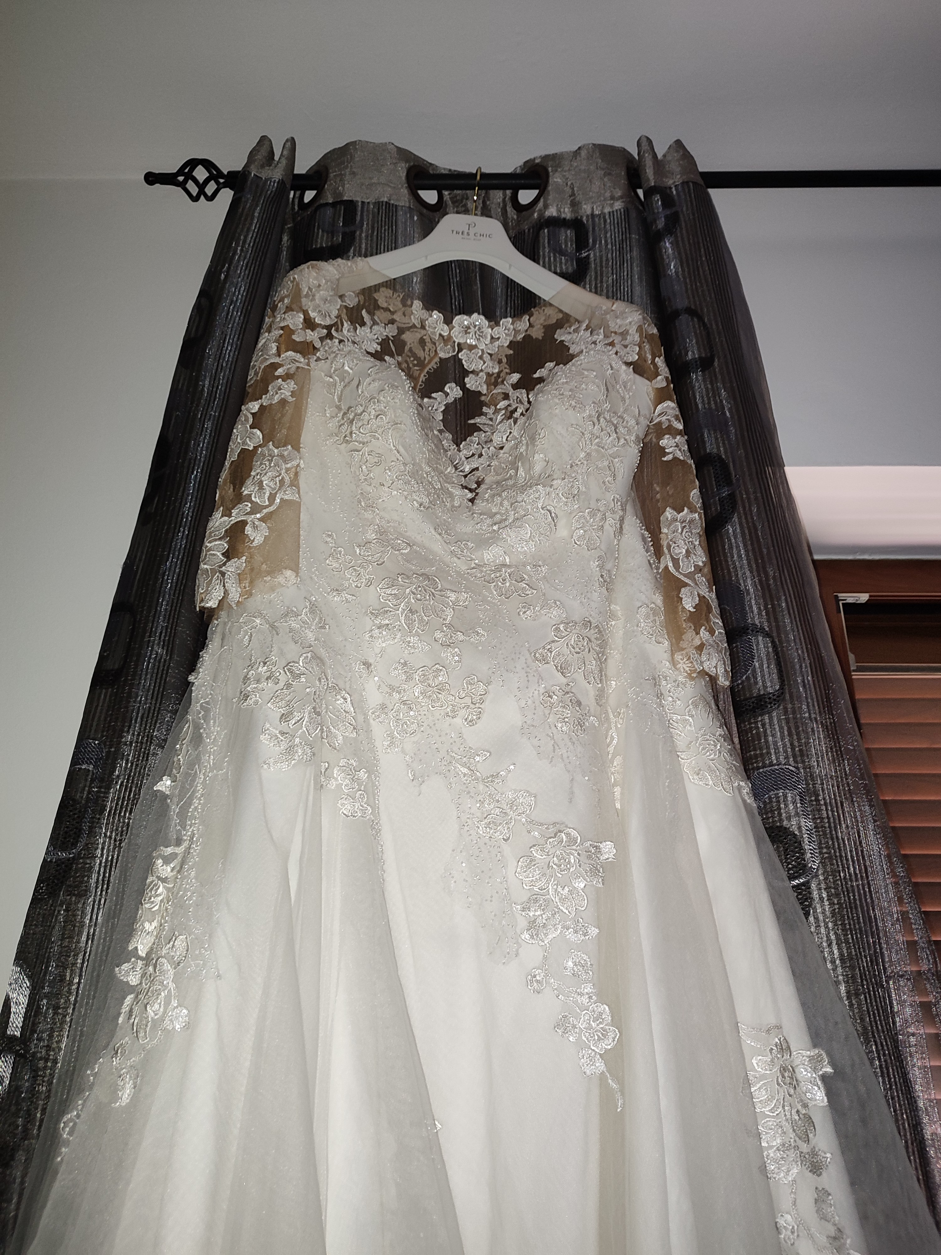Splendido abito da sposa con corpetto in pizzo e gonna in tulle a strascico. Manica a 3/4 impreziosita da bottoncini e chiusura a zip nascosta interamente da bottoncini. Anche la gonna è impreziosita da fiori in pizzo e punti luce. Indossato risulta leggero e comodo. Altezza 1.65 indossato con tacco comodo e infradito.