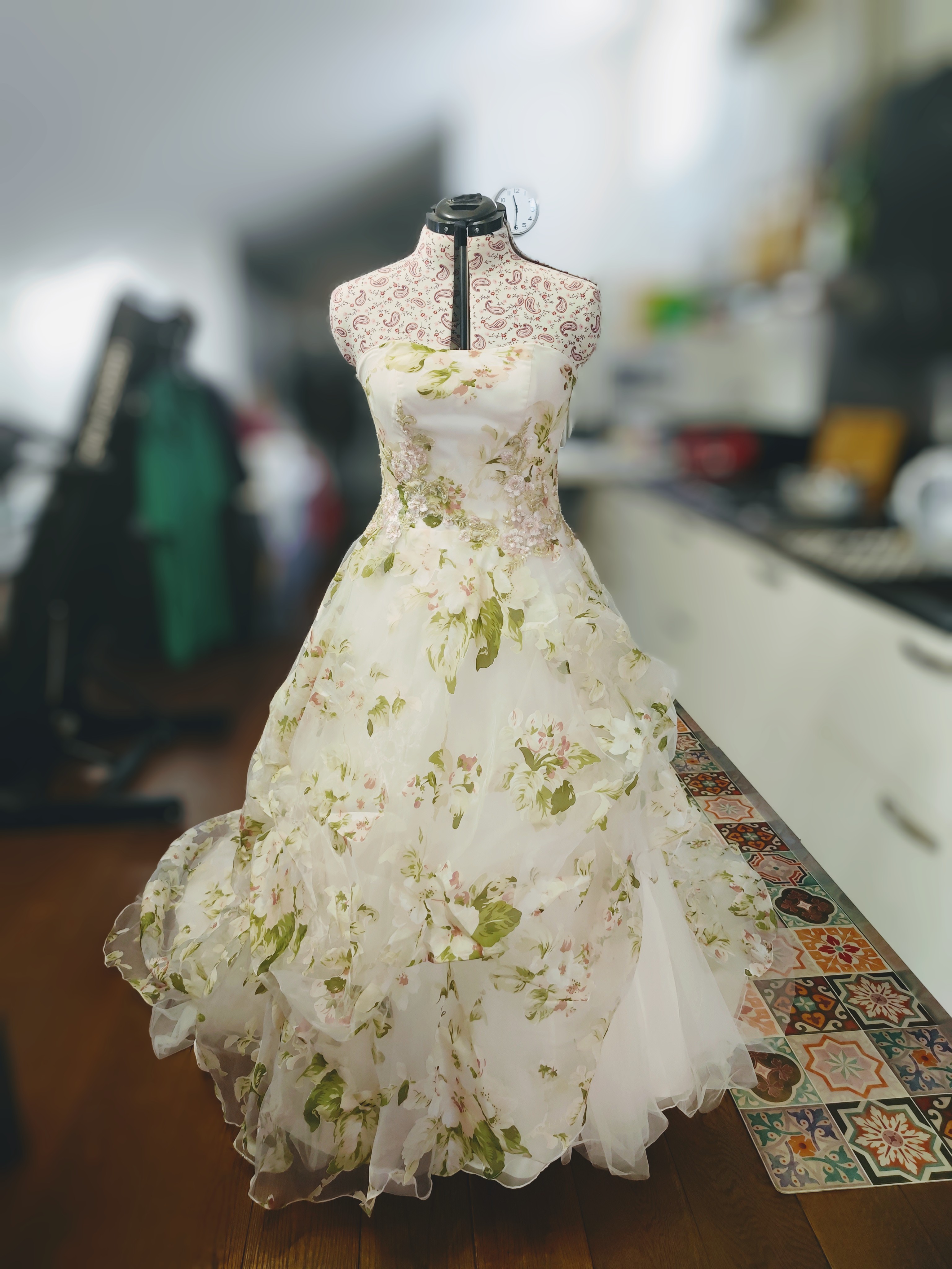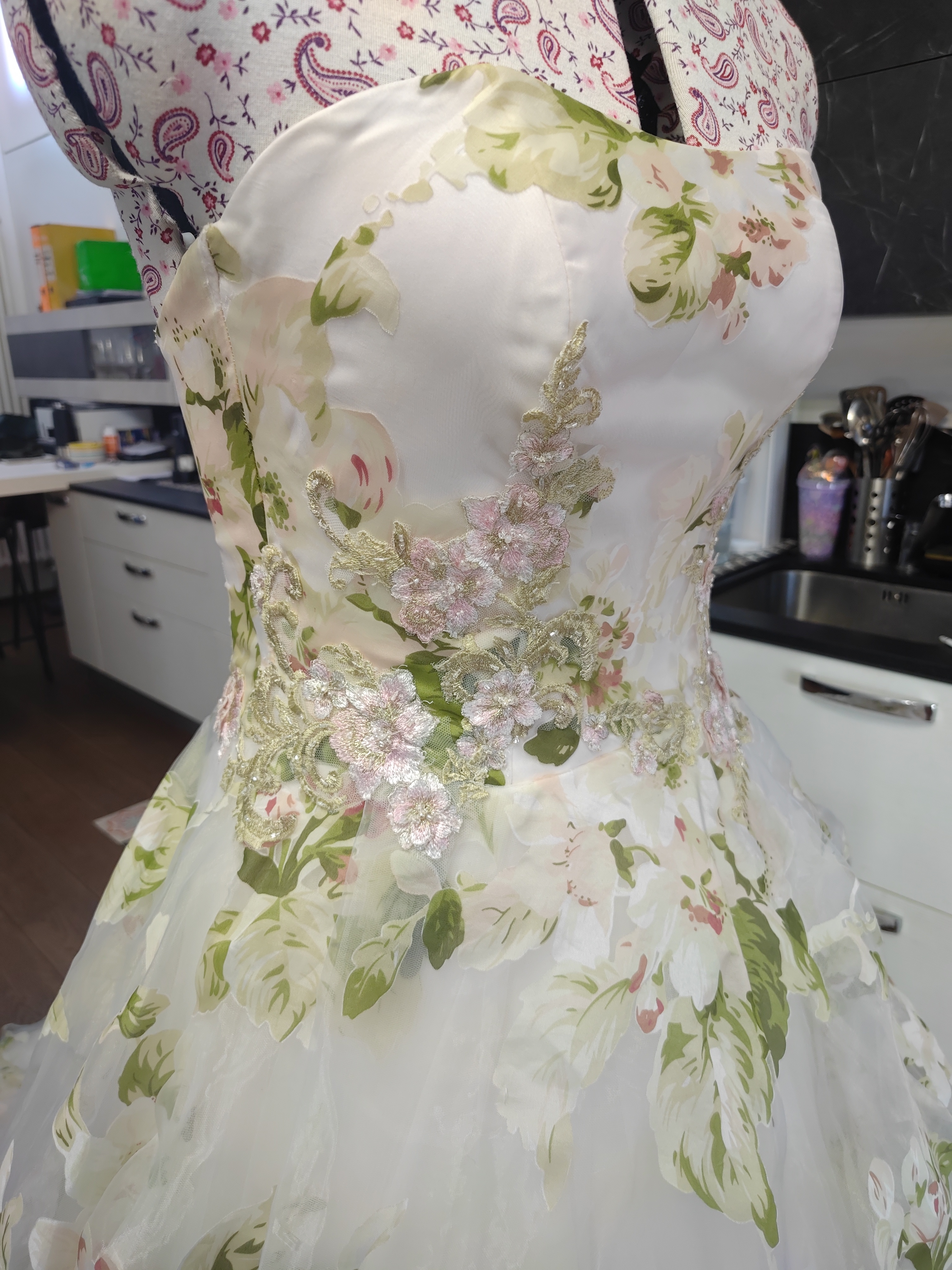L’abito non è mai stato indossato. Grazie alla fascia elastica sulla schiena e al nastro intrecciato può vestire fino alla taglia 44. Il manichino sartoriale è regolato sulla taglia 44.