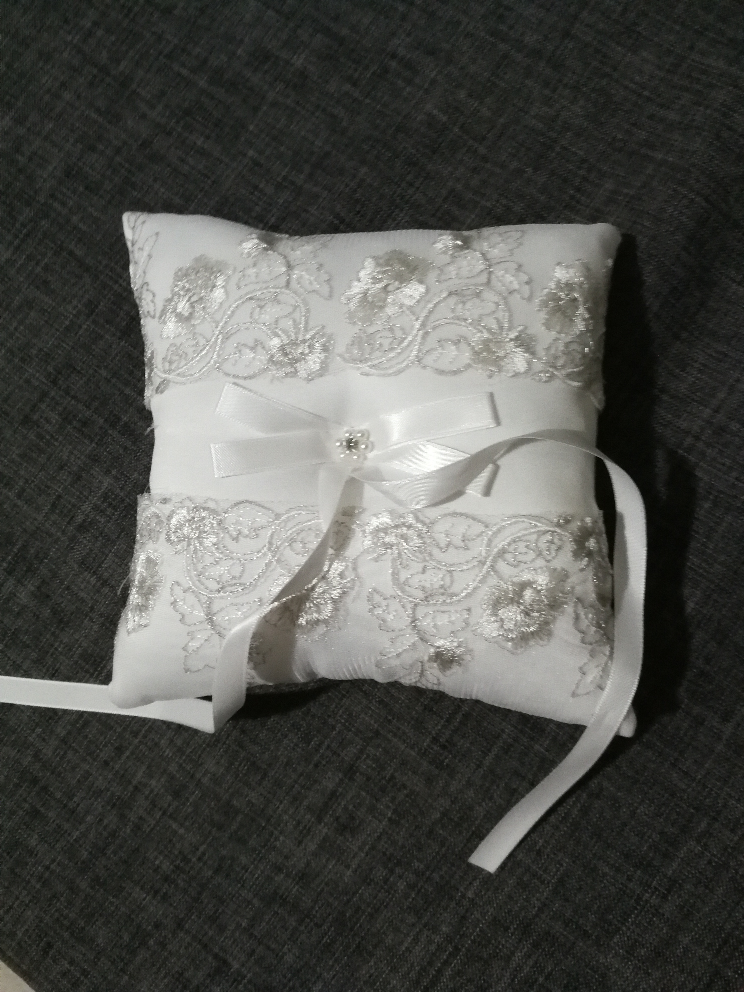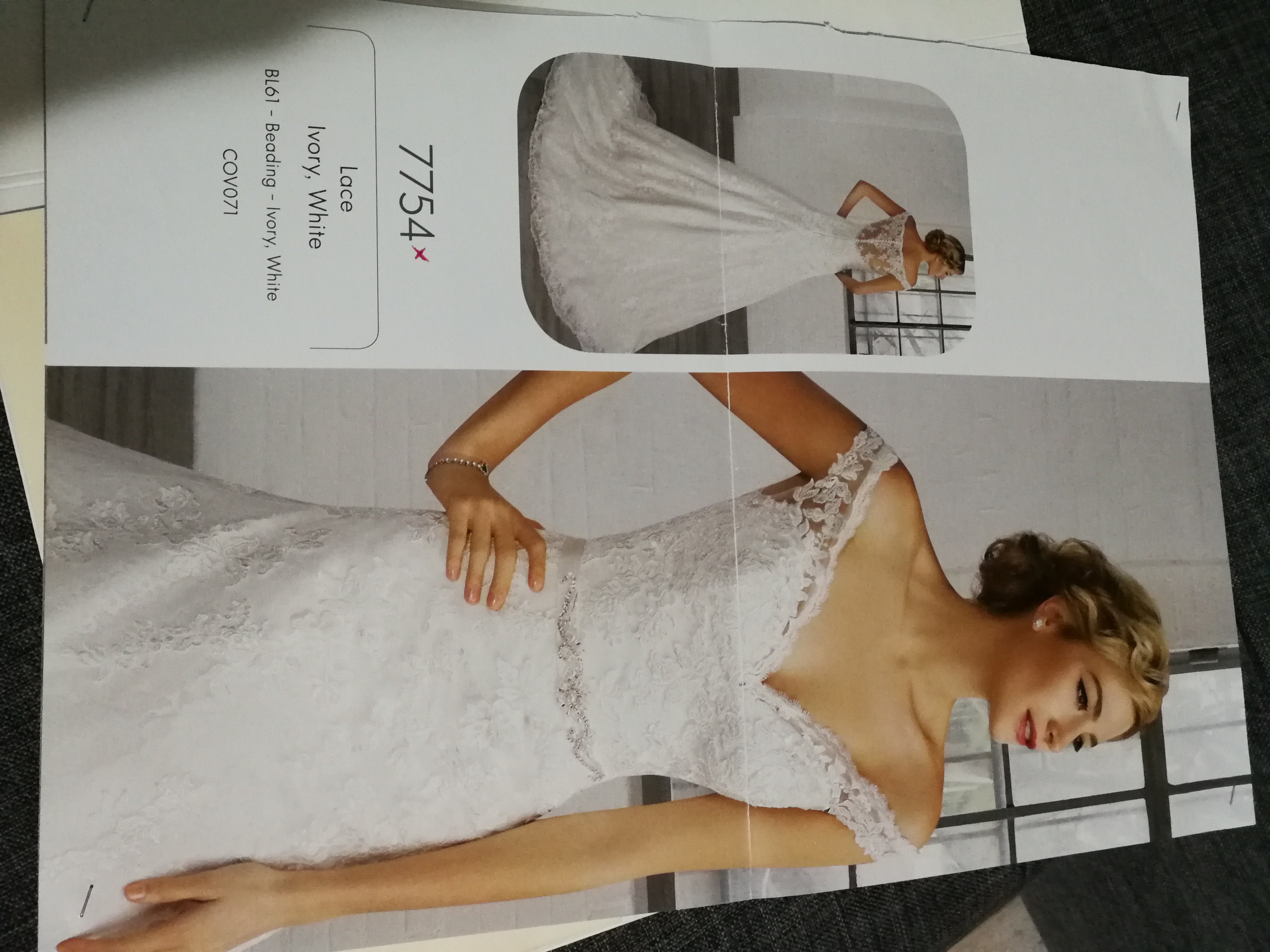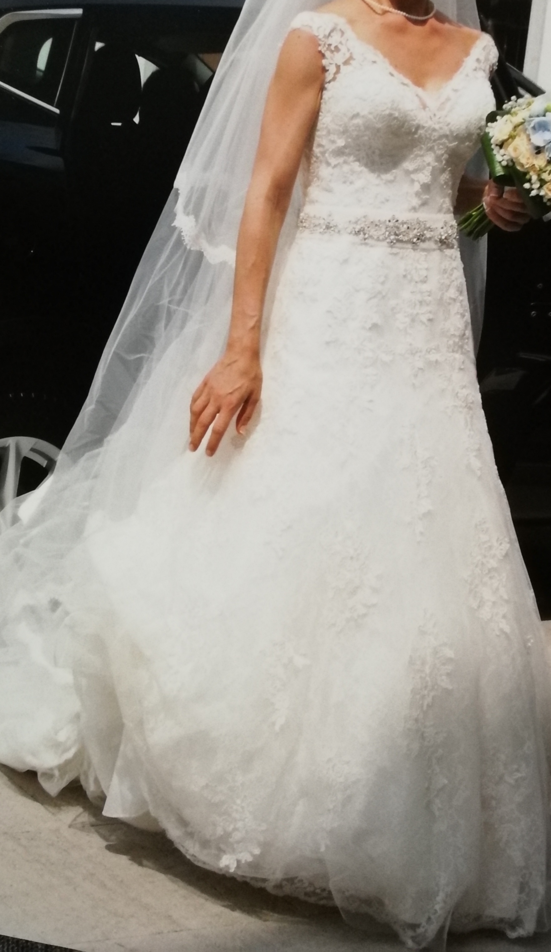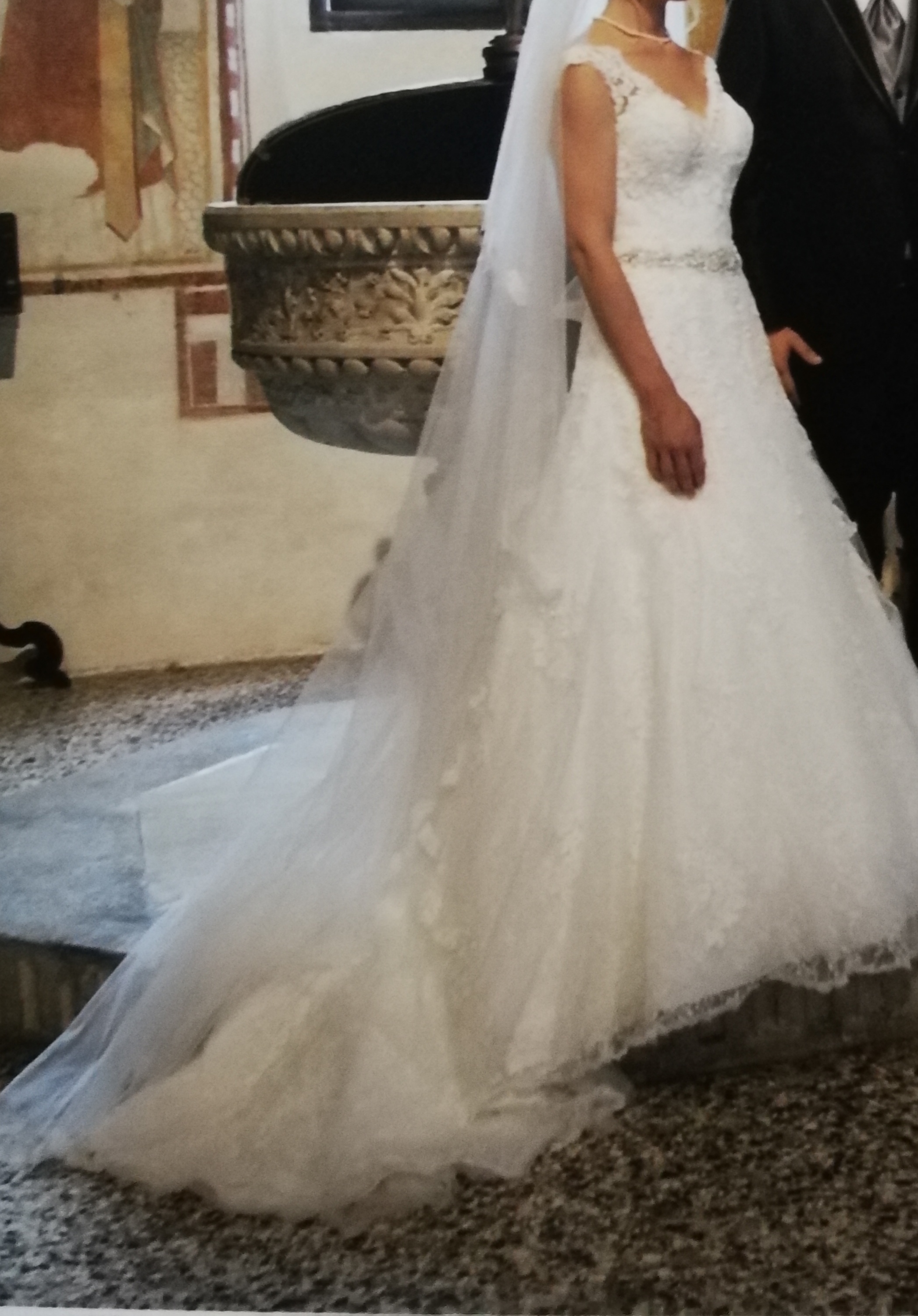 Vendo abito da sposa cosmobella taglia 40/42 in pizzo su tulle con cintura con Swarovski e velo e cuscinetto porta fedi