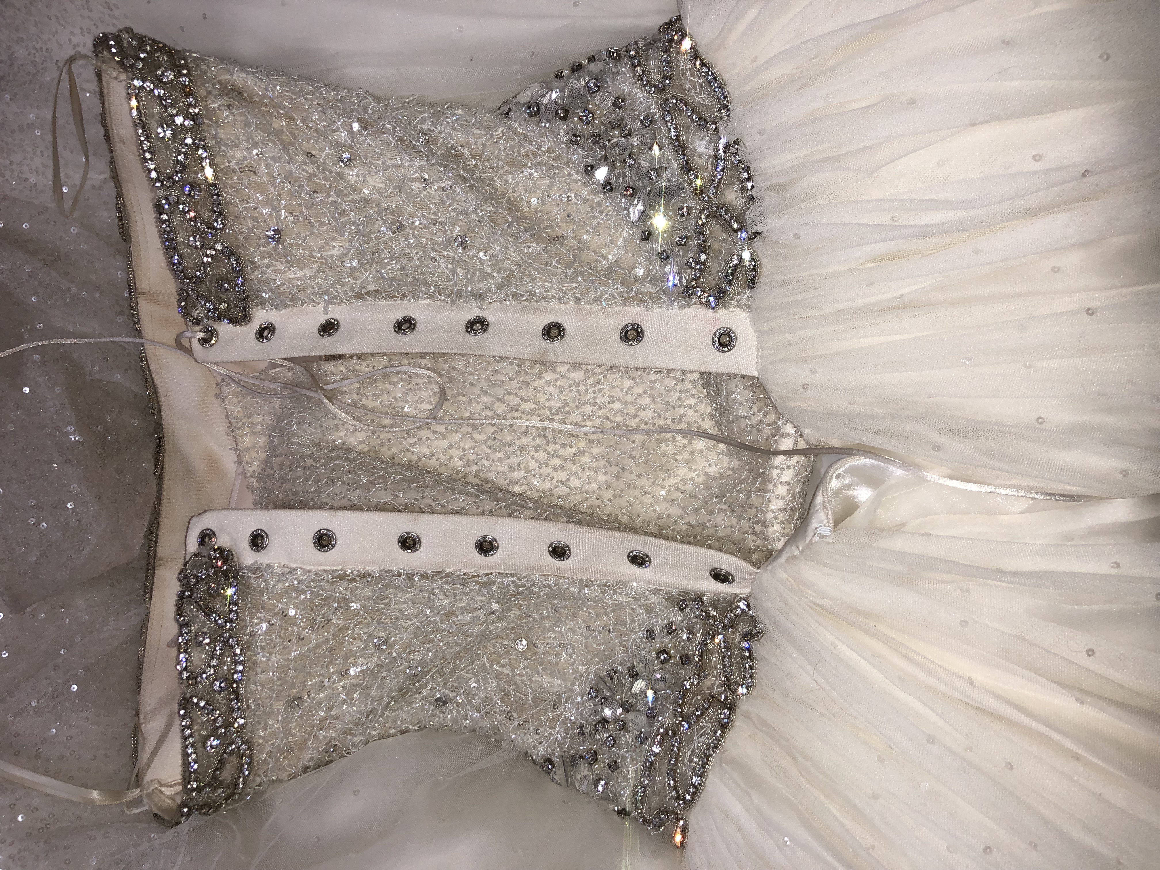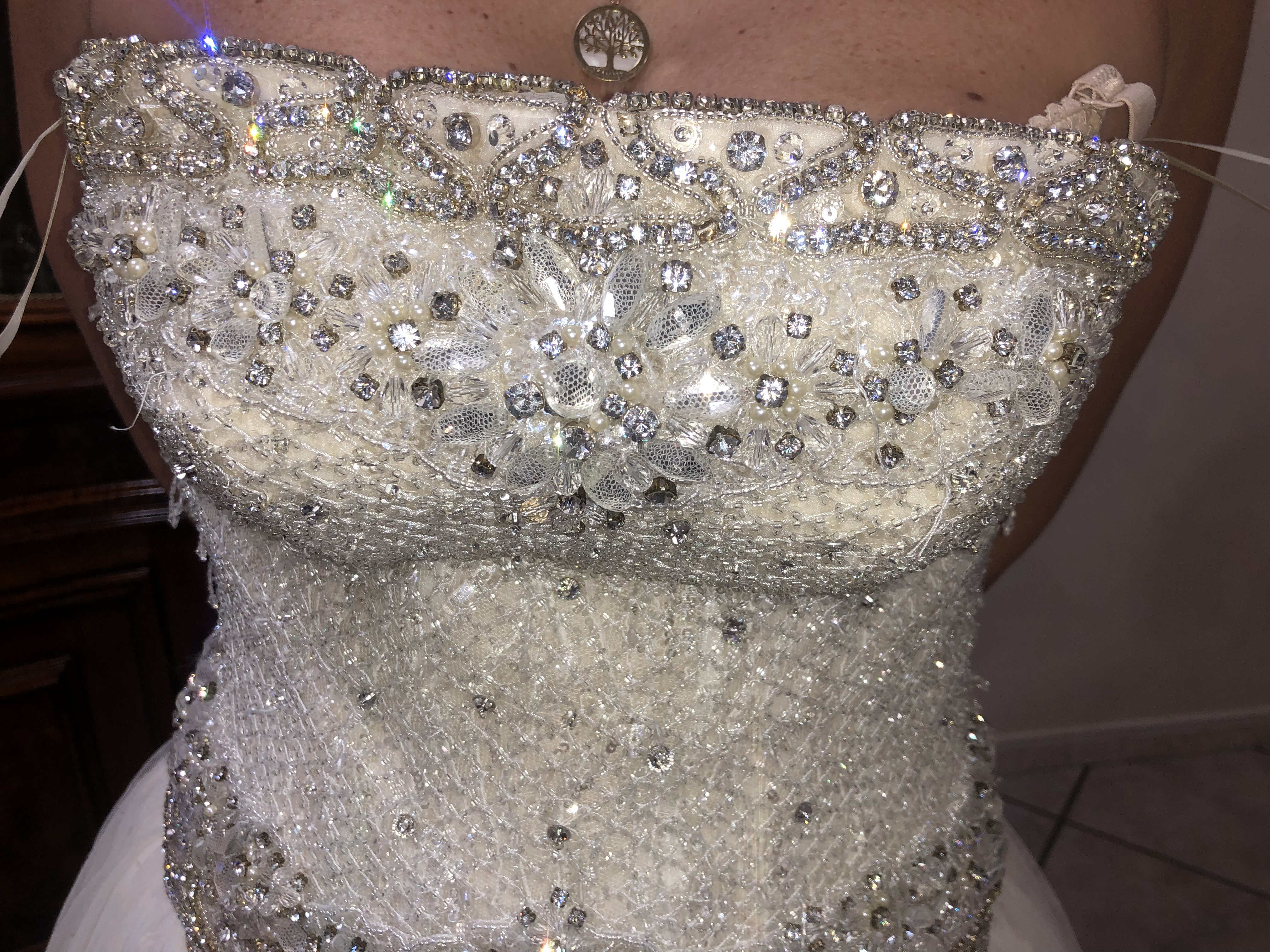Abito Da Sposa Dive E Dame taglia 44 realizzato completamente a mano con corpetto in vere perle e Swarovski puri originali come si evidenzia dalle foto con organza merletto in un unico esemplare. Prezzo TRATTABILE Per qualsiasi info contattatemi.