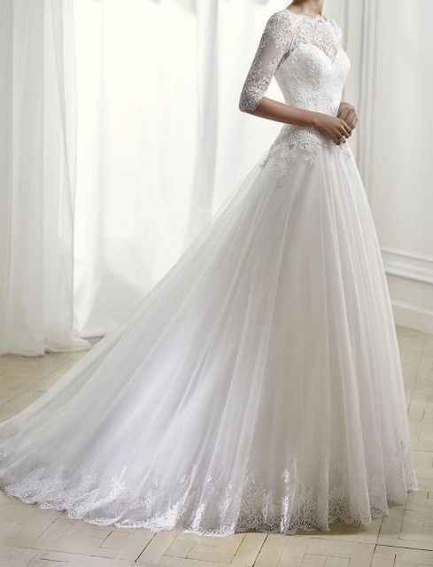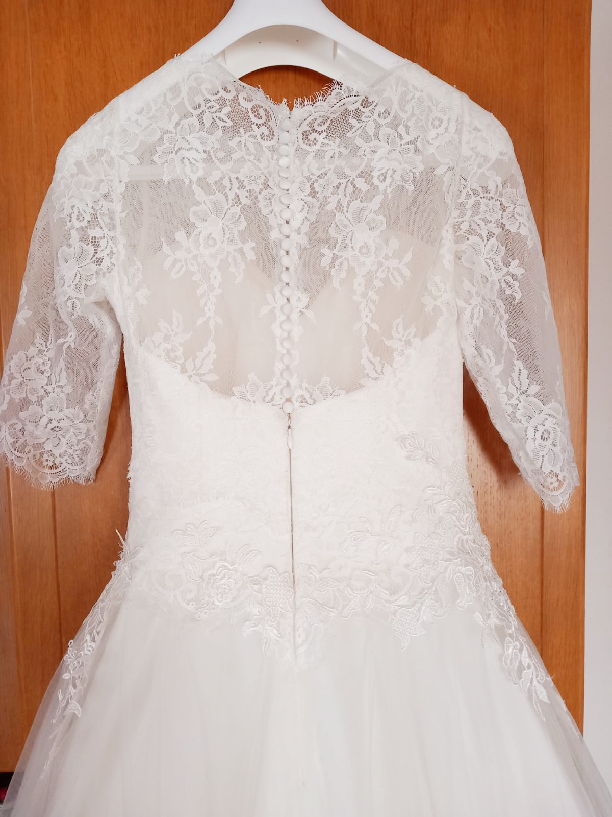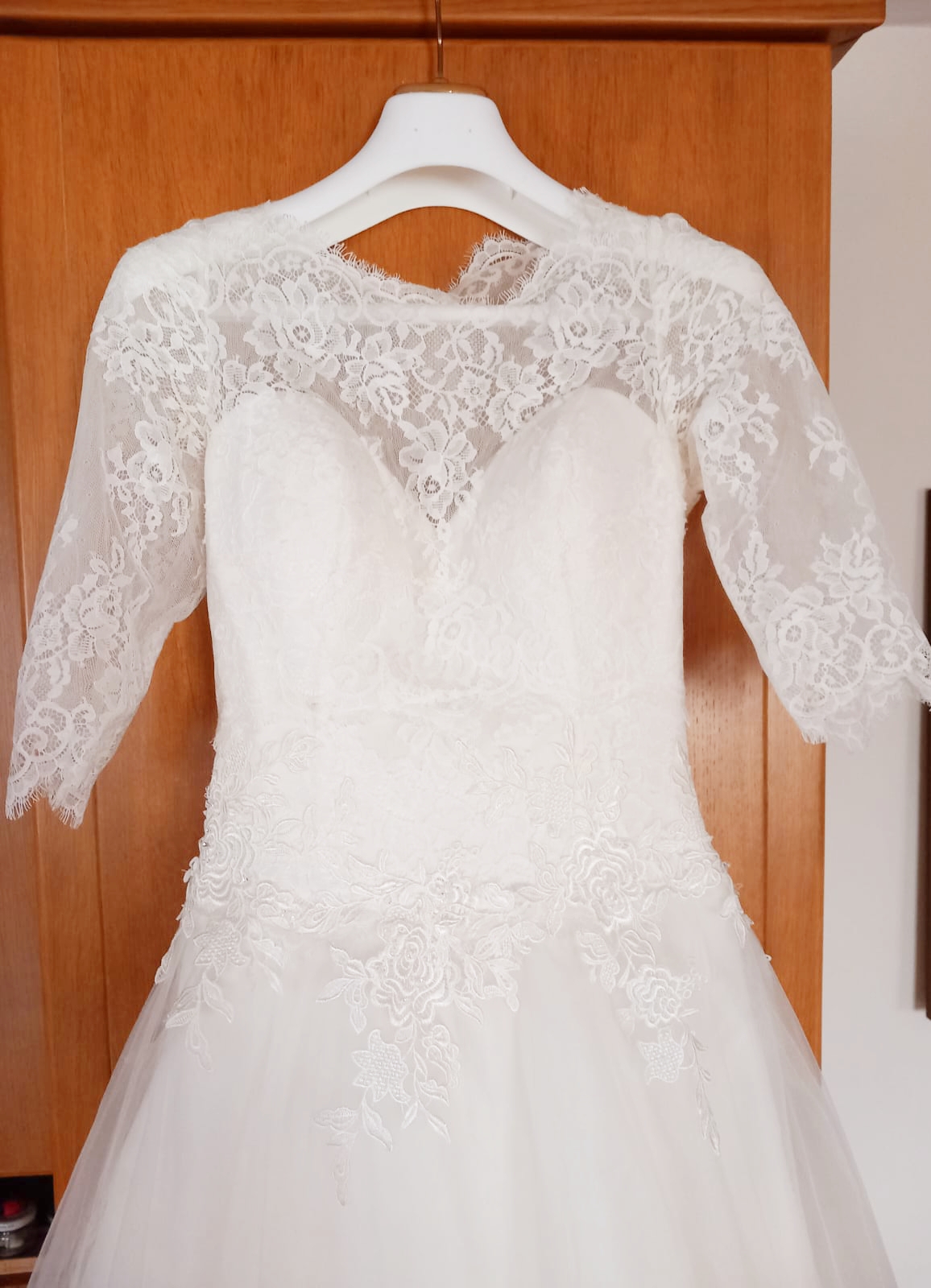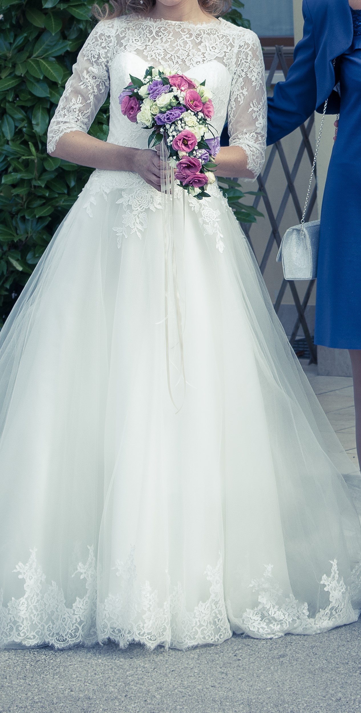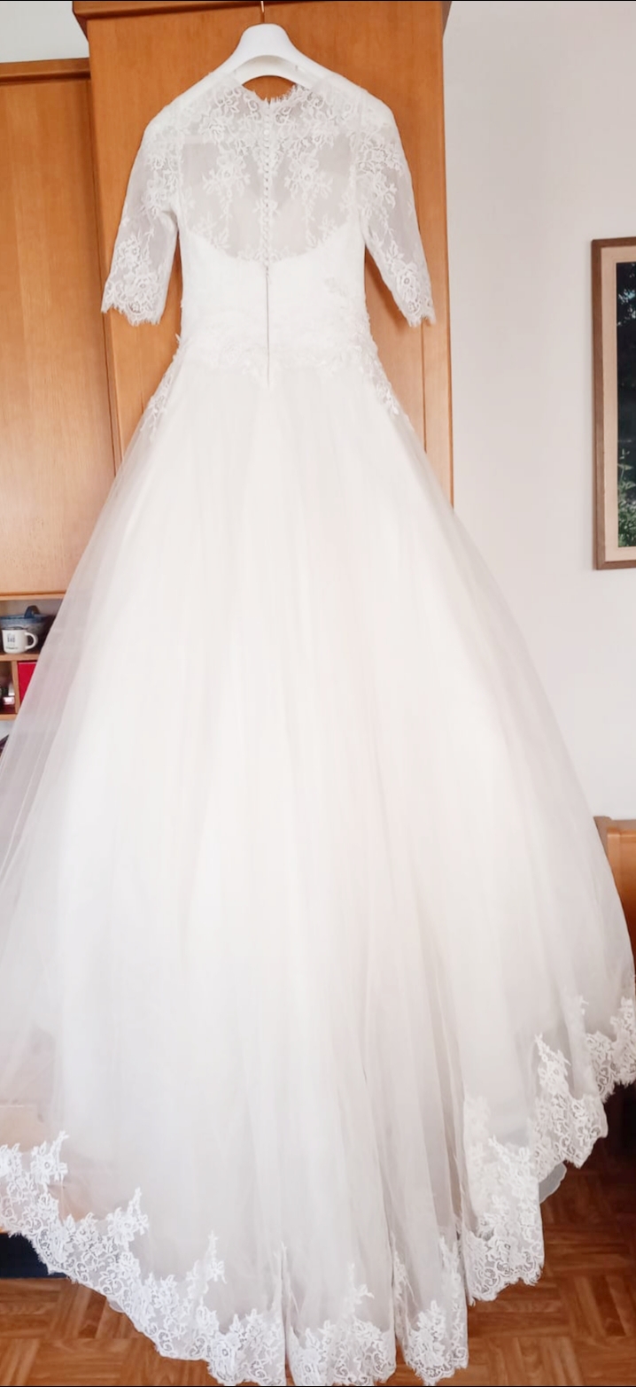 Abito da sposa della marca Divina sposa. Gonna in chiffon, corpetto con intreccio ad uncinetto, scollo a barca e manica a 3/4 quarti, chiusura del corpetto dietro con bottoni. Come taglia ho segnato 40 ma sono disponibile per fornire tutte le misure. Io sono alta 1,63 cm e peso 52 Kg (per regolarsi sull’abito).