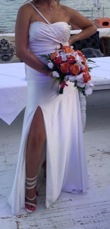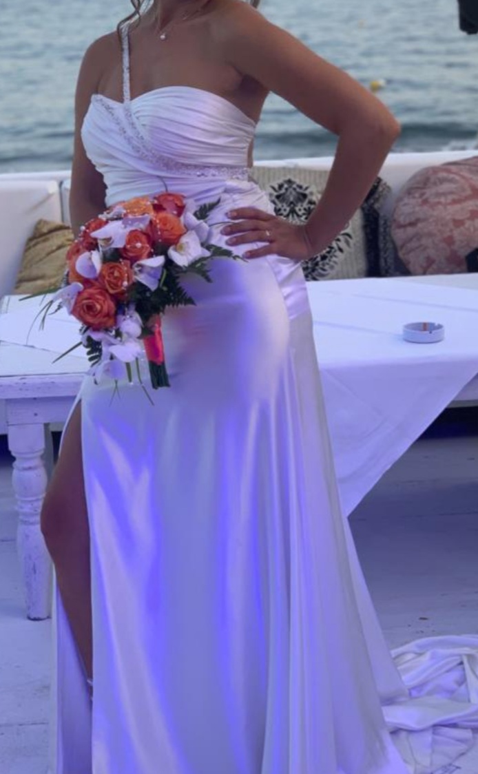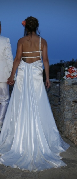 Abito completamente in raso,spacco laterale, schiena scoperta con fili di perline, coda arricciata e strascico, usato solo 3 ore,nella custodia originale.